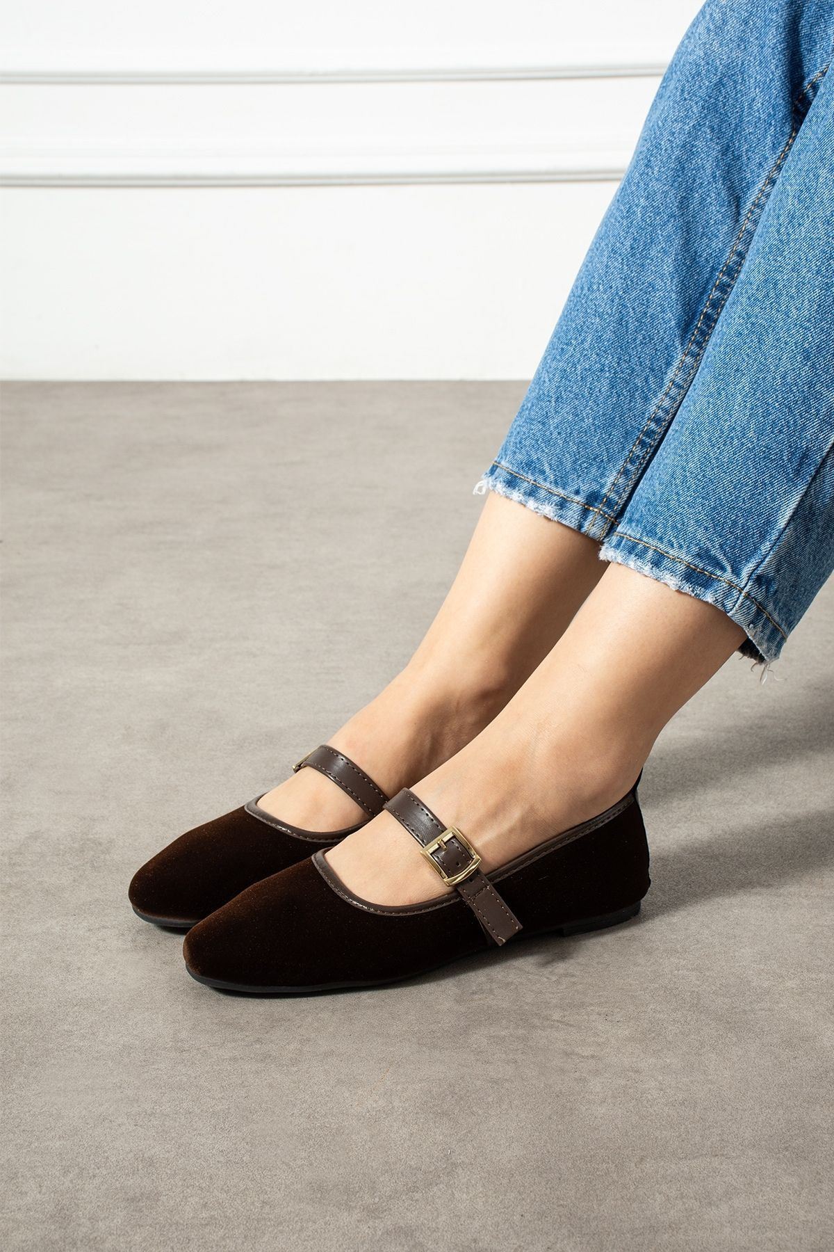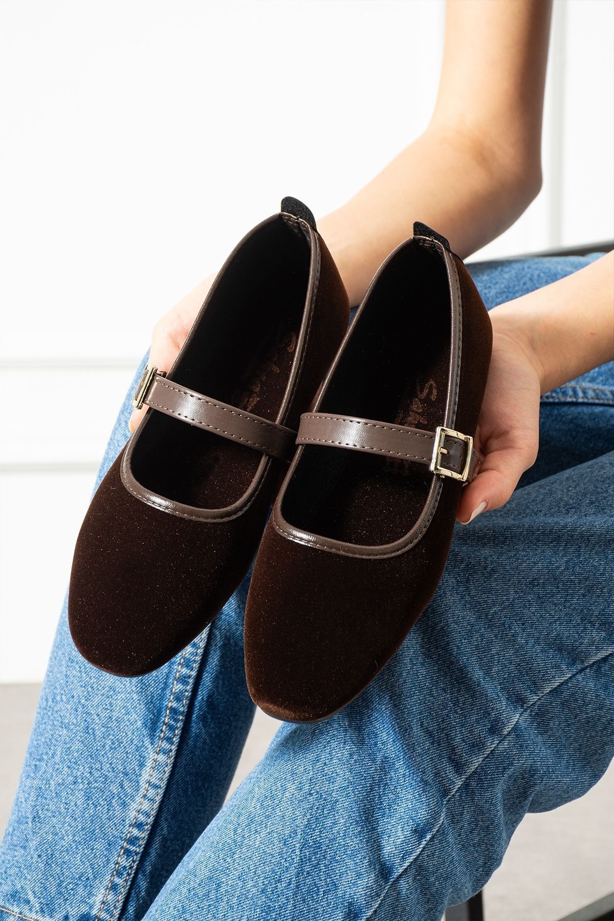 Bellina Kahverengi Bantlı Gold Tokalı Kadife Dokulu Elegant Hafif Ev Babeti