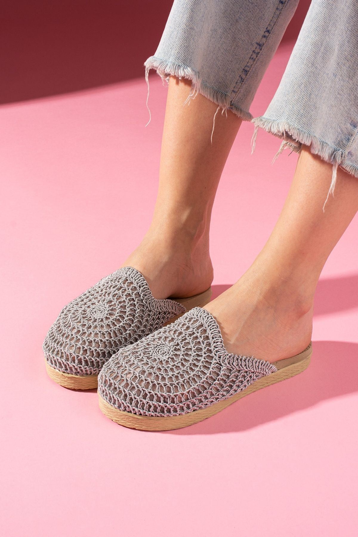 Ottawa Gri Dairesel Hasır İşlemeli Önü Kapalı Terlik