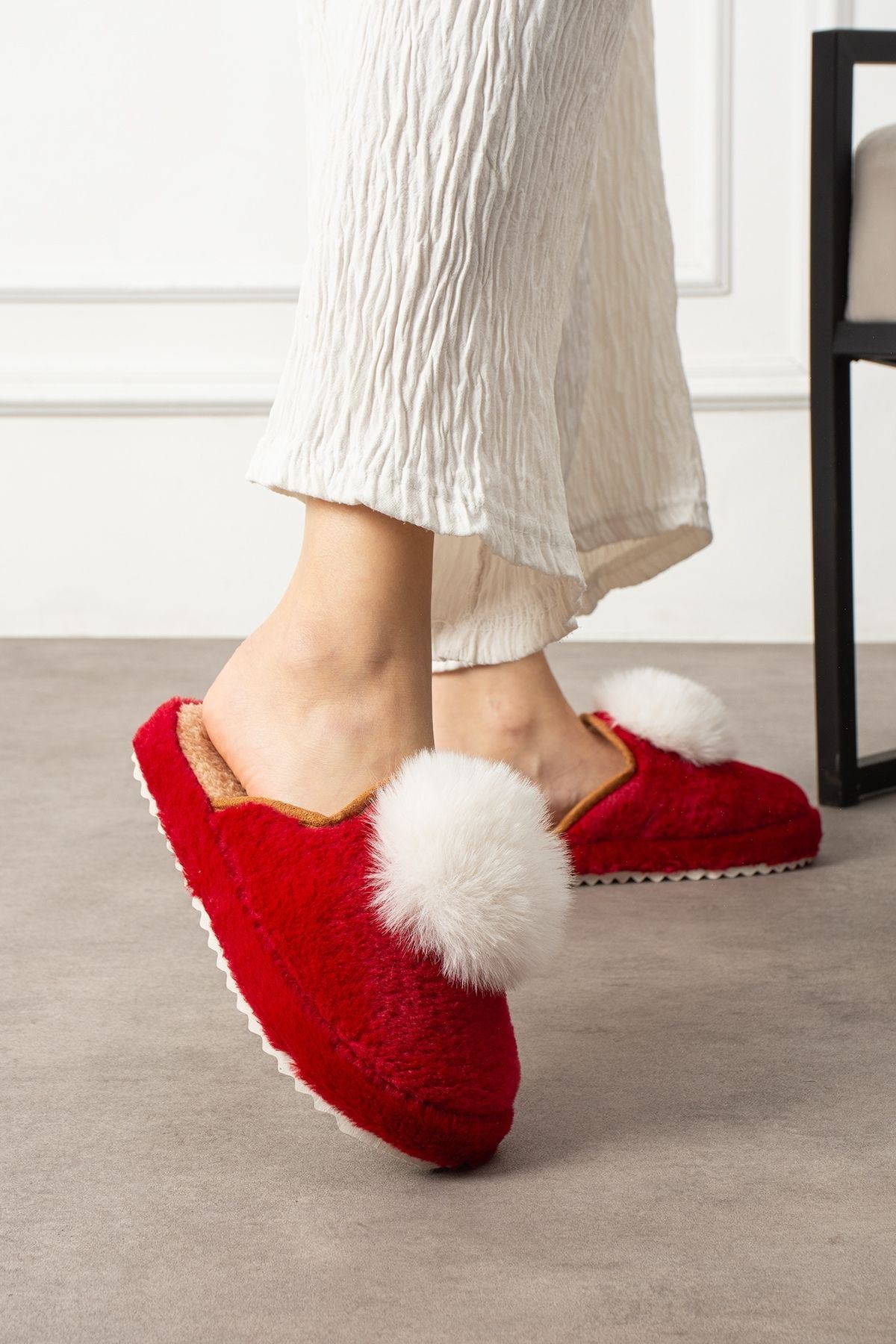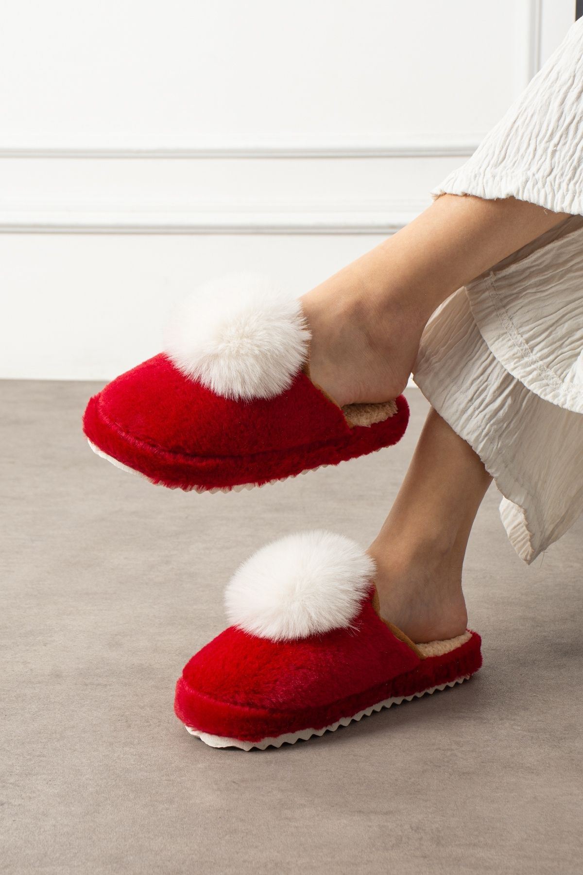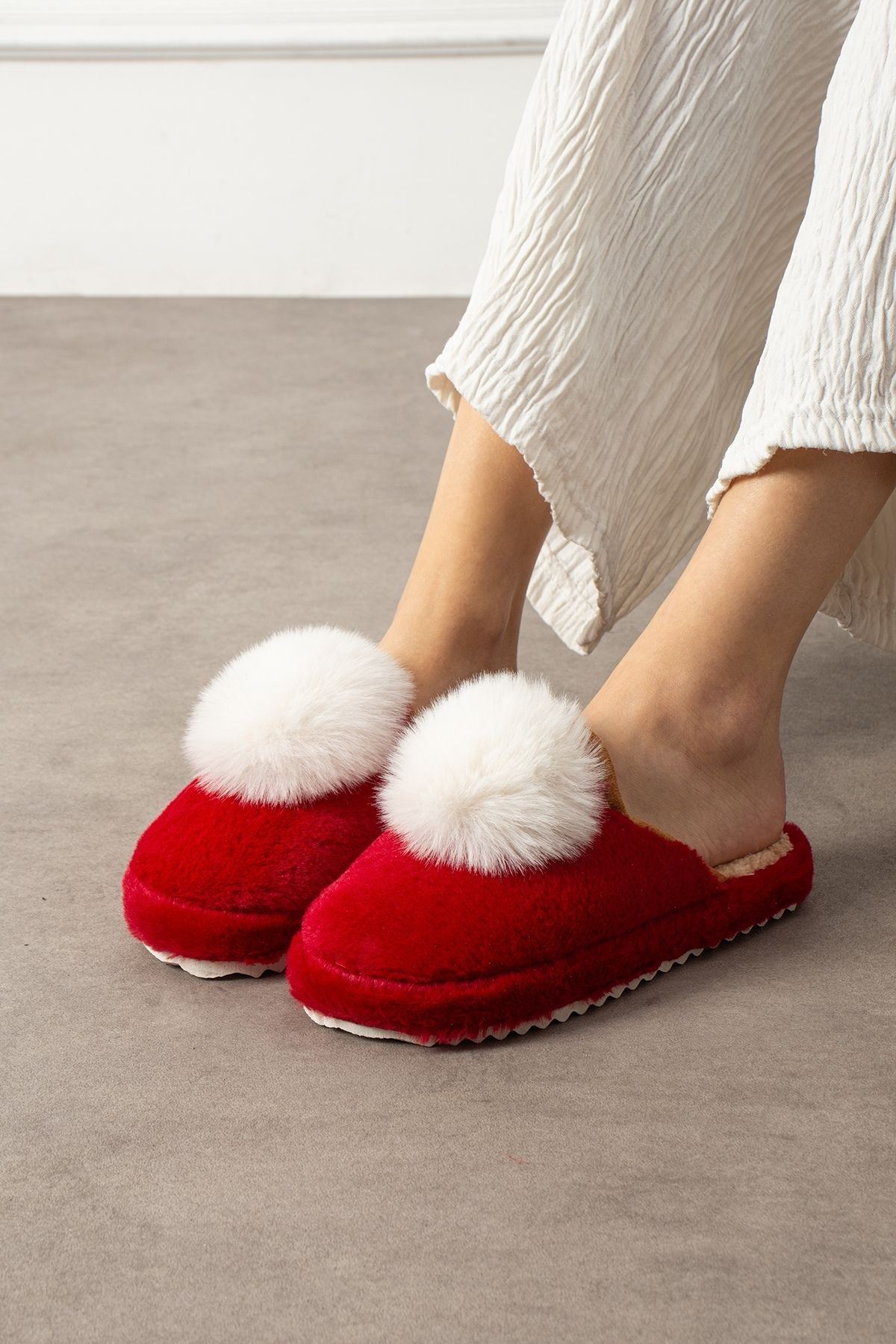 Poffina Kırmızı Beyaz Ponponlu Saraç Detaylı Sessiz Taban Ev Terliği