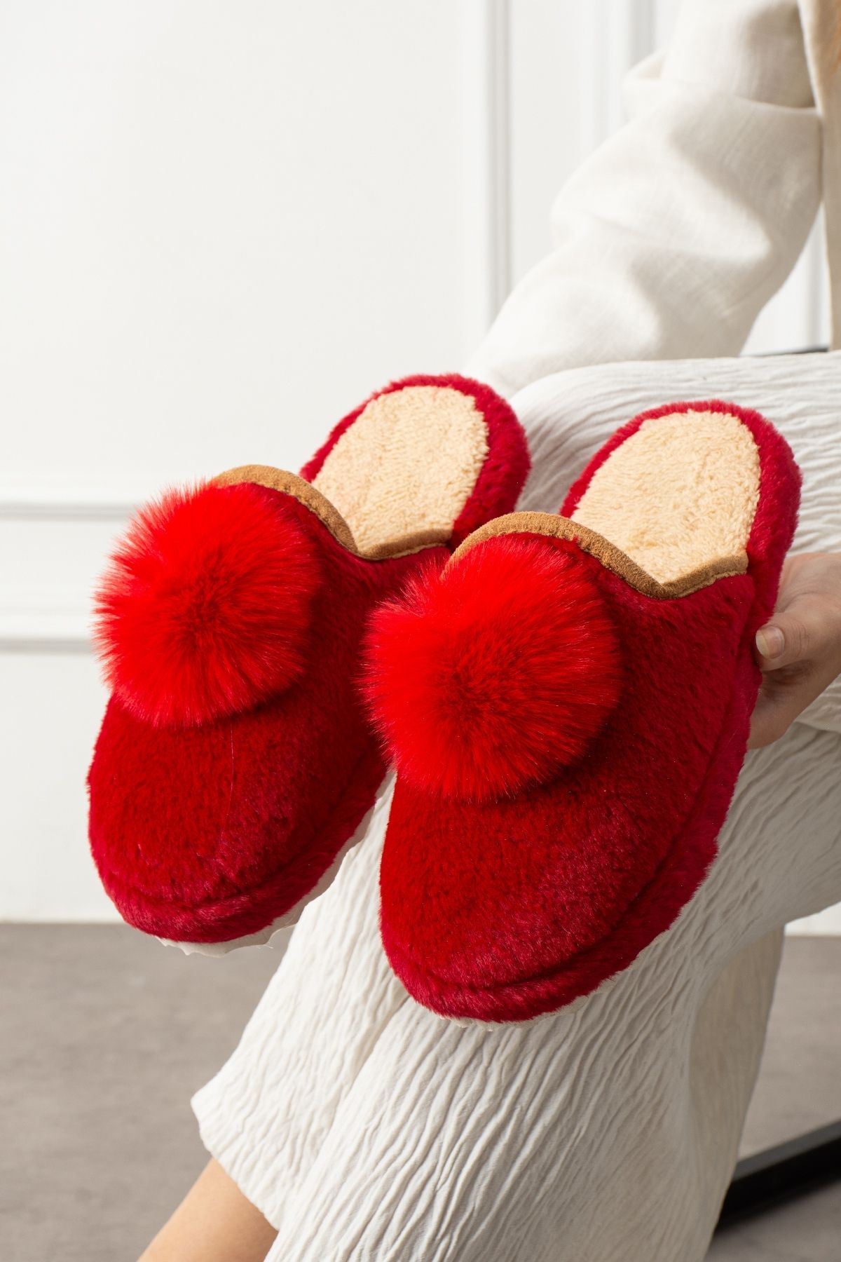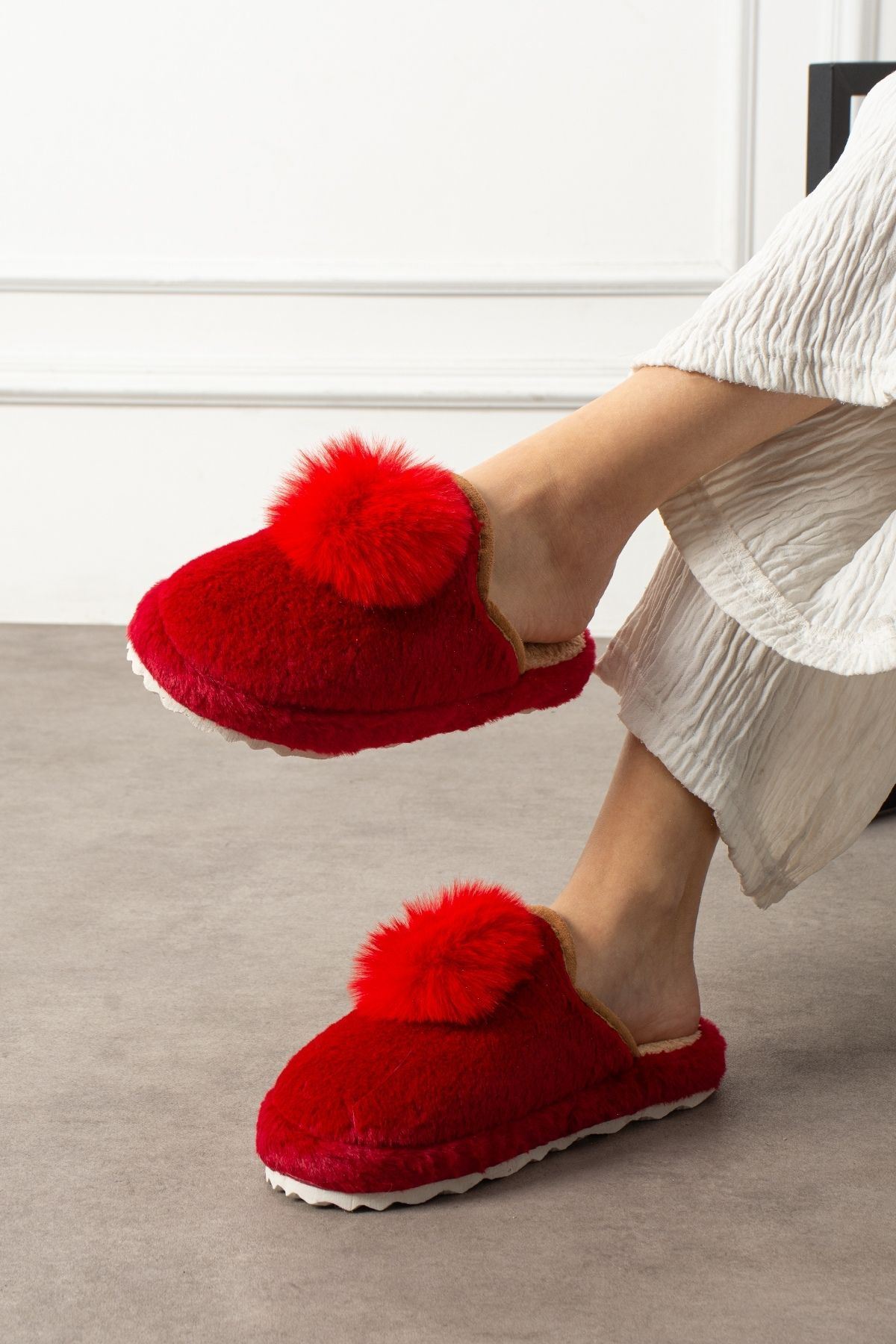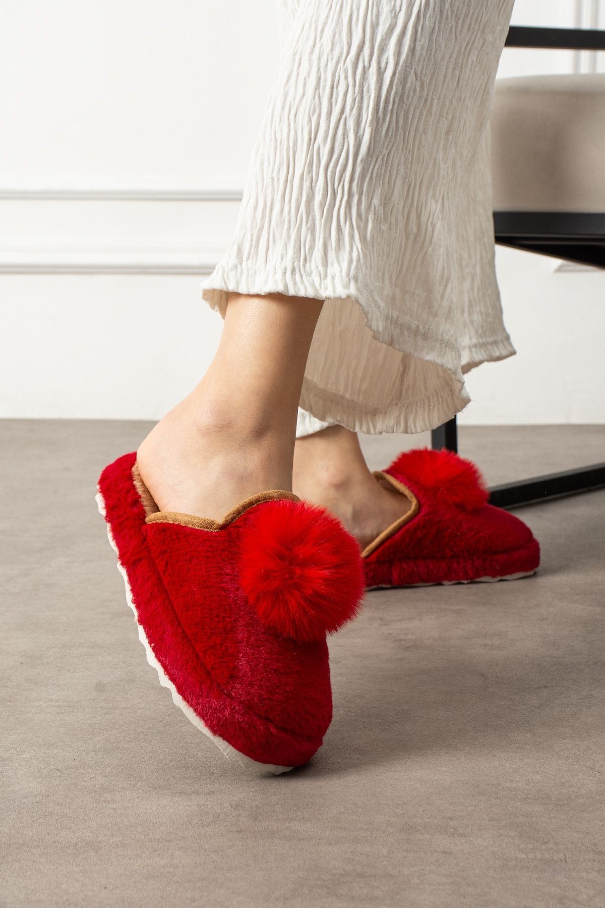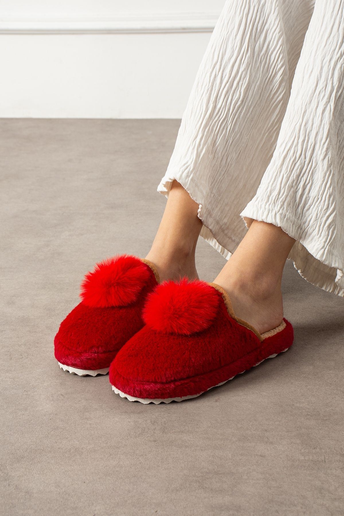 Poffina Kırmızı Ponponlu Saraç Detaylı Sessiz Taban Ev Terliği