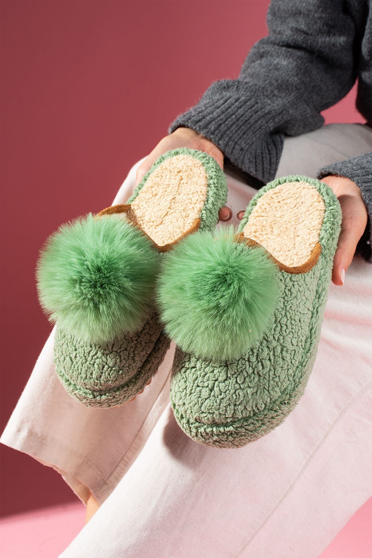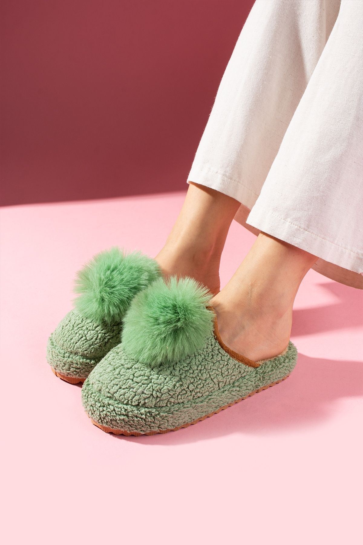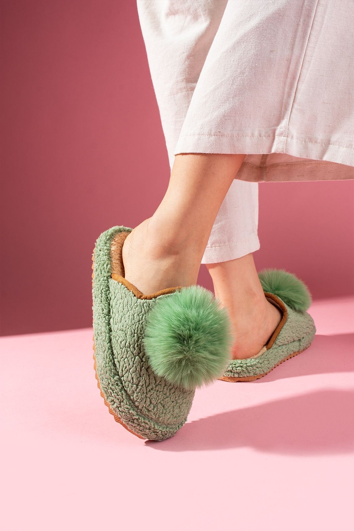 Poffina Mint Yeşili Ponponlu Saraç Detaylı Sessiz Taban Ev Terliği