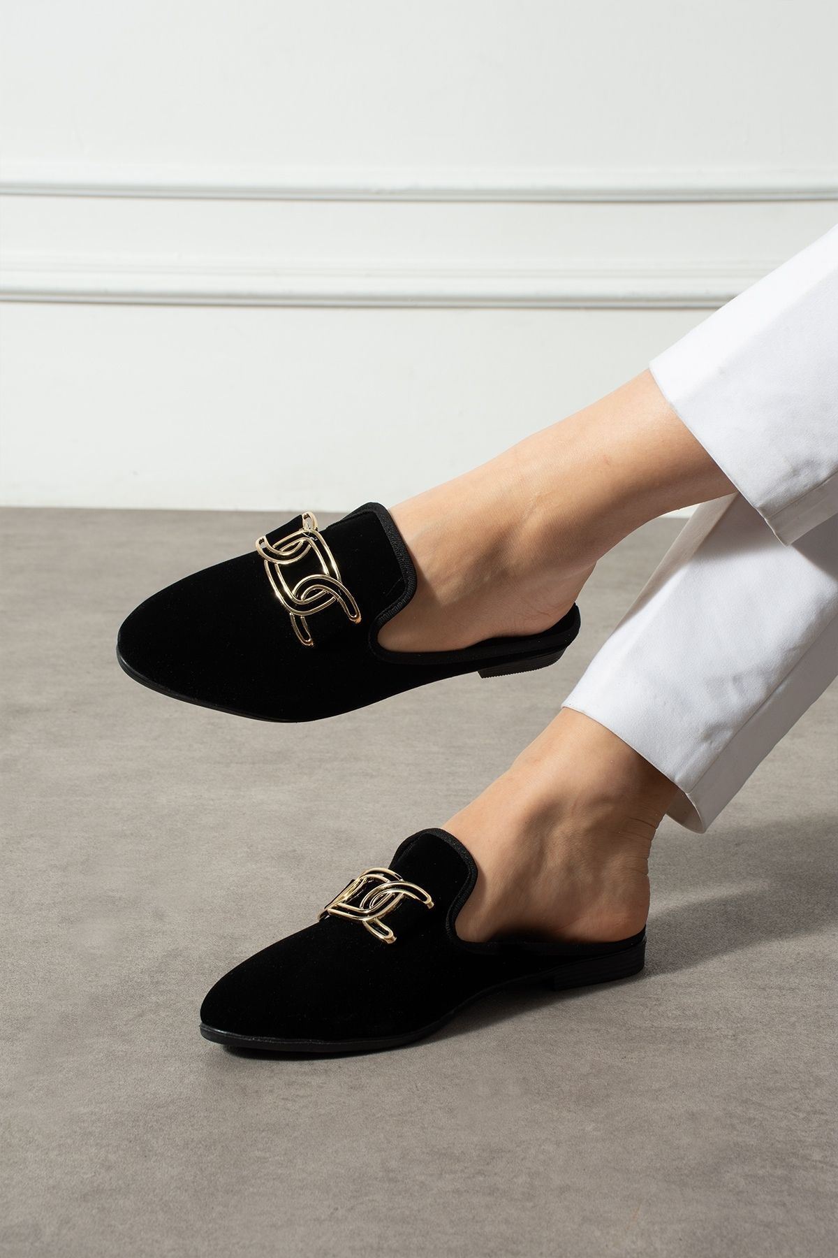 Alora Siyah Gold Tokalı Kadife Dokulu Elegant Nişan Çeyiz Bohça Misafir Ev Terliği