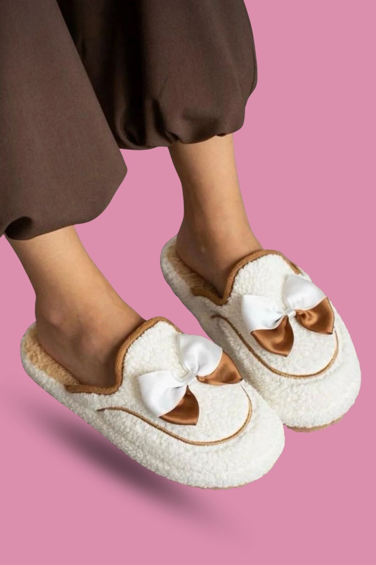 Papy Beyaz-Pembe Papyonlu Karakter Nakışlı Peluş Kadın Sessiz Tabanlı Ev Terliği