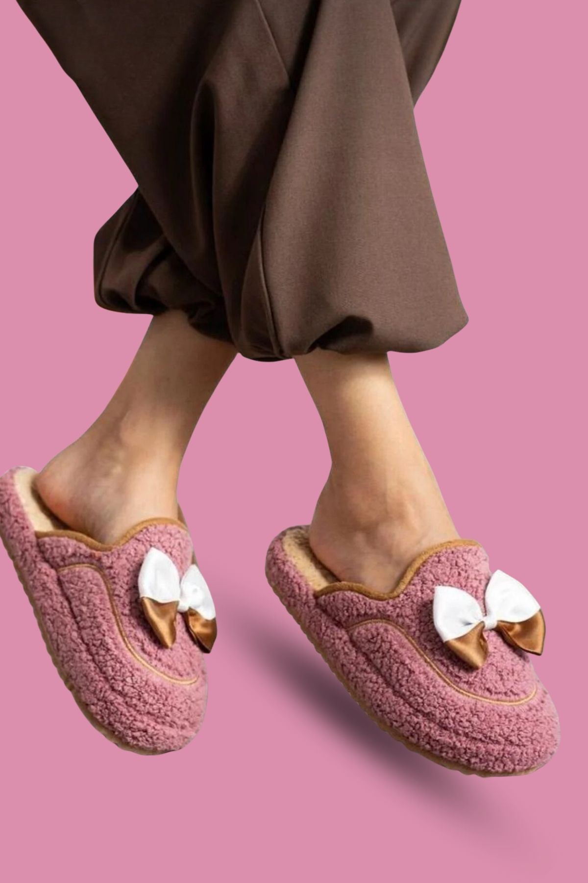 Papy Pudra Papyonlu Karakter Nakışlı Peluş Kadın Sessiz Tabanlı Ev Terliği