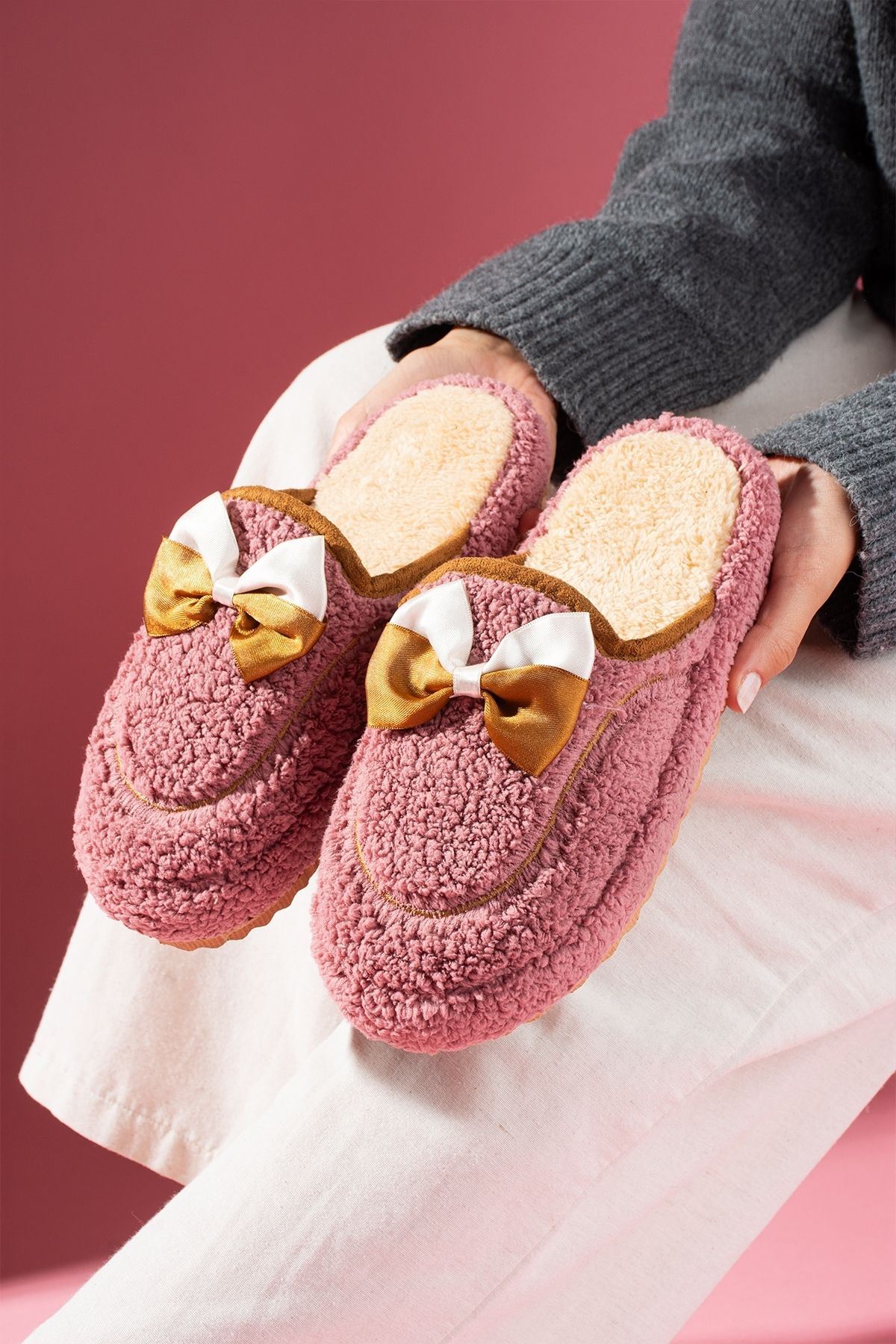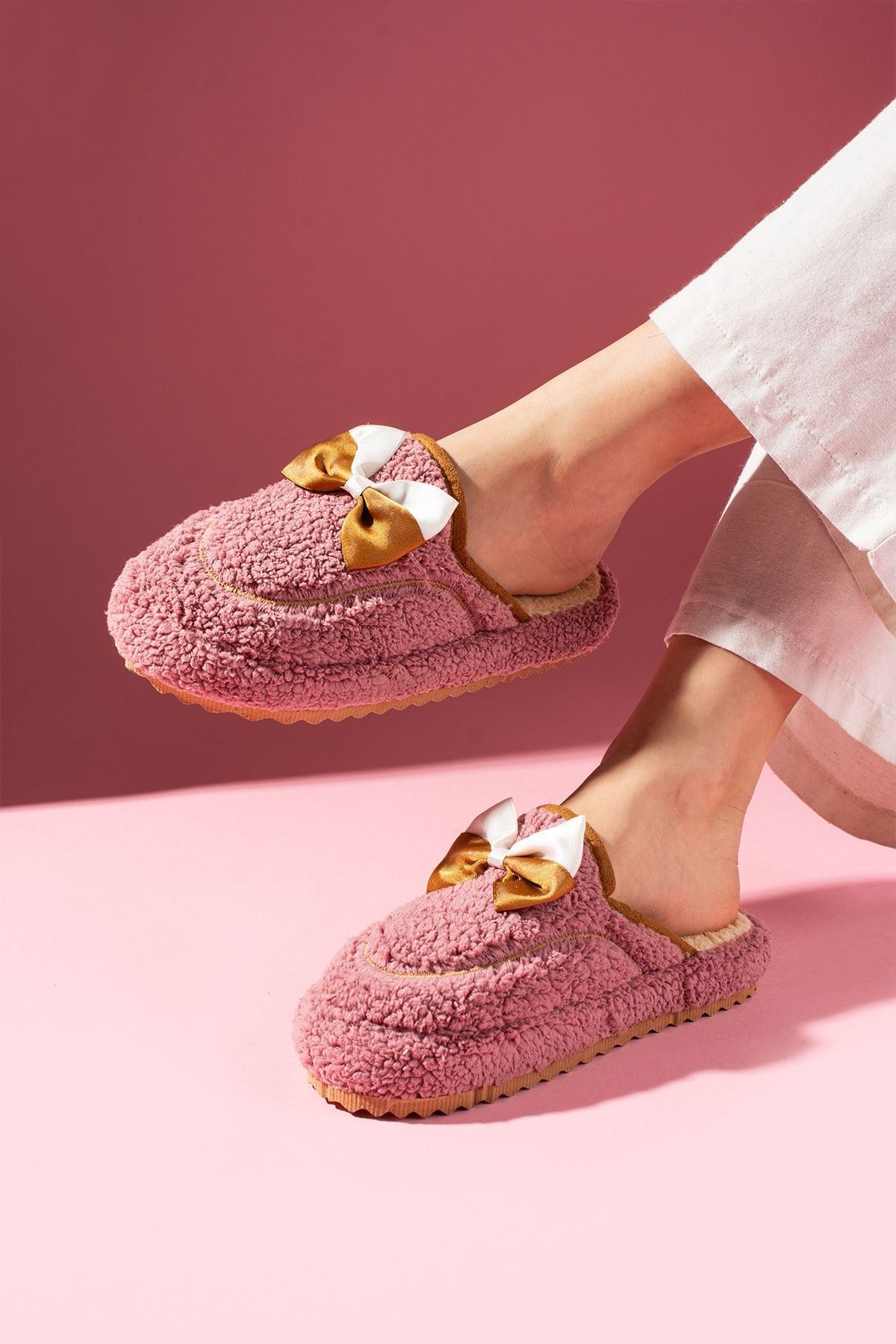 Curry Pembe Fiyonklu Saraç Detaylı Sessiz Taban Ev Terliği