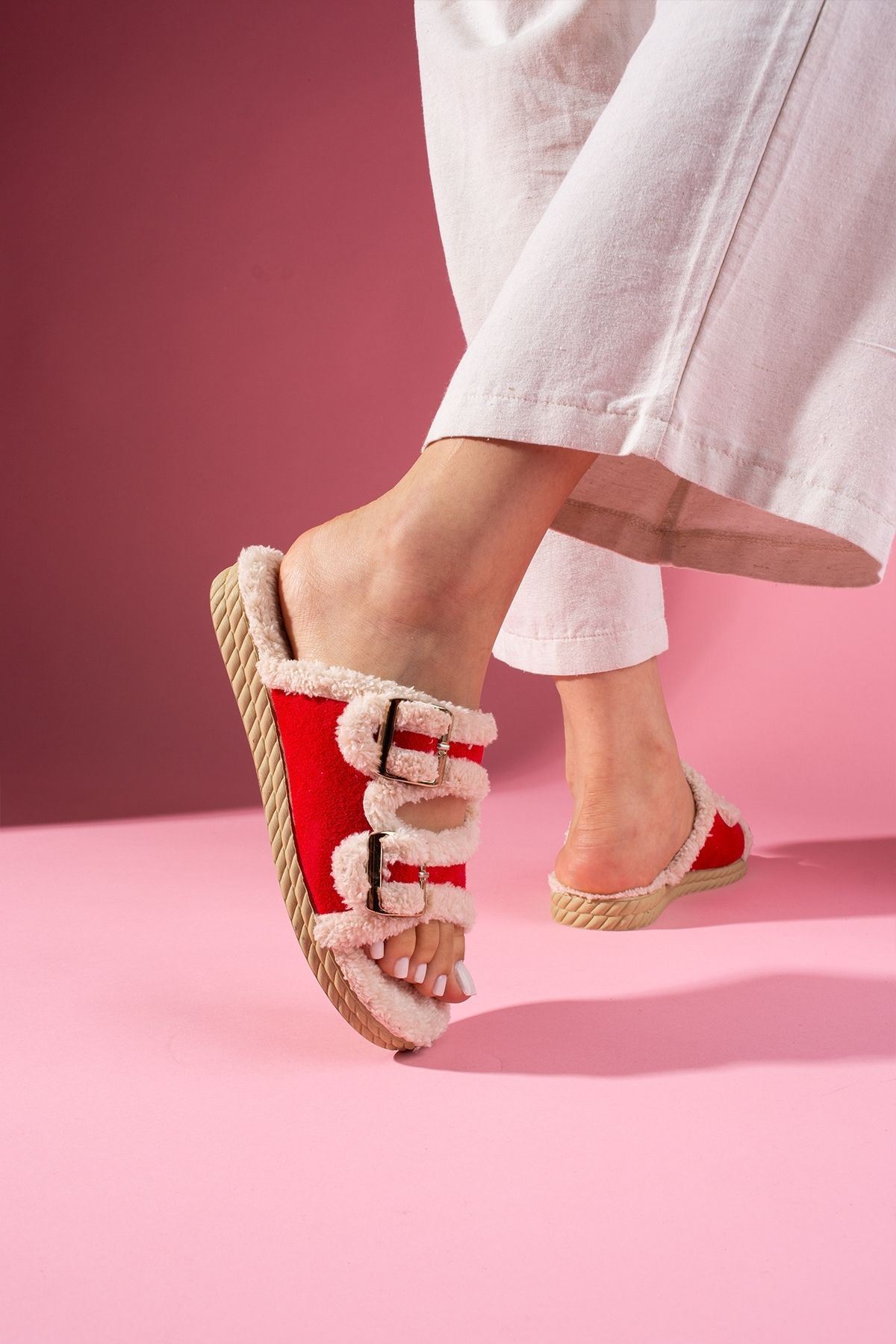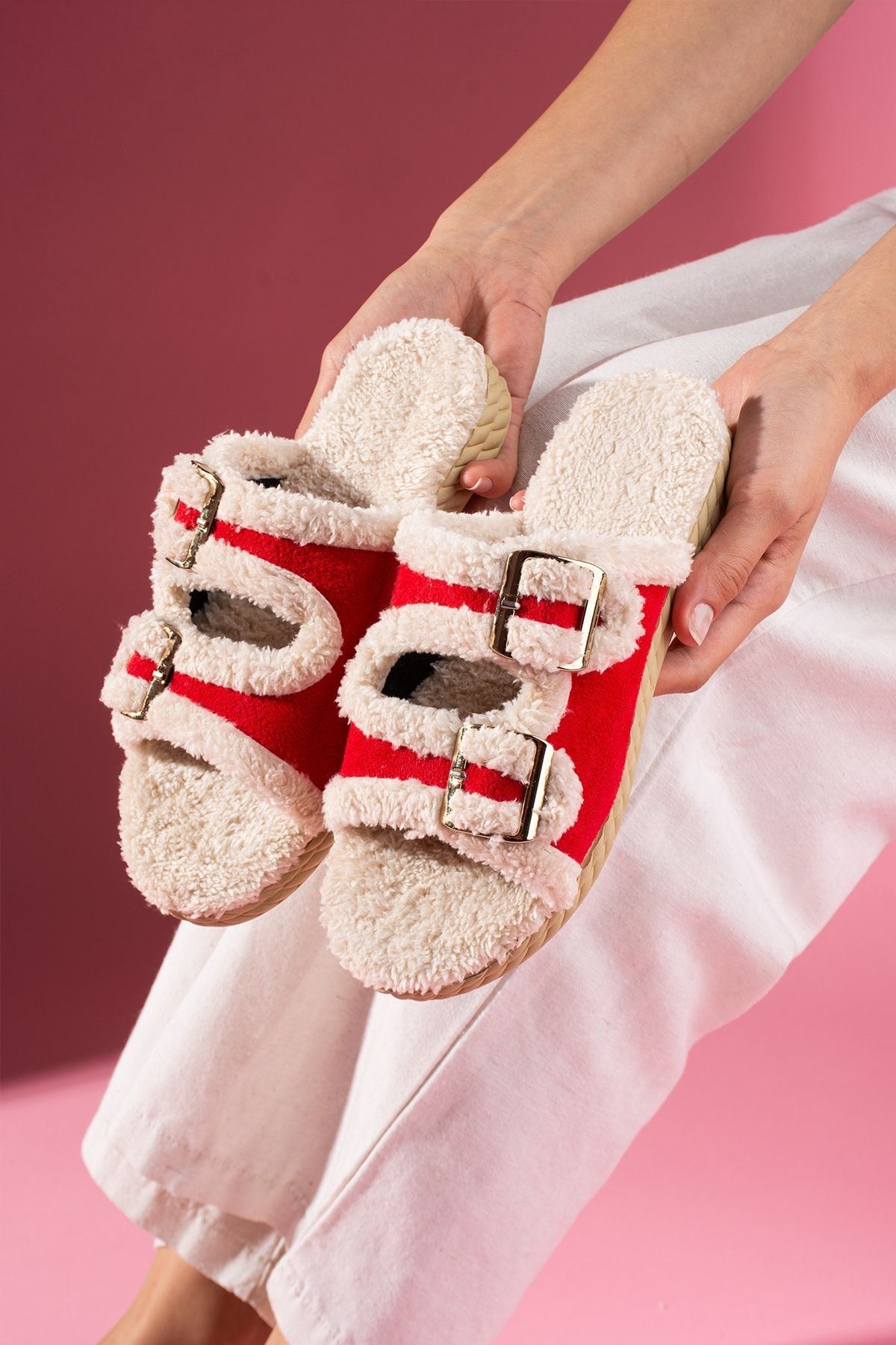Damy Kırmızı Tokalı Çift Bantlı Peluş Detaylı Kadın Ev Terliği