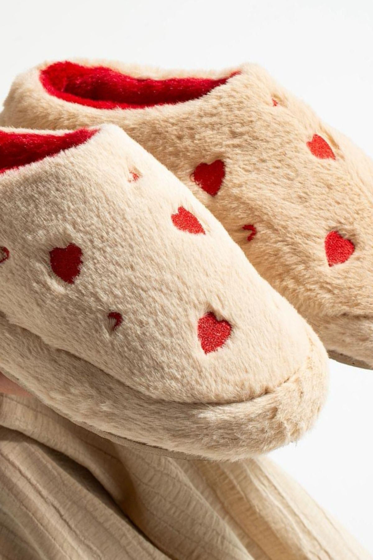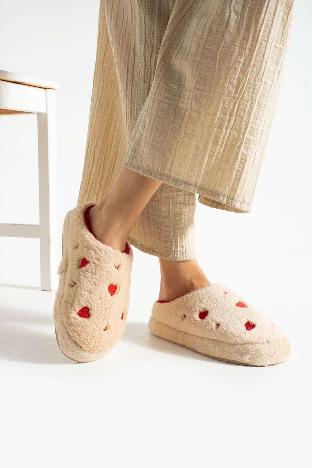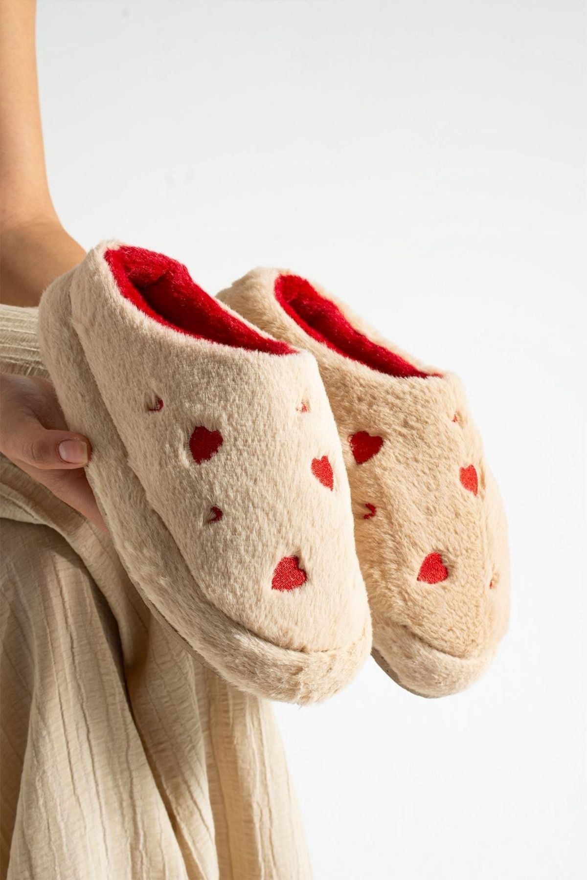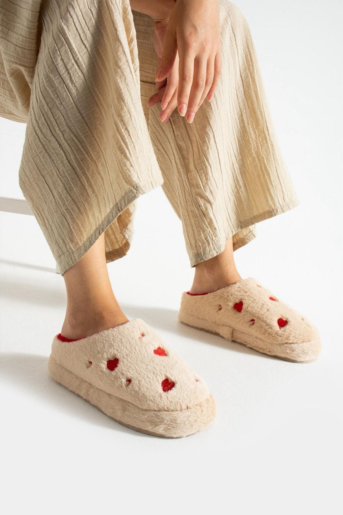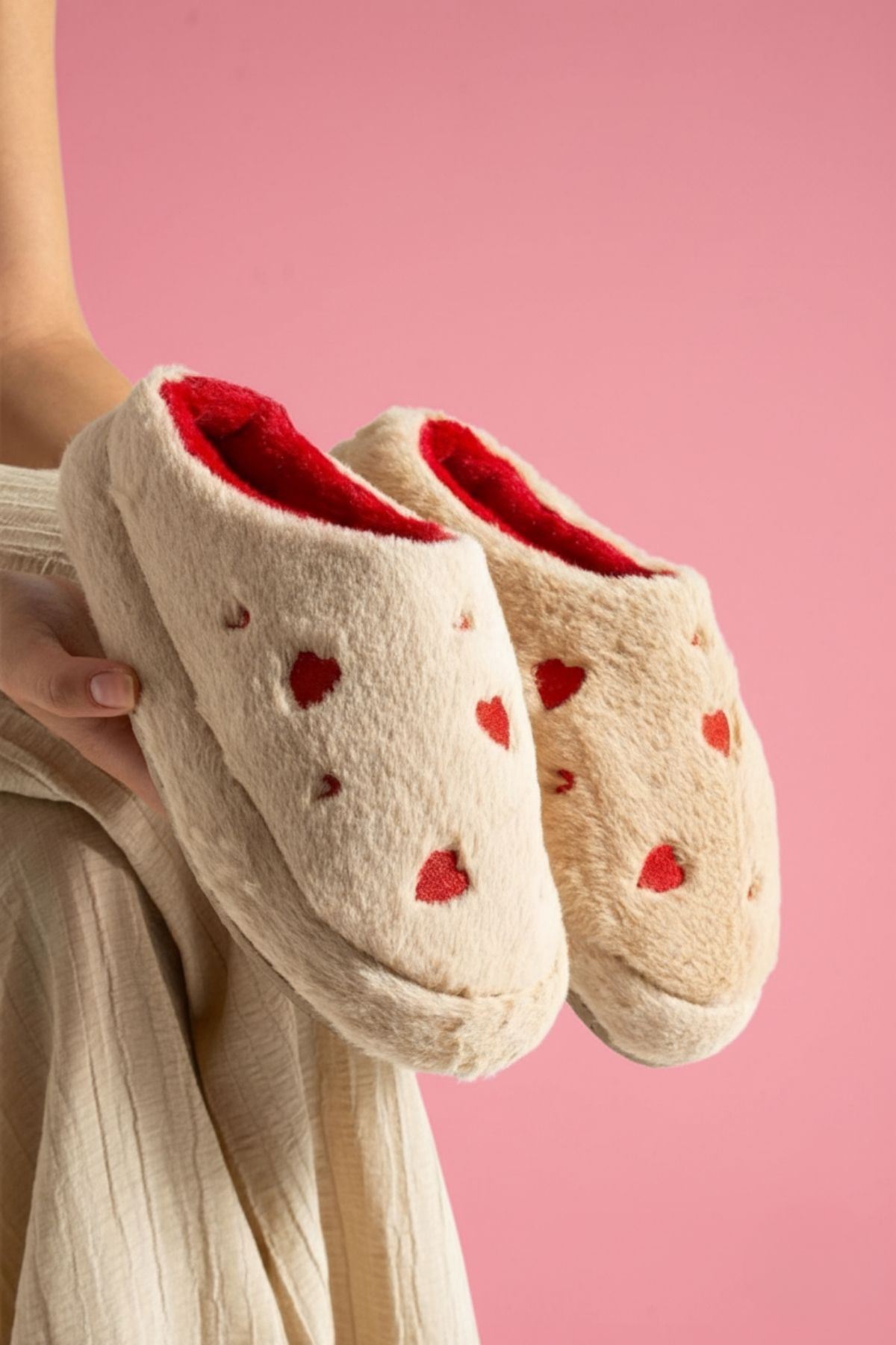 Hartin Bej Kalp Nakış Desenli Peluş Kadın Sessiz Taban Ev Terliği