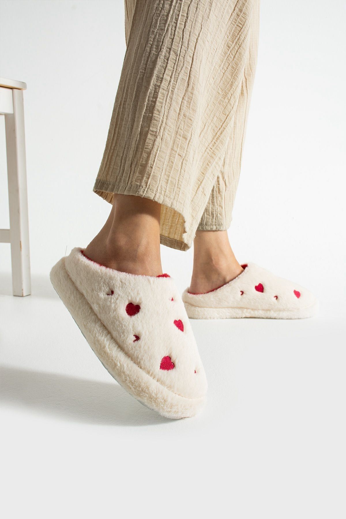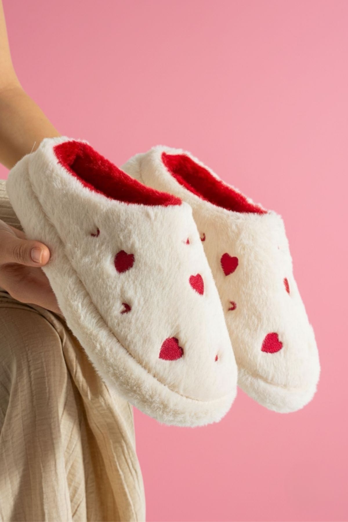 Evde aşkı ve sıcaklığı hissettiren terlik: HARTİN! Kalp desenli peluş kumaşıyla hem şık hem de eğlenceli bir görünüm sunar. İç yüzeyindeki yumuşacık astarı ve hafif EVA tabanı ile gün boyu konfor sağlar. Hem kendiniz hem sevdikleriniz için harika bir hediye seçeneği.