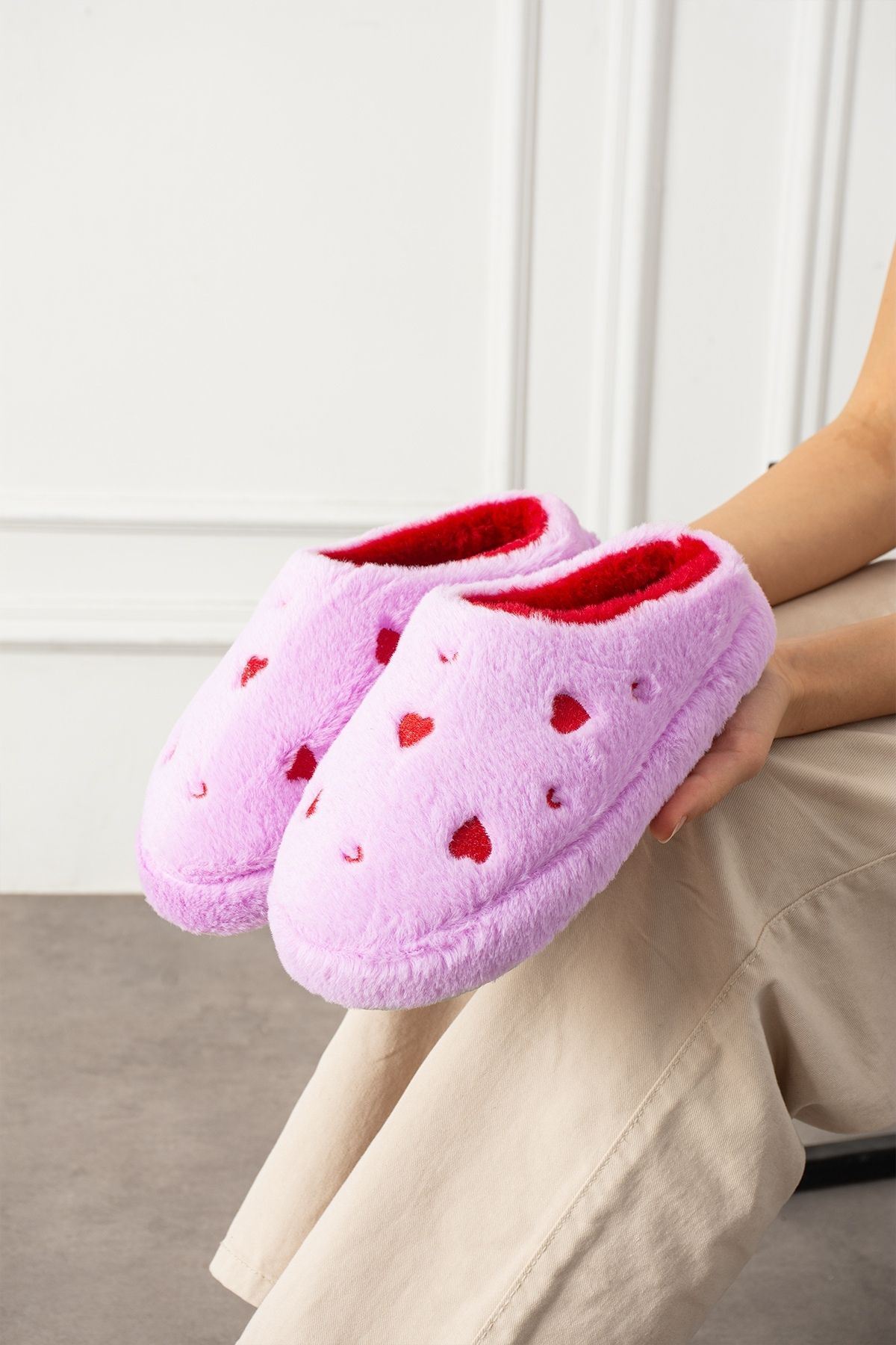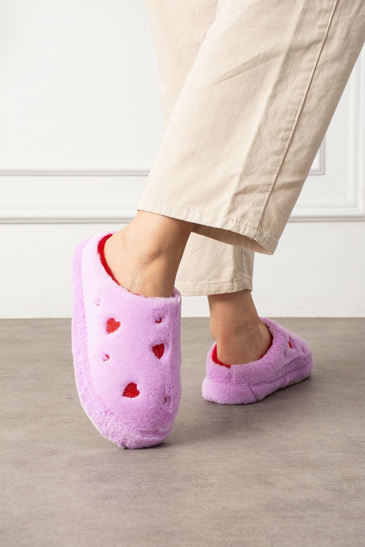 Evde aşkı ve sıcaklığı hissettiren terlik: HARTİN! Kalp desenli peluş kumaşıyla hem şık hem de eğlenceli bir görünüm sunar. İç yüzeyindeki yumuşacık astarı ve hafif EVA tabanı ile gün boyu konfor sağlar. Hem kendiniz hem sevdikleriniz için harika bir hediye seçeneği.