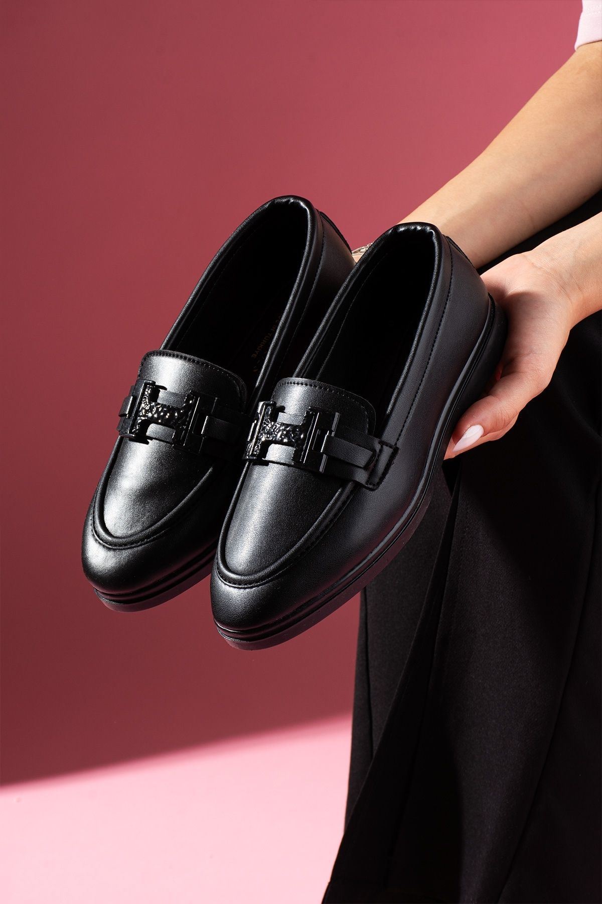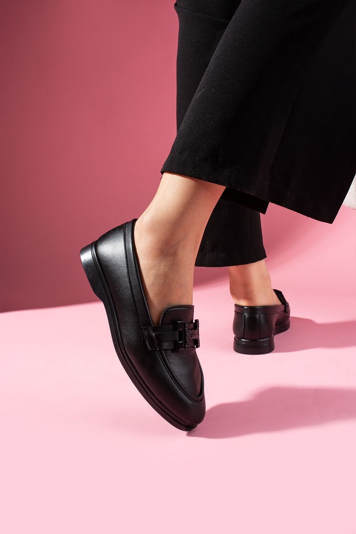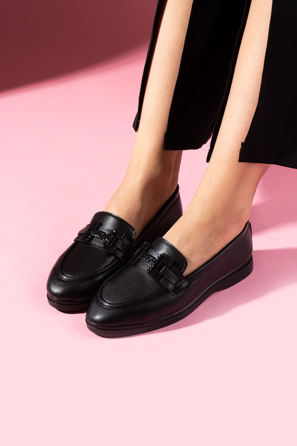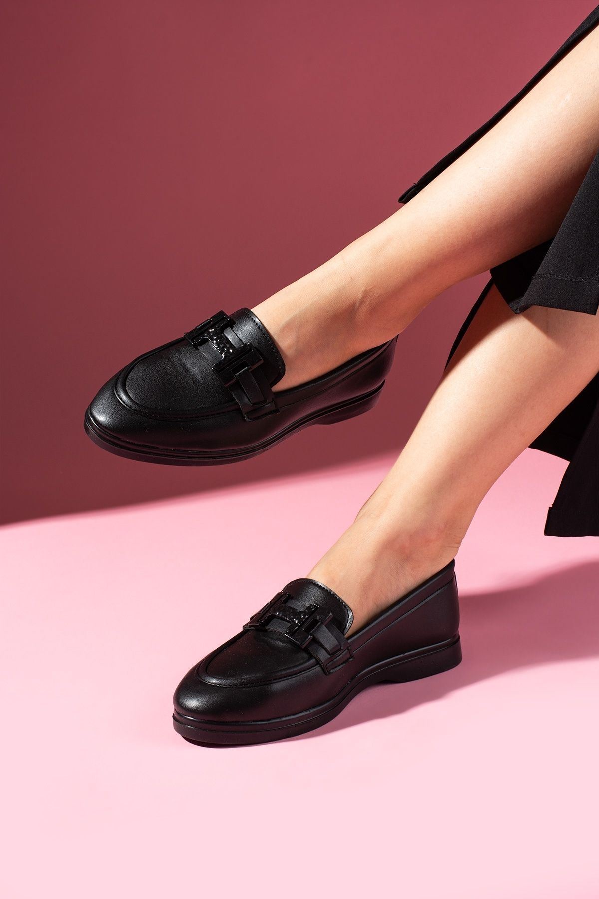 Herkon Siyah Cilt Tokalı Loafer Babet Günlük Ayakkabı