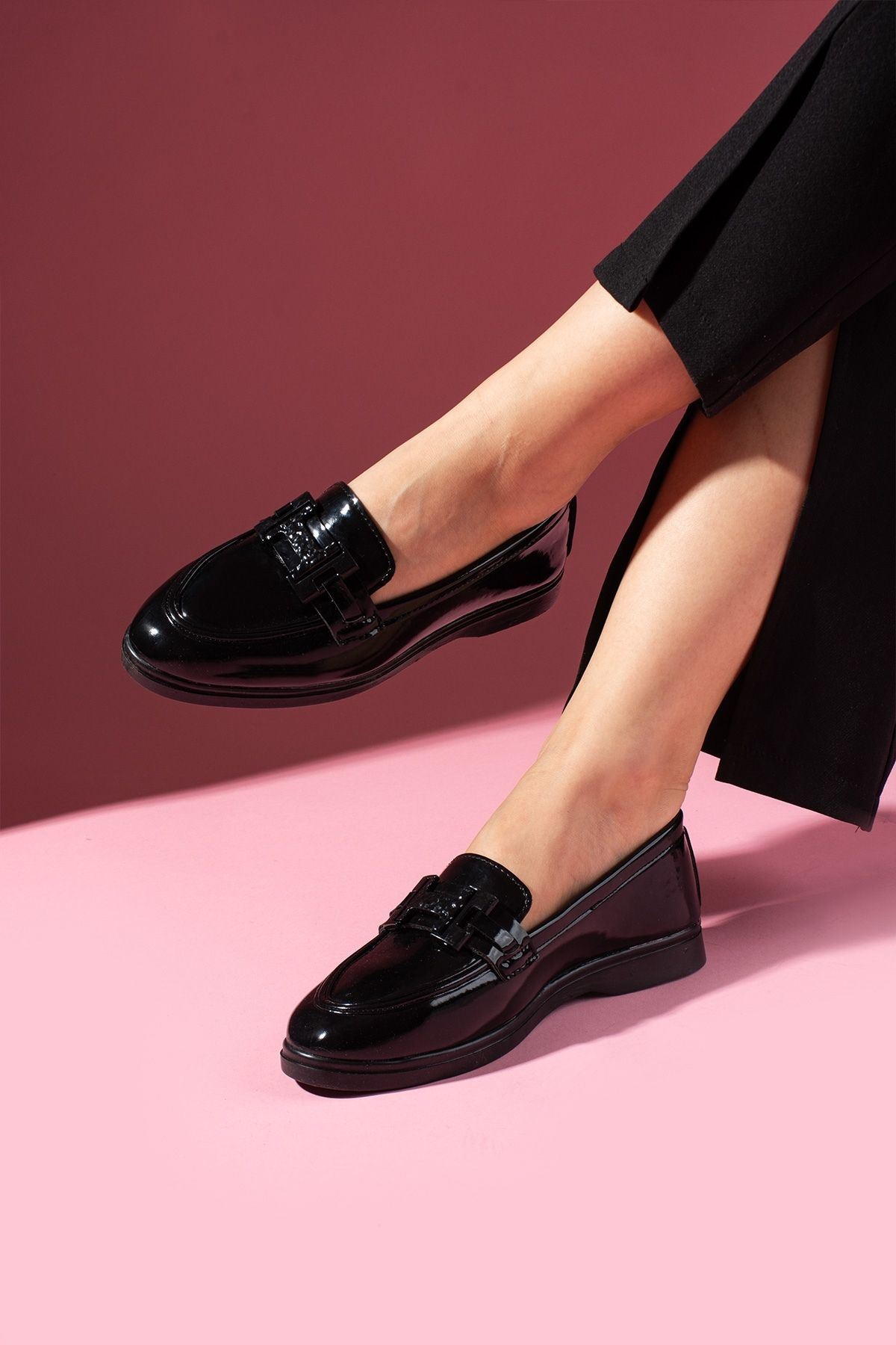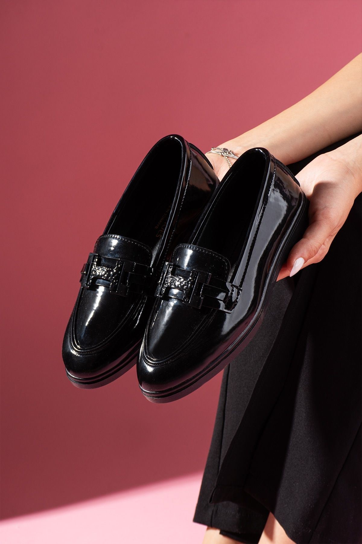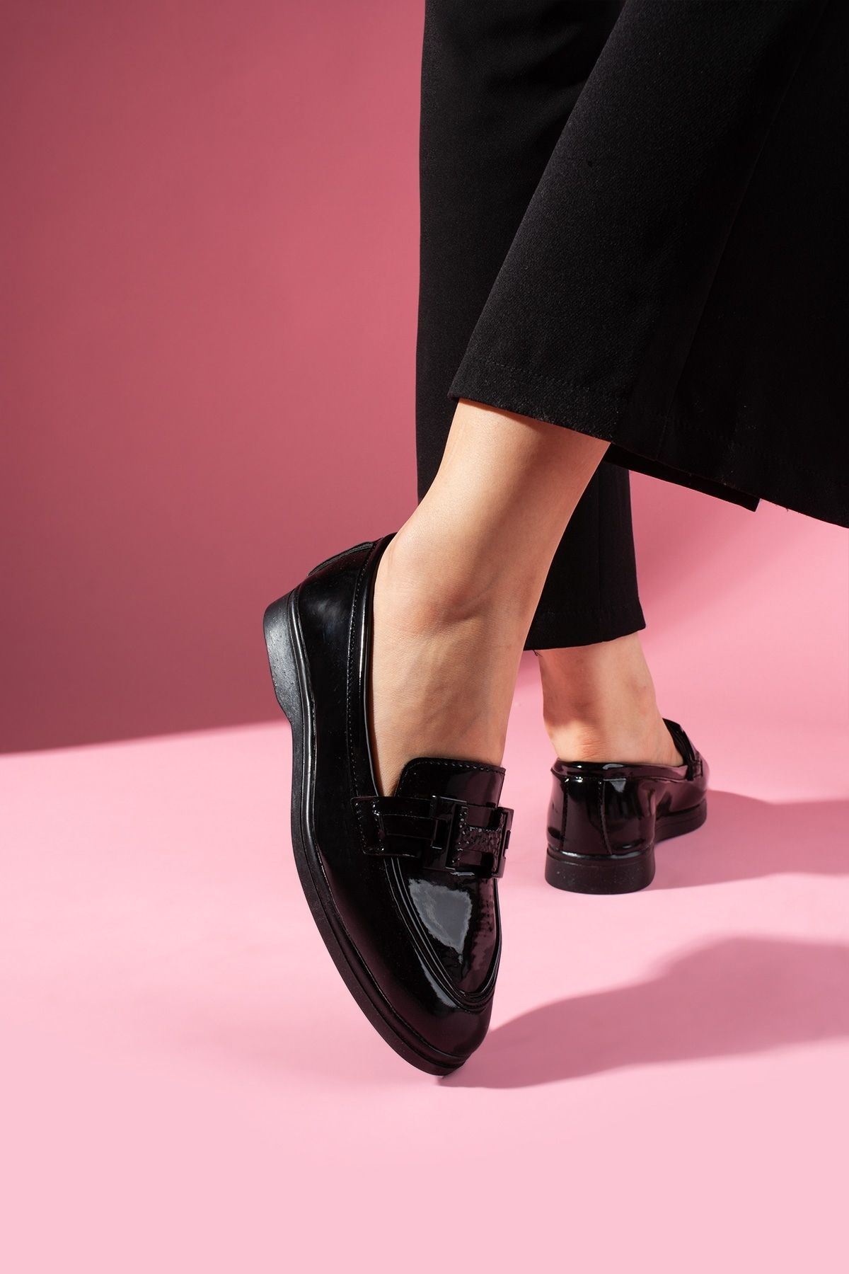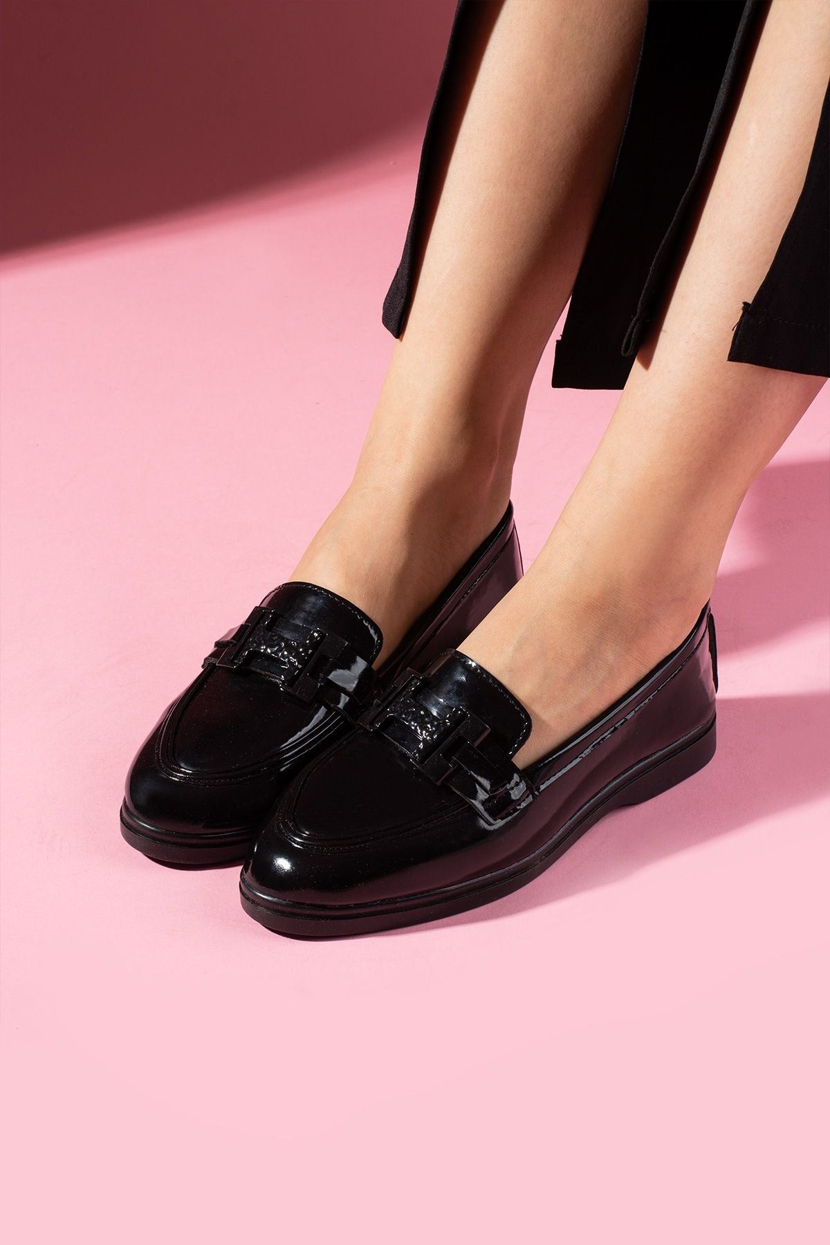 Herkon Siyah Rugan Tokalı Loafer Babet Günlük Ayakkabı