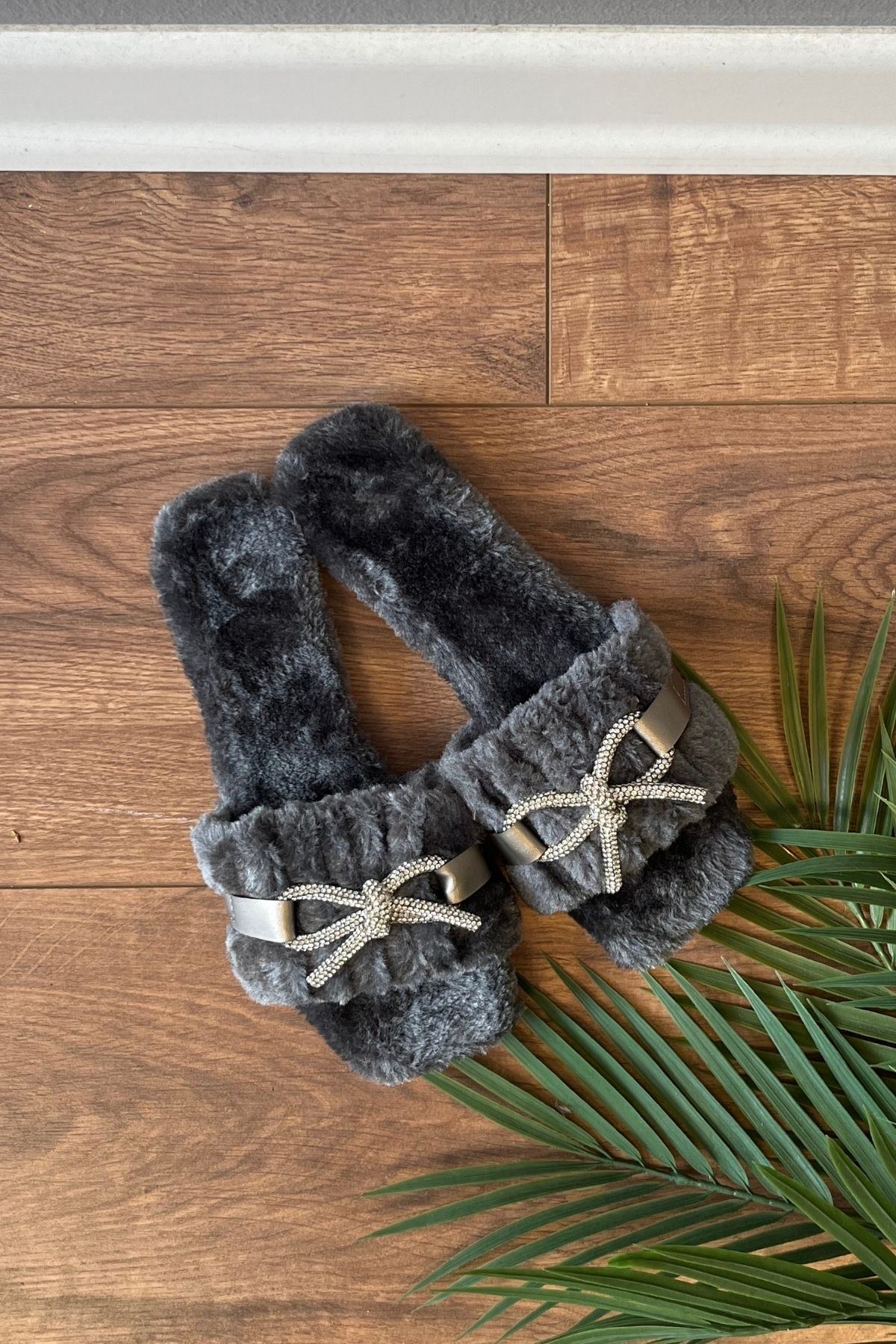 Jefrey Gri Taşlı Fiyonk Detaylı Tüylü Ev Terliği