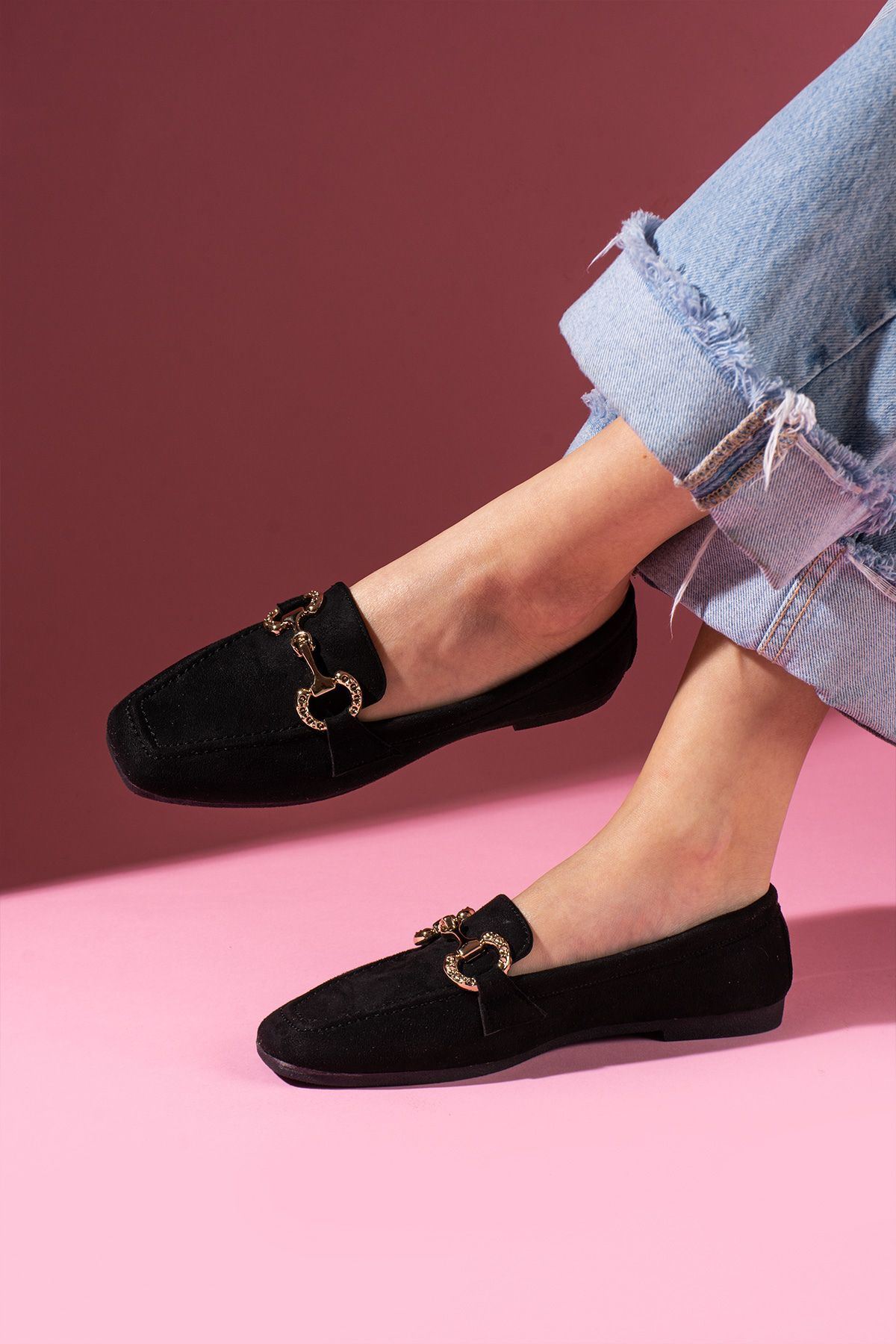 Kendy Siyah Süet Saraçlı Gold Aksesuarlı Loafer Ayakkabı Babet