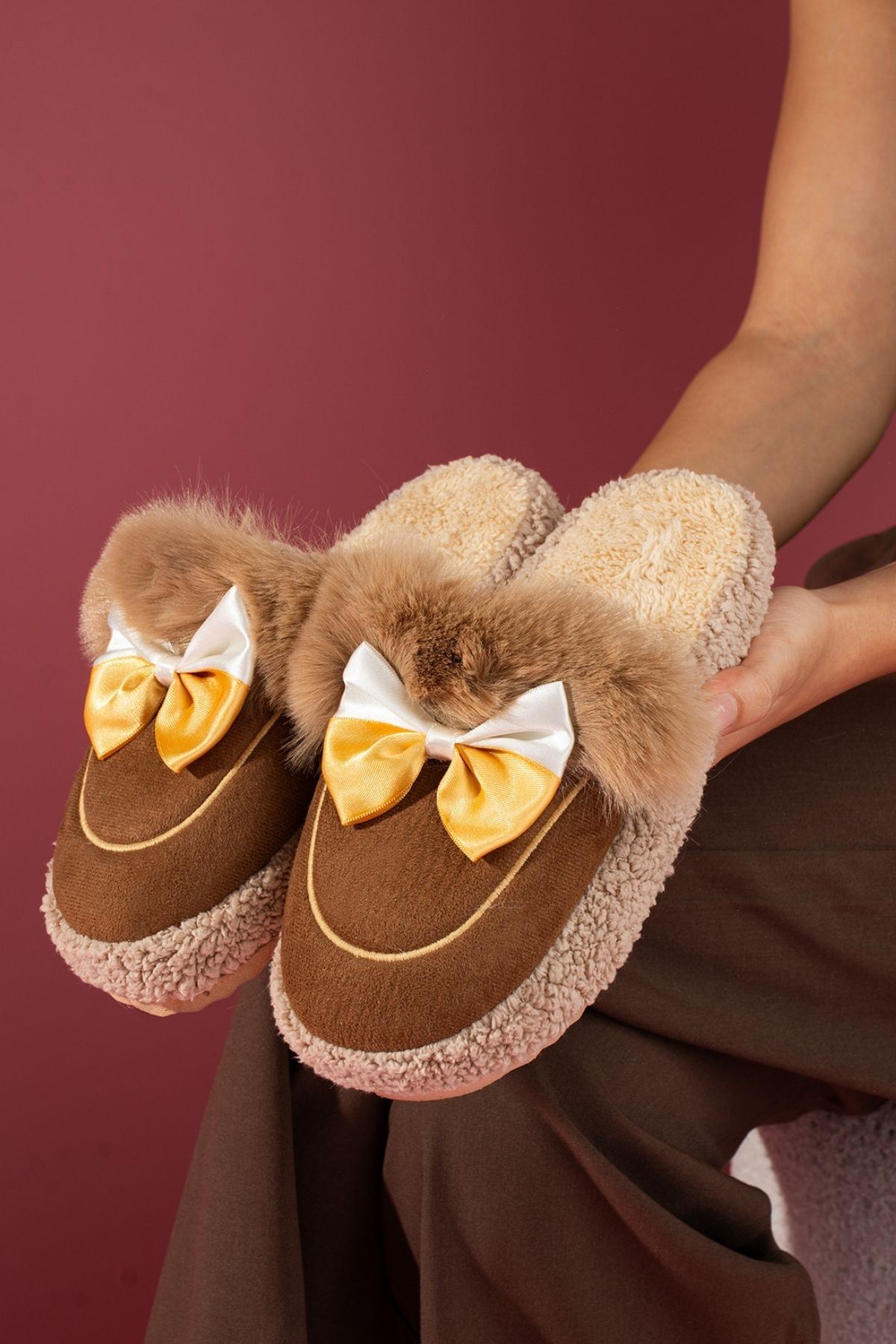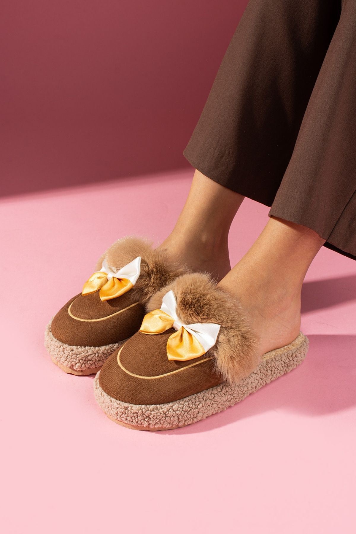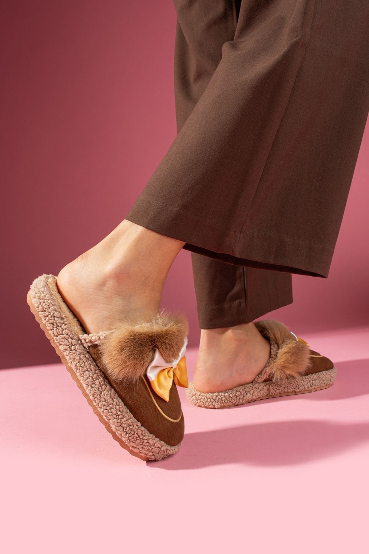 Lufina Taba Fiyonklu Kürk Yakalı Saraç Detaylı Sessiz Taban Ev Terliği