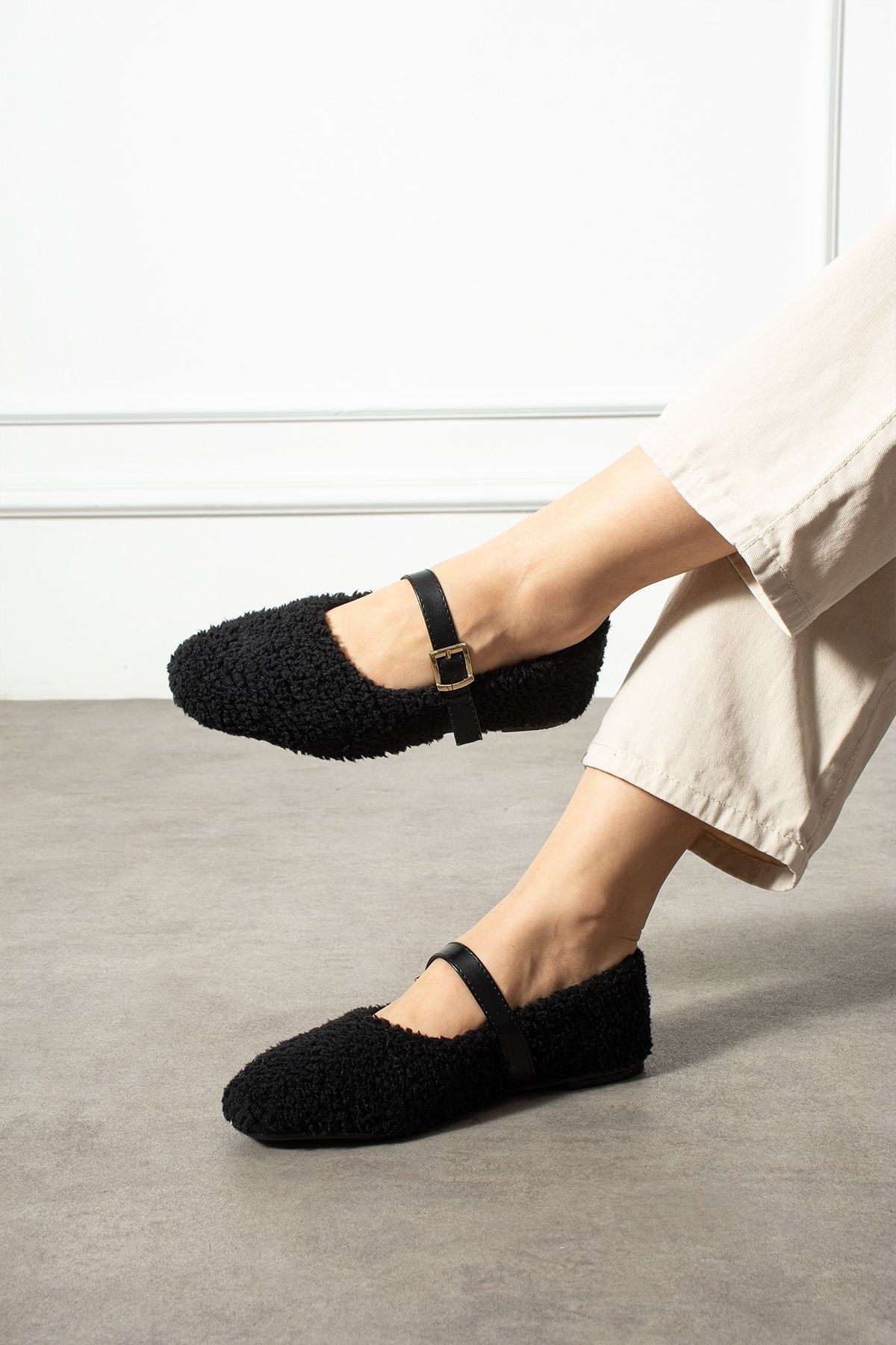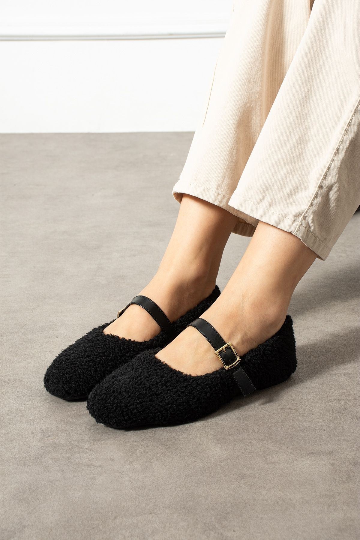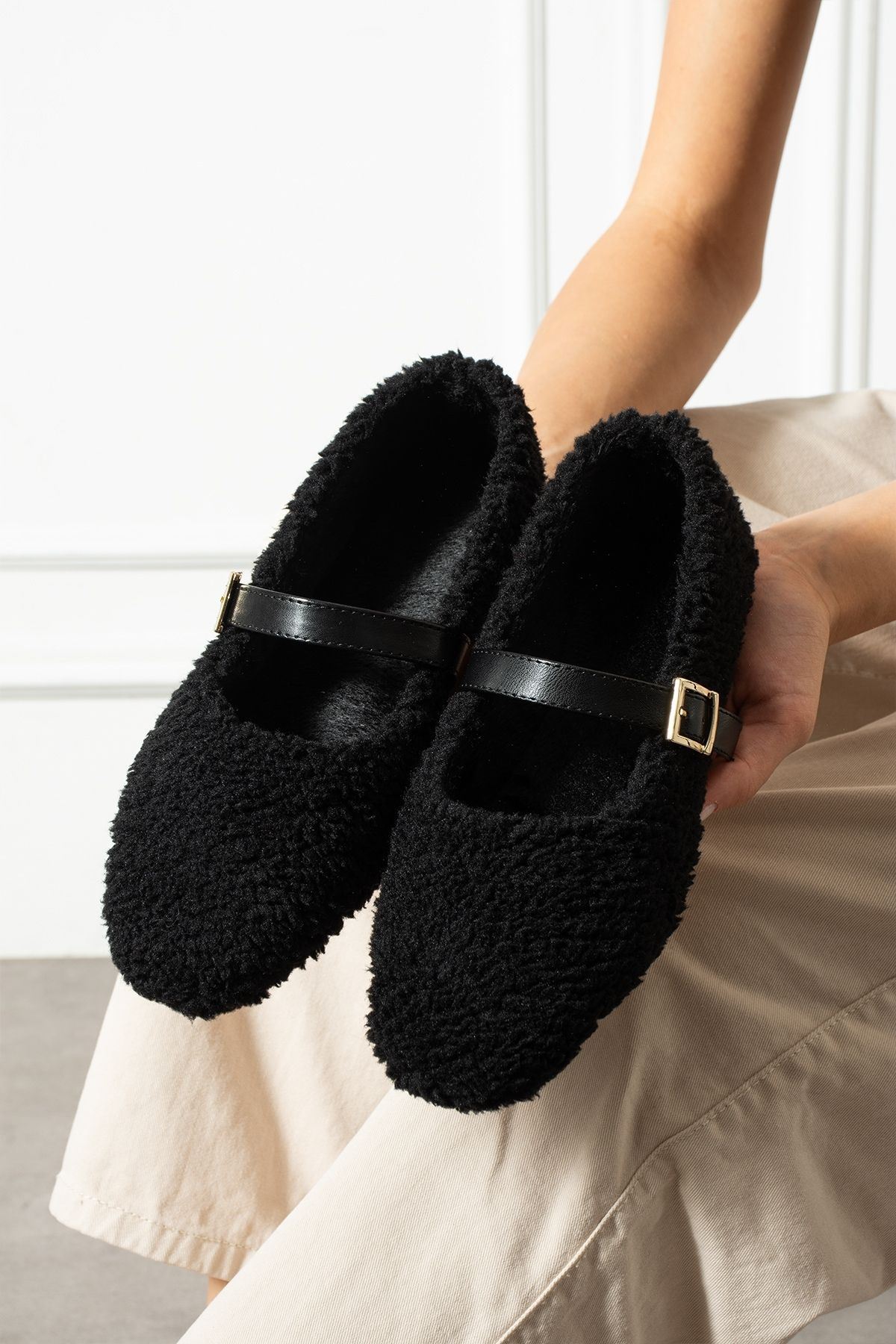 Damy Siyah Tokalı Çift Bantlı Peluş Detaylı Kadın Ev Terliği