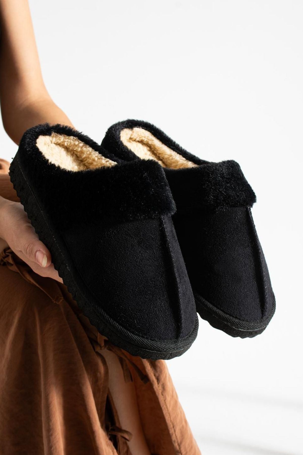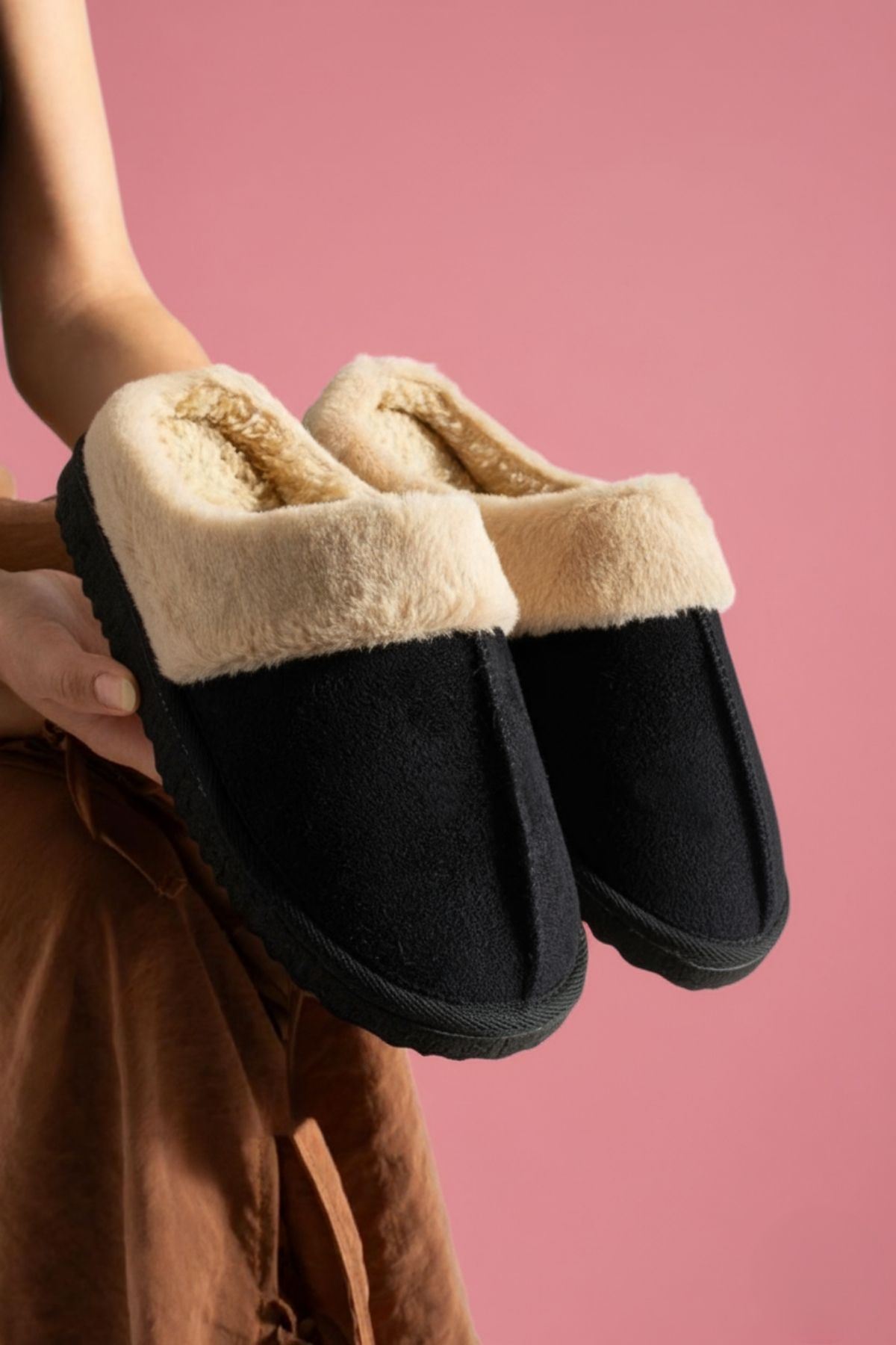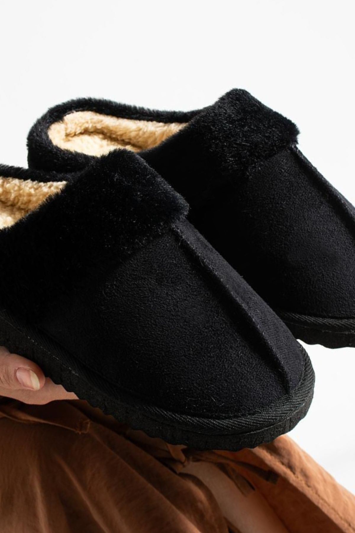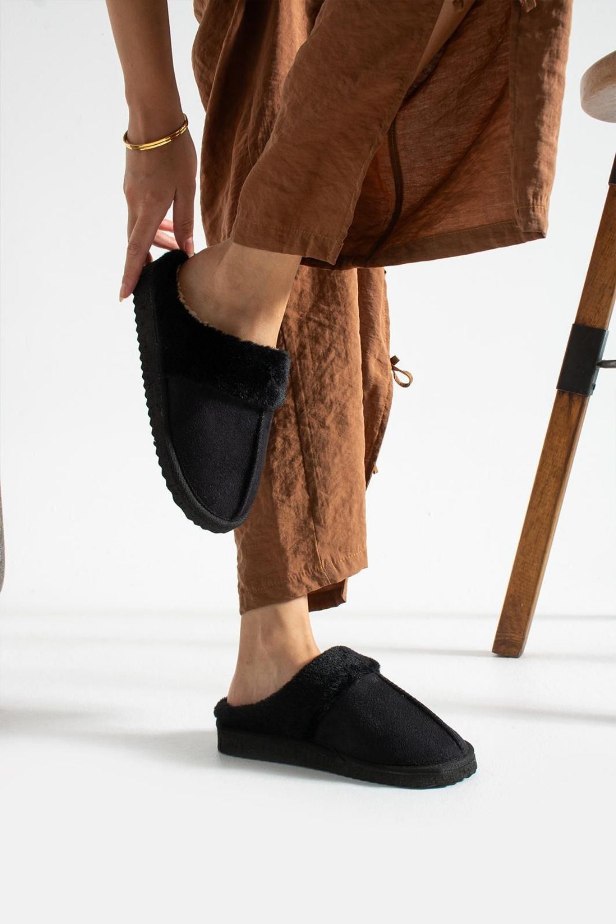 Mabes Siyah Süet Kürk Yakalı Yarı Kapalı Sessiz Taban Ev Terliği