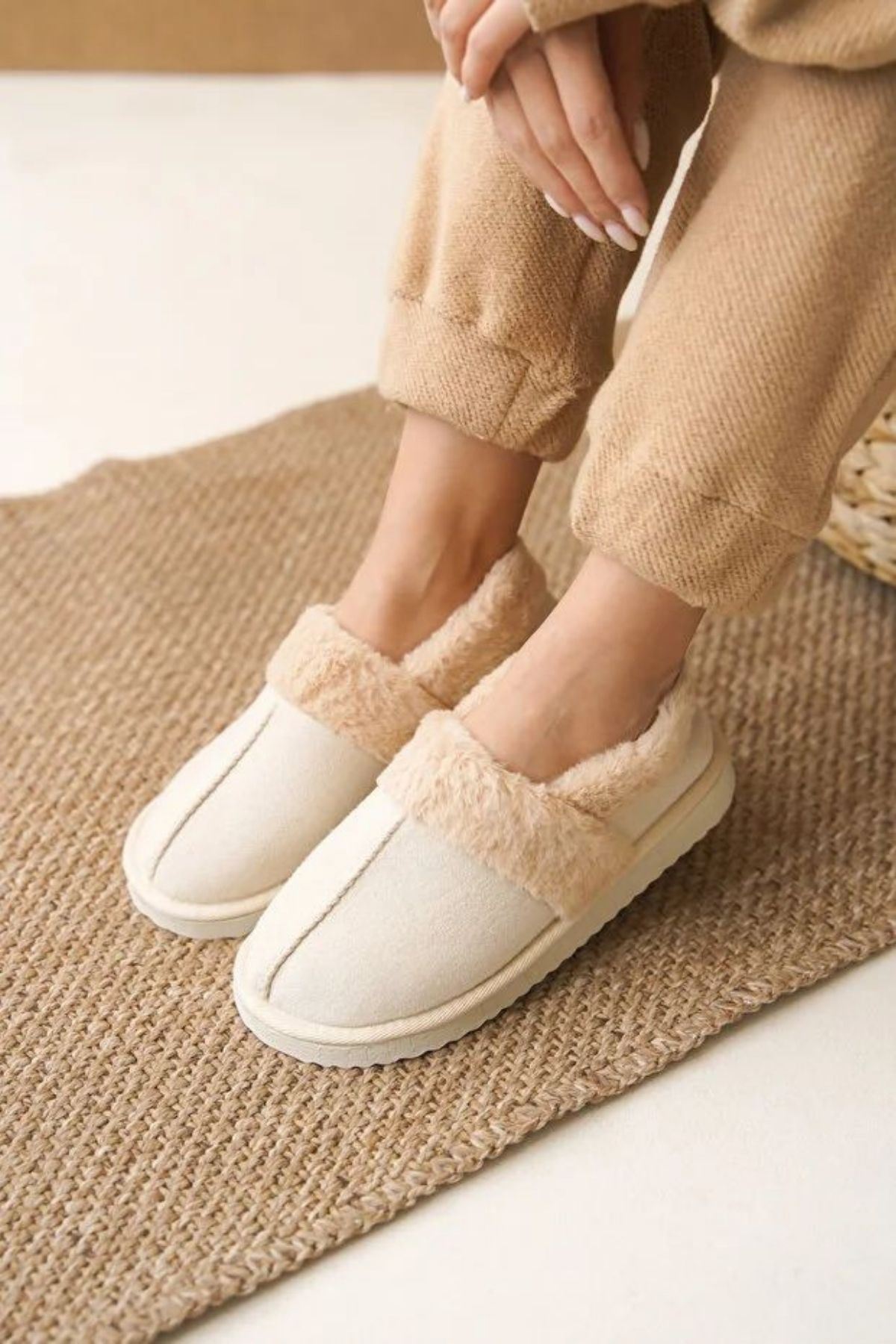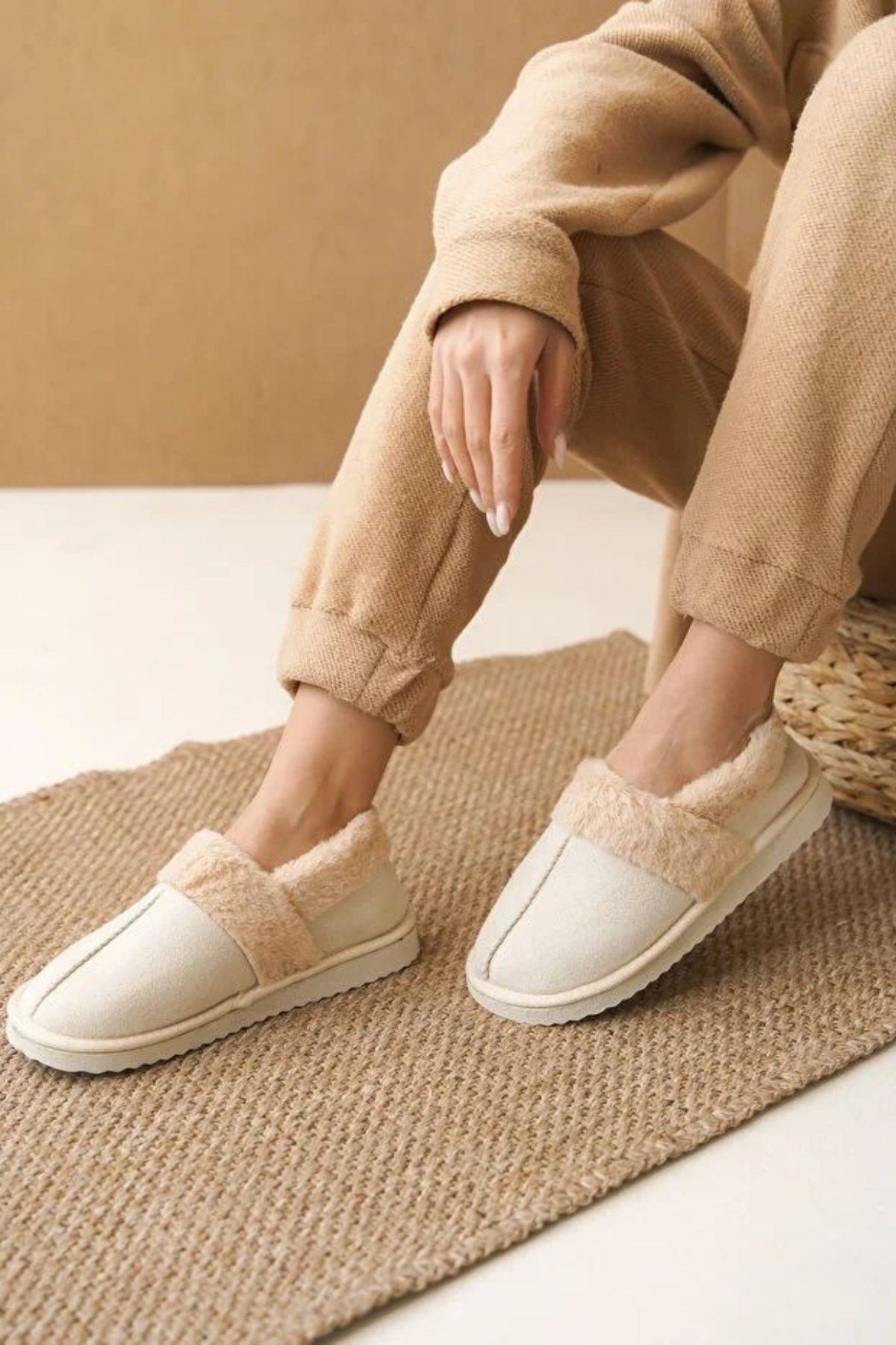 Moffy Bej Süet Kürk Yakalı Sessiz Taban Ev Ayakkabısı