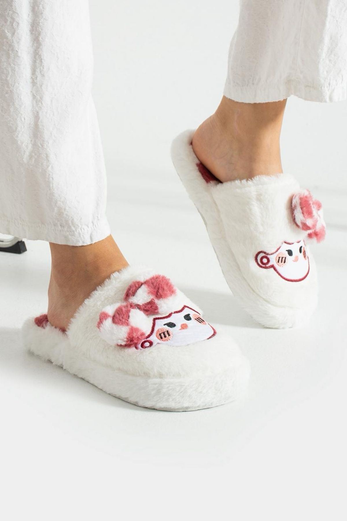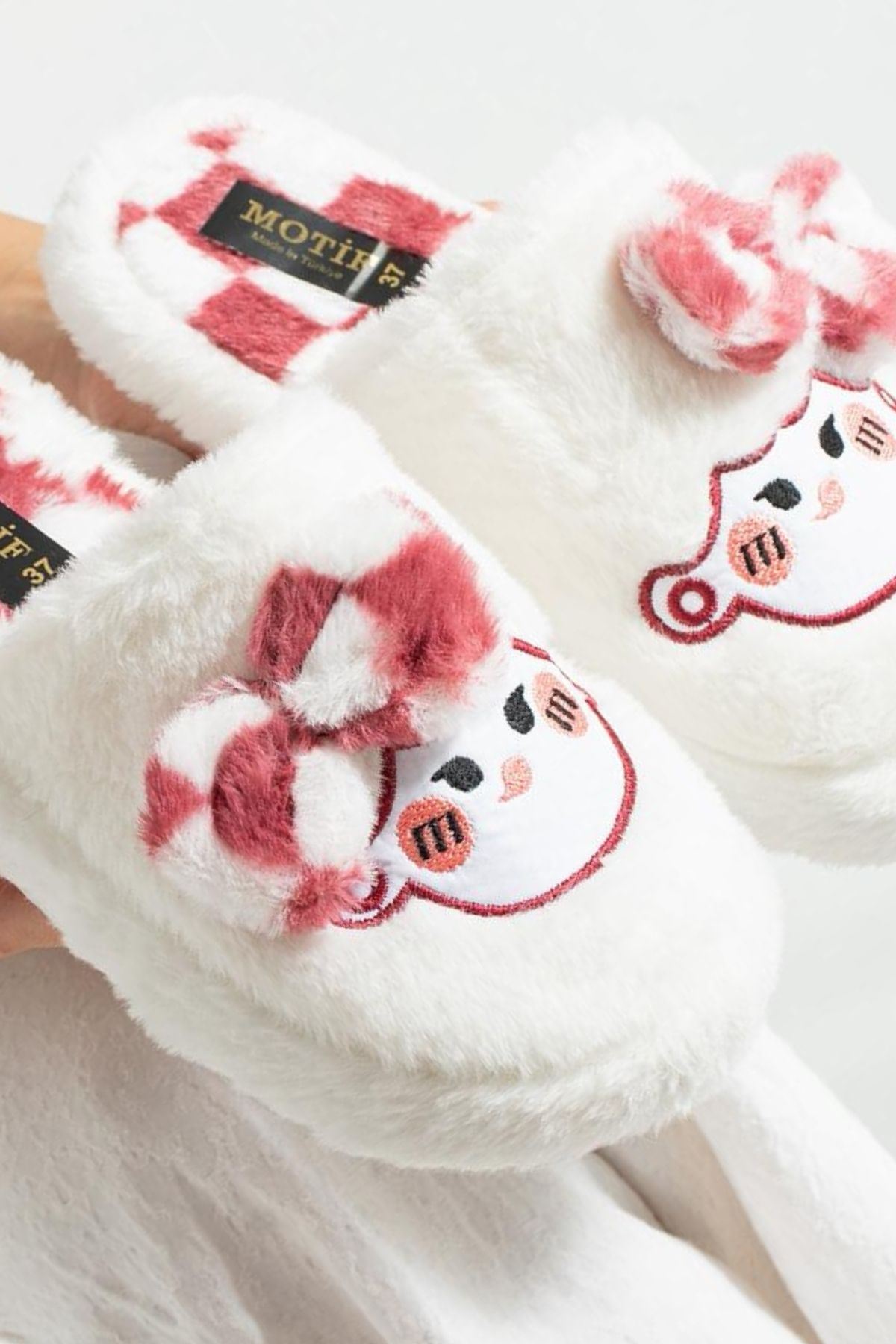 Papy Beyaz-Pembe Papyonlu Karakter Nakışlı Peluş Kadın Sessiz Tabanlı Ev Terliği