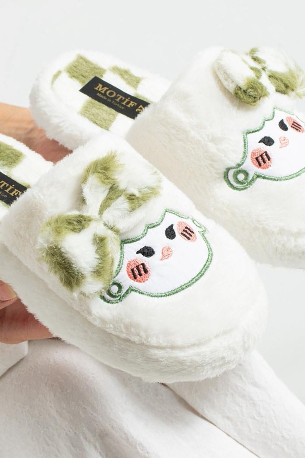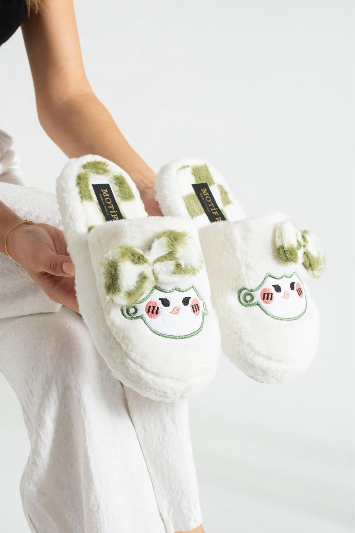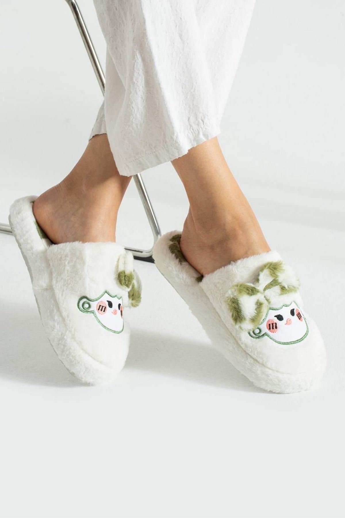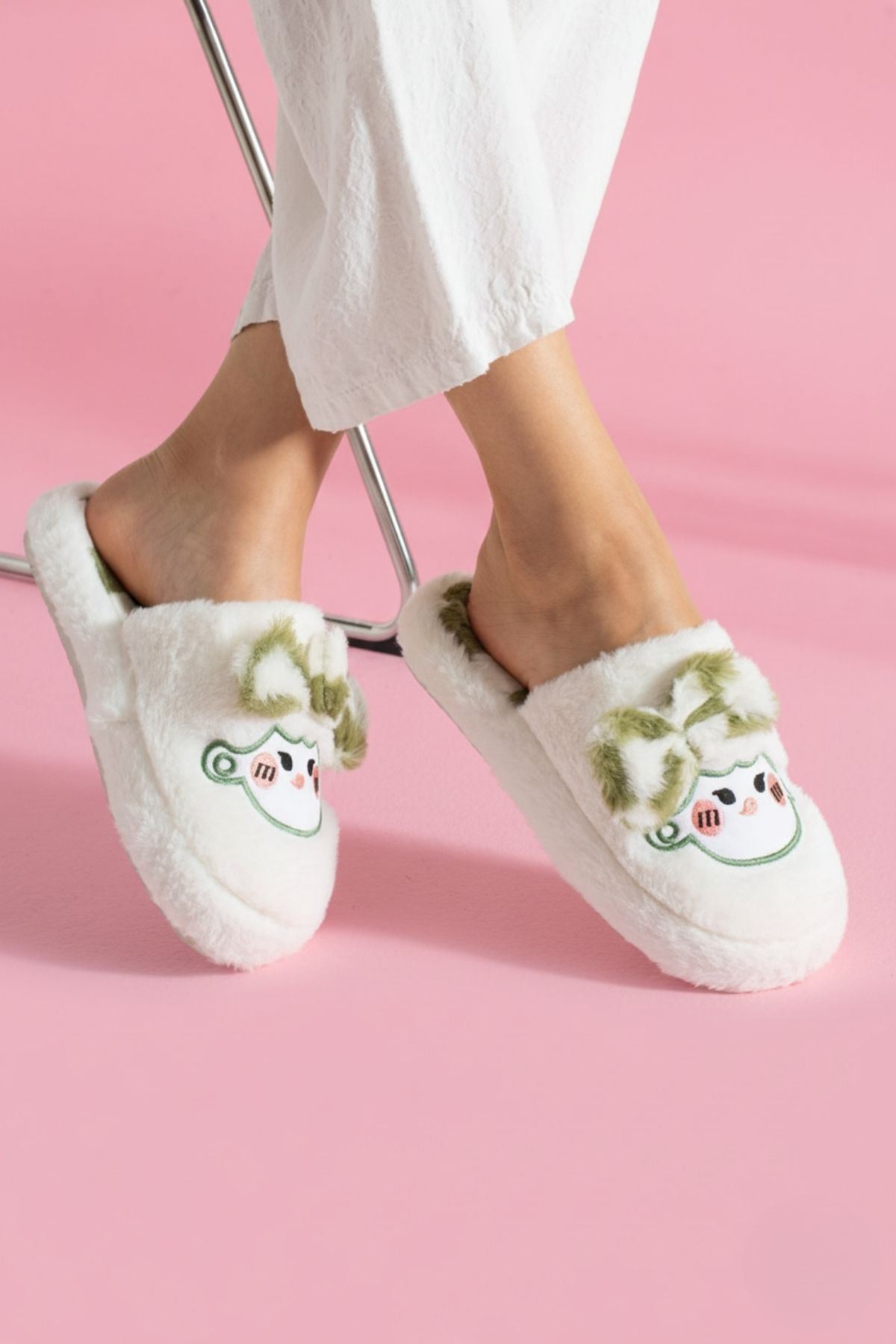 Papy Beyaz-Yeşil Papyonlu Karakter Nakışlı Peluş Kadın Sessiz Tabanlı Ev Terliği