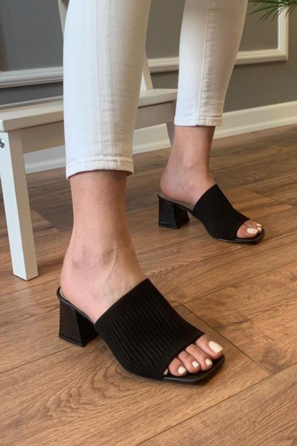 Petra Siyah Çizgili Triko Topuklu Terlik