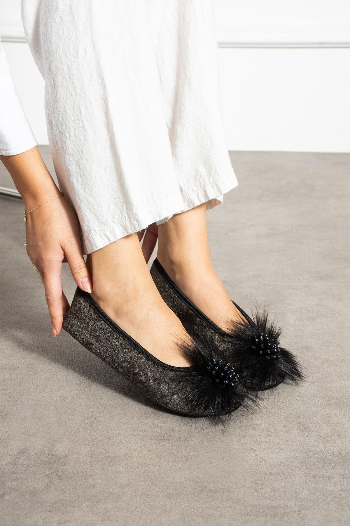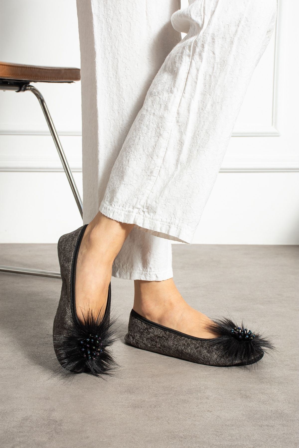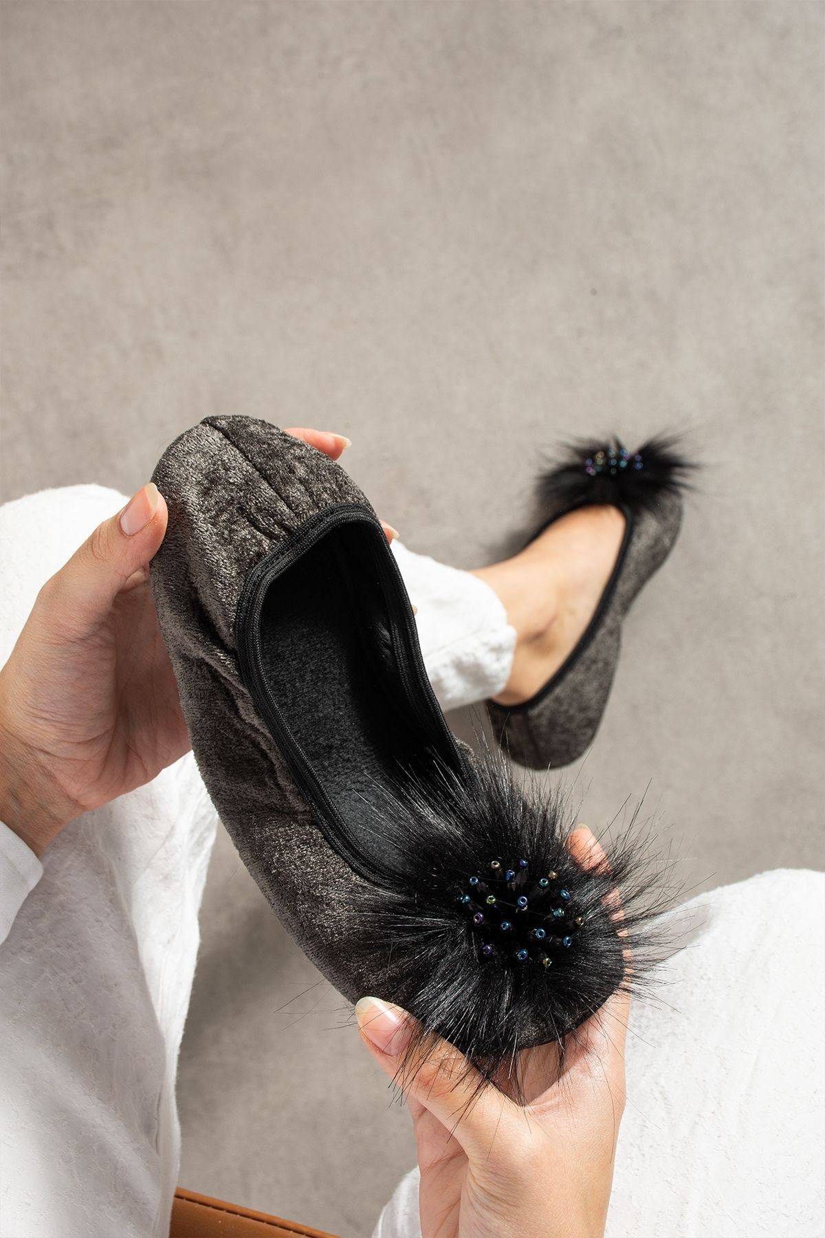 • Ön Detay: Tüylü aksesuar ve parlak taş süsleme