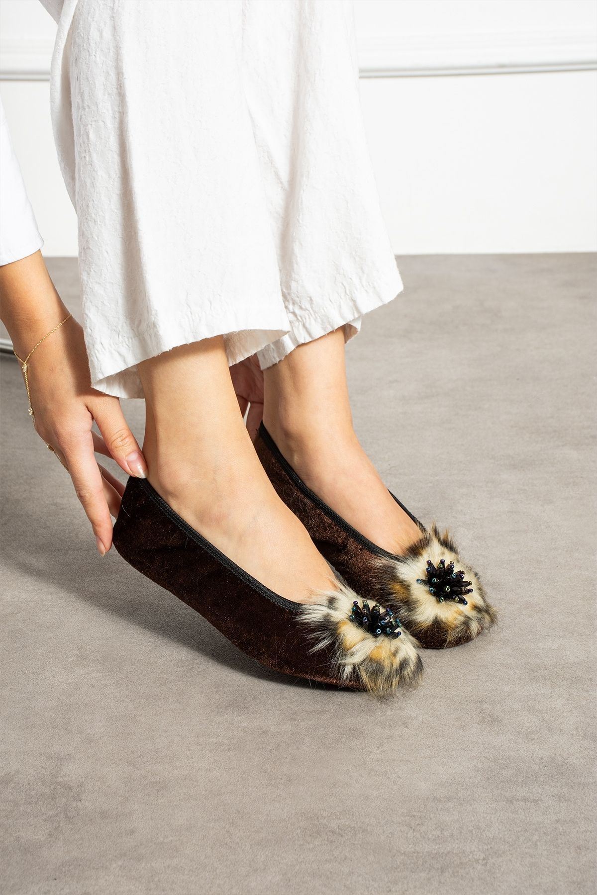 • Ön Detay: Tüylü aksesuar ve parlak taş süsleme