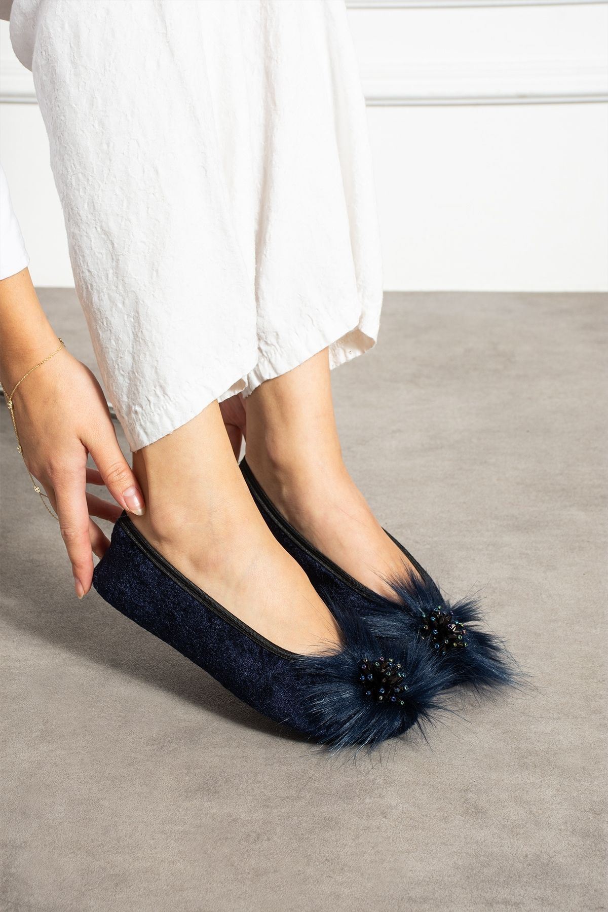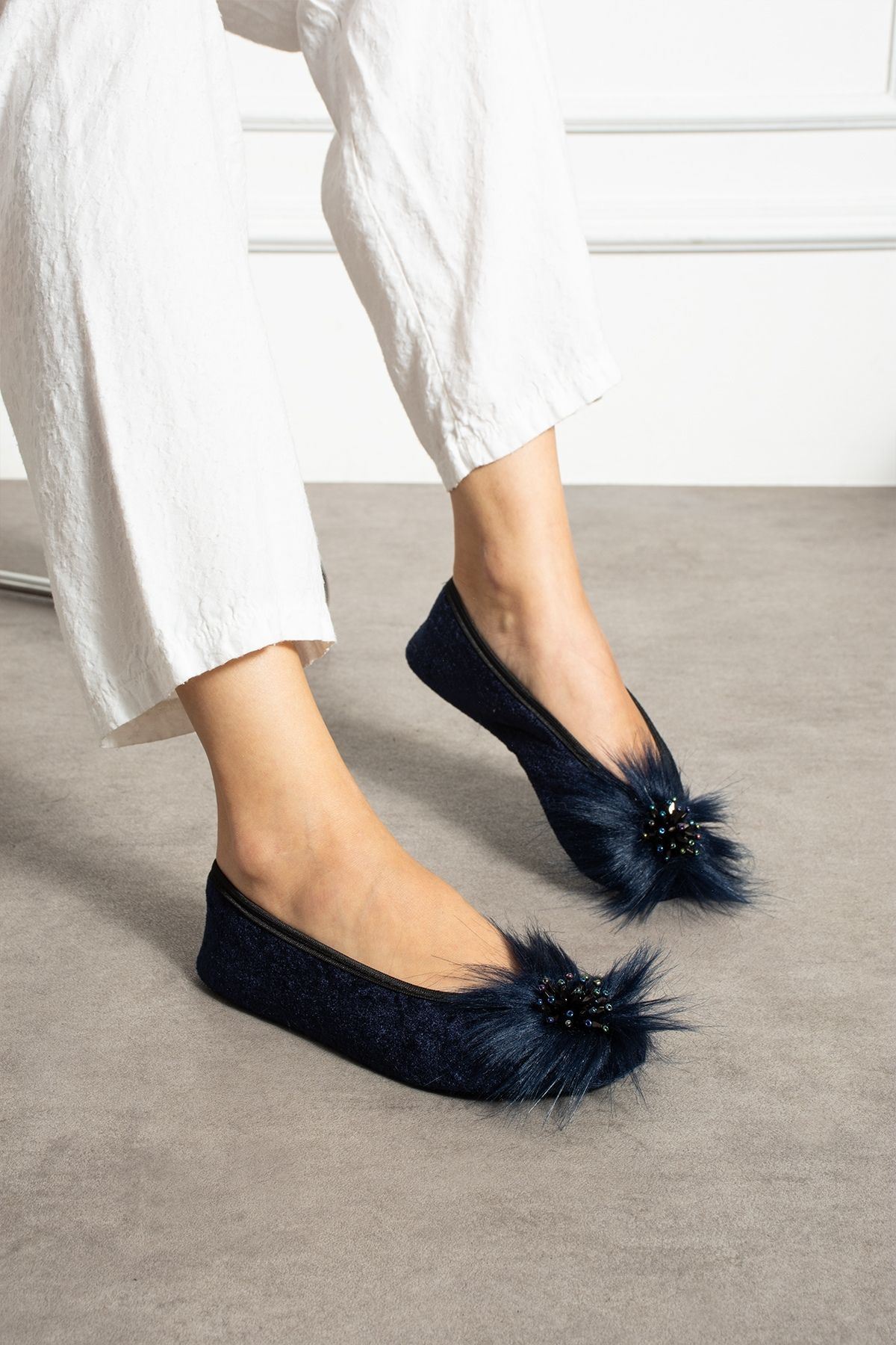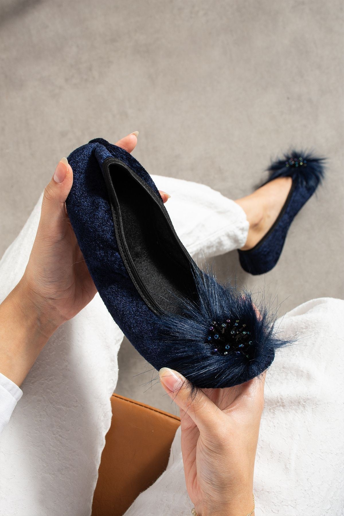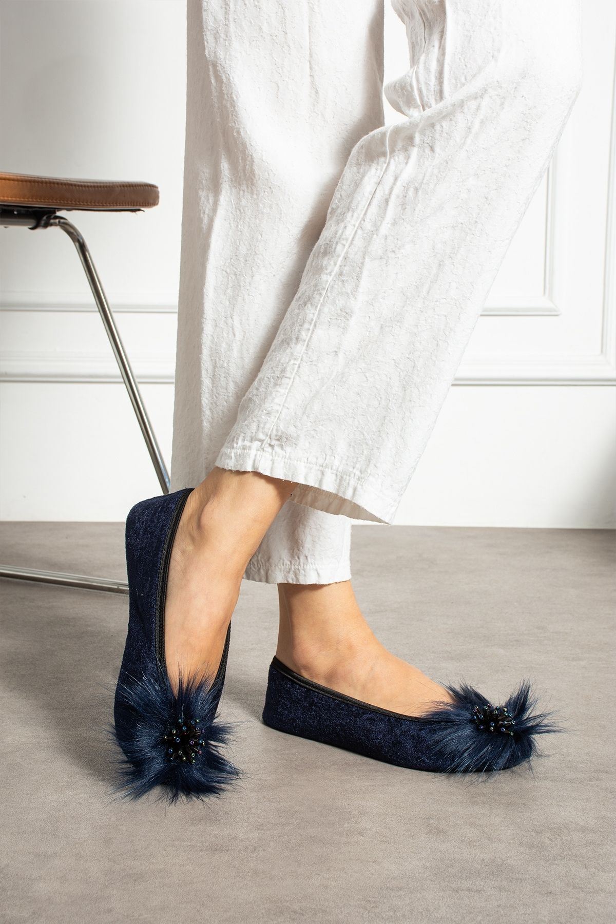 • Ön Detay: Tüylü aksesuar ve parlak taş süsleme