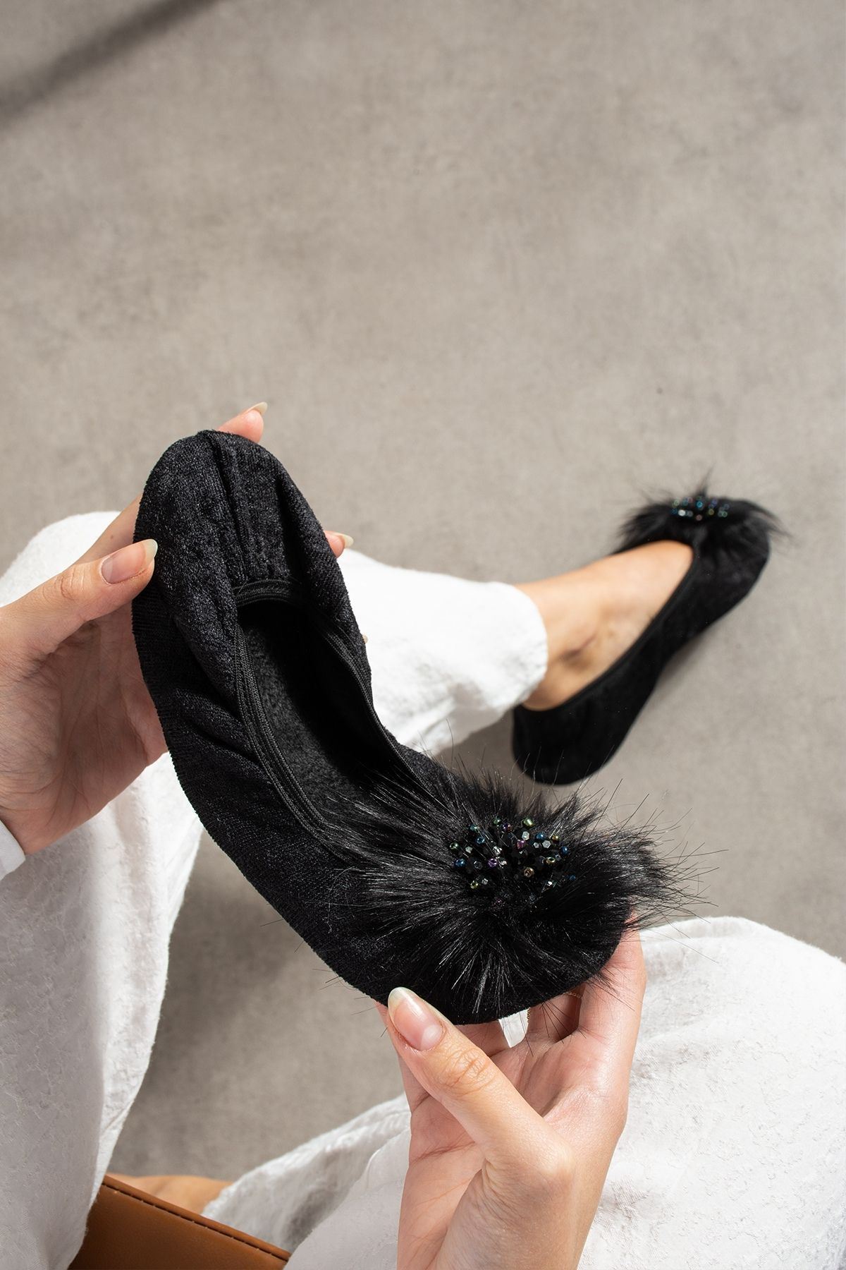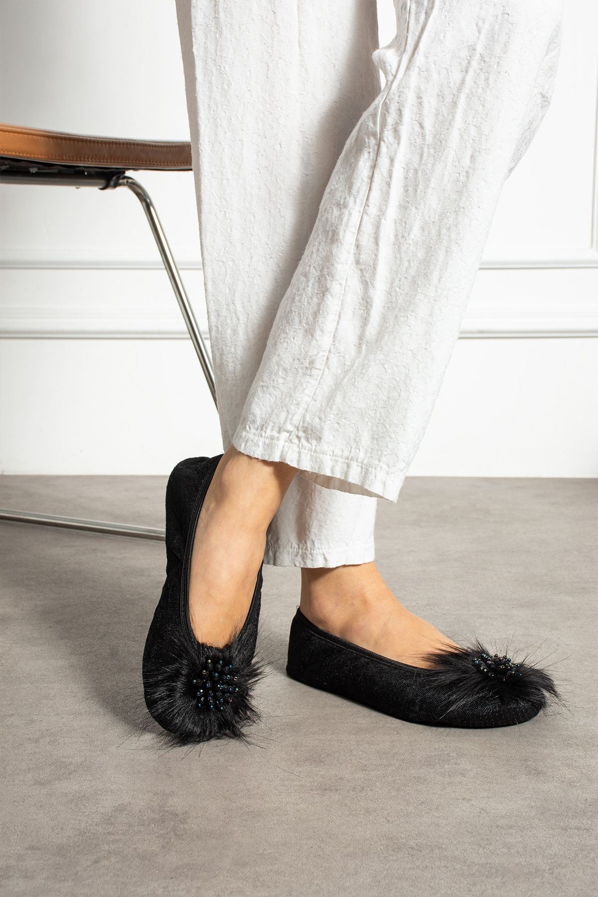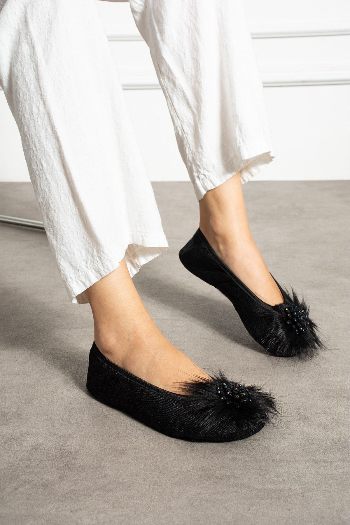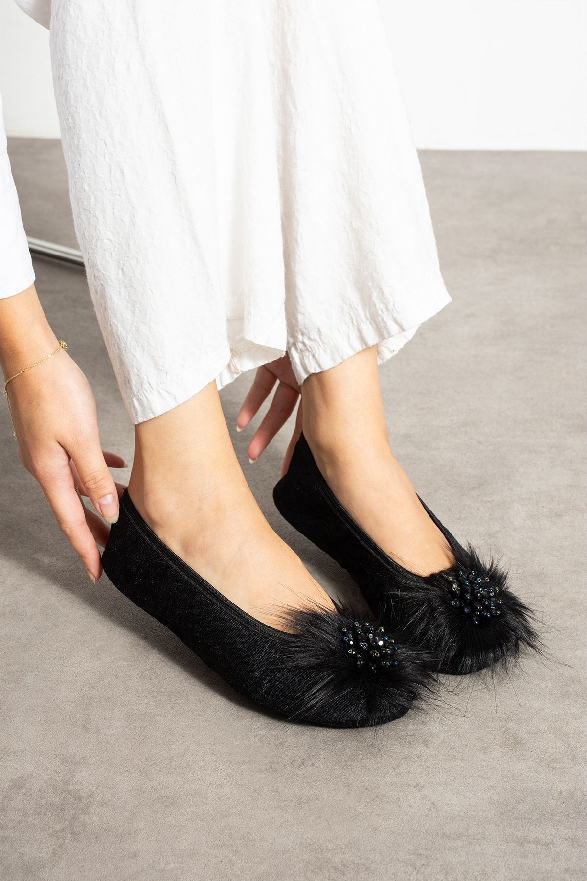 • Ön Detay: Tüylü aksesuar ve parlak taş süsleme