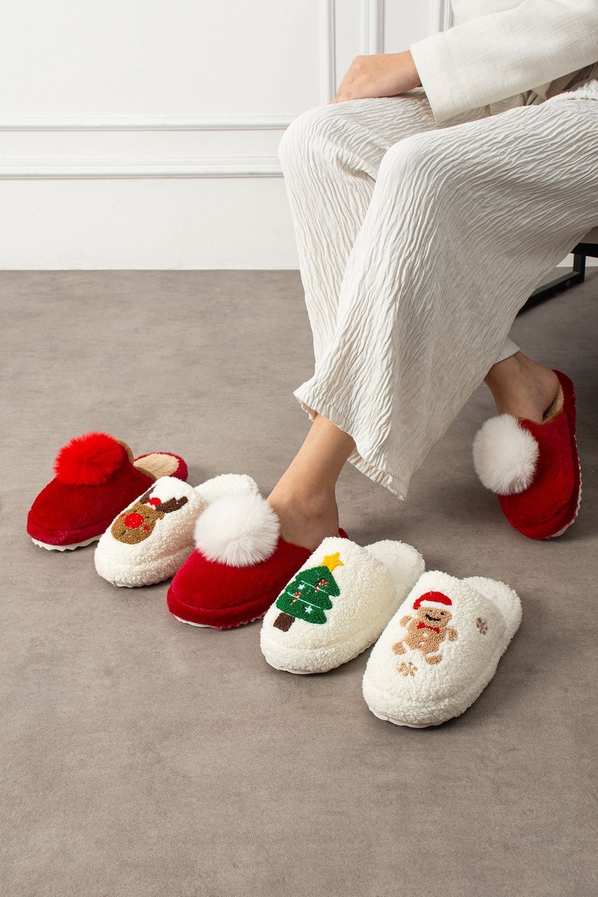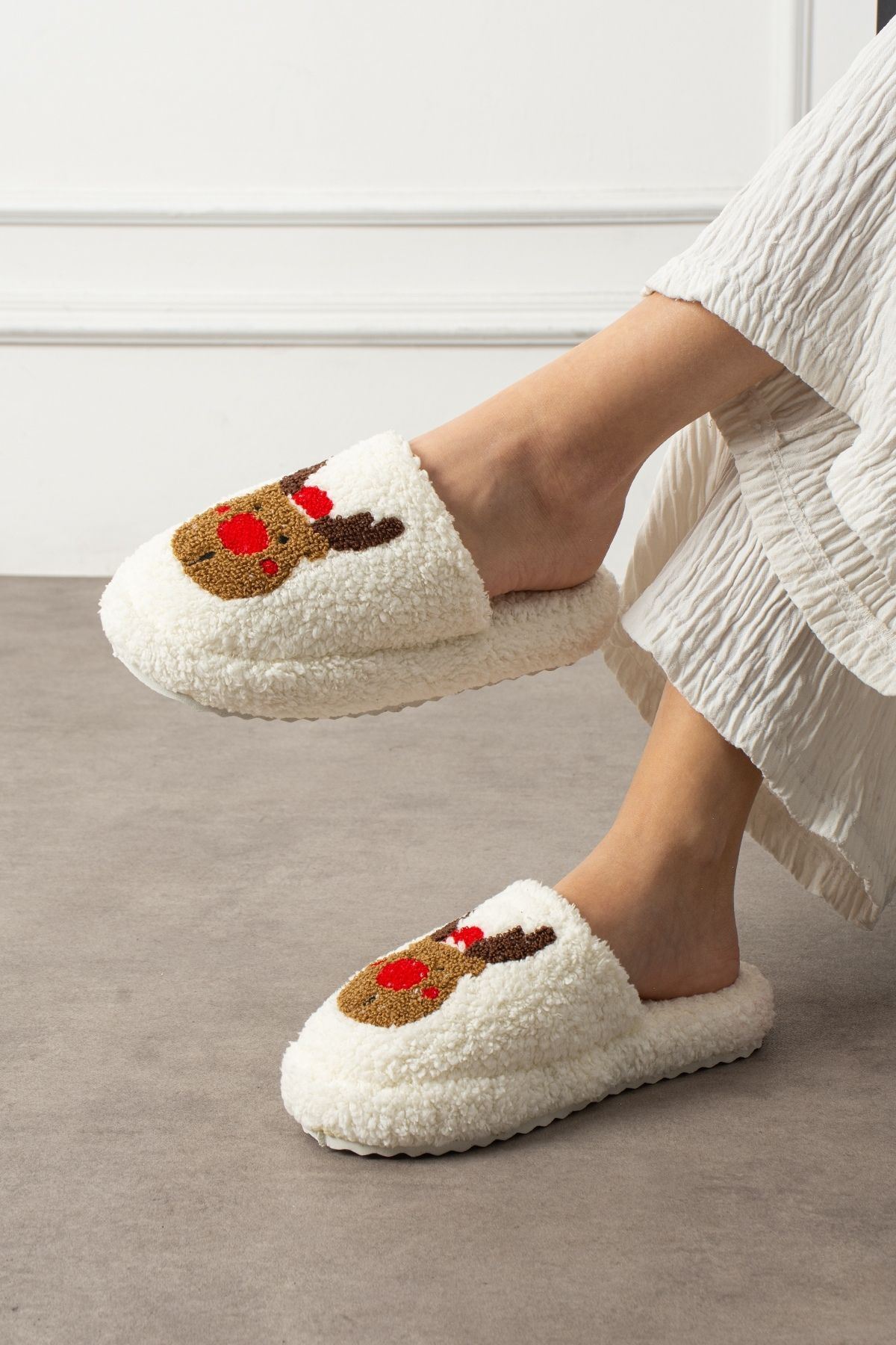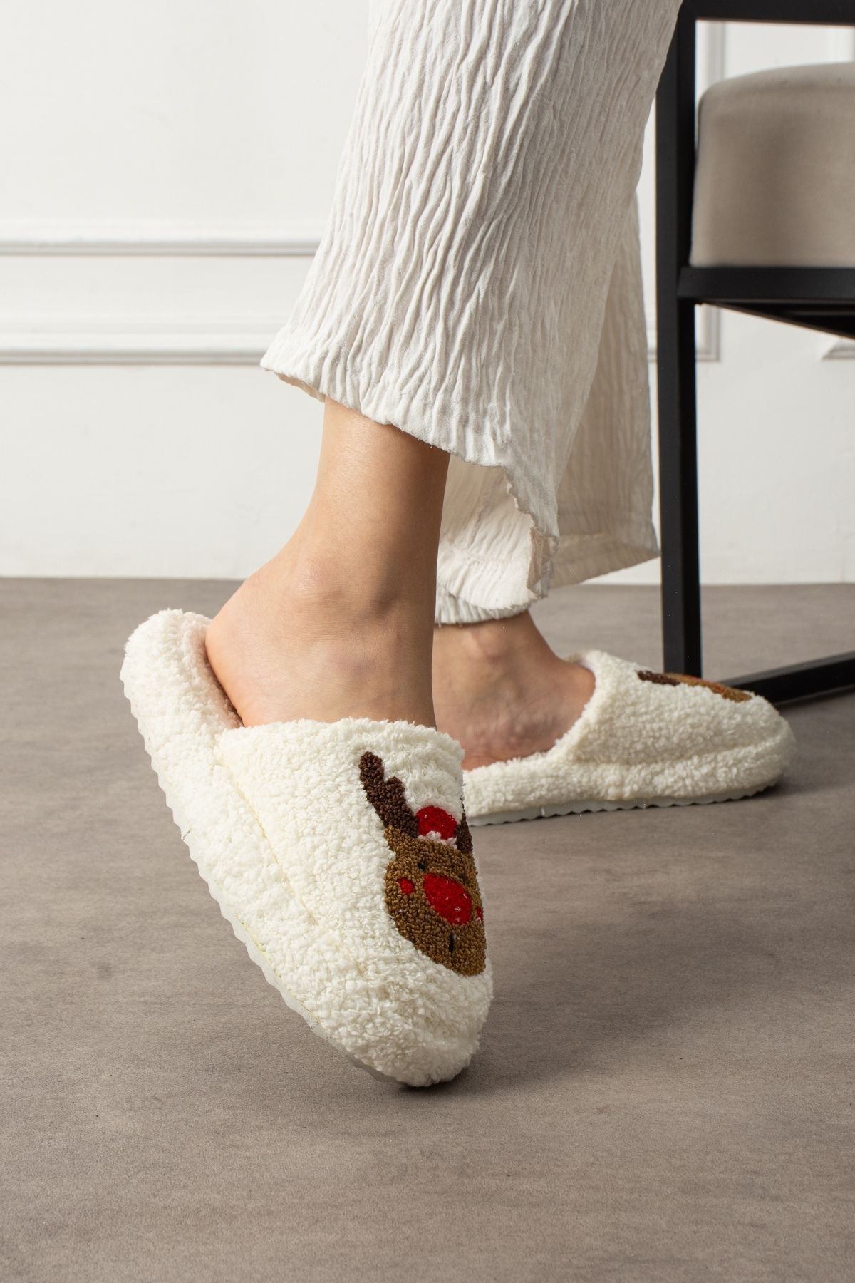 Pinello Beyaz Geyik Kabartma Nakışlı Sessiz Taban Yılbaşı Hediyelik Panduf Ev Terliği