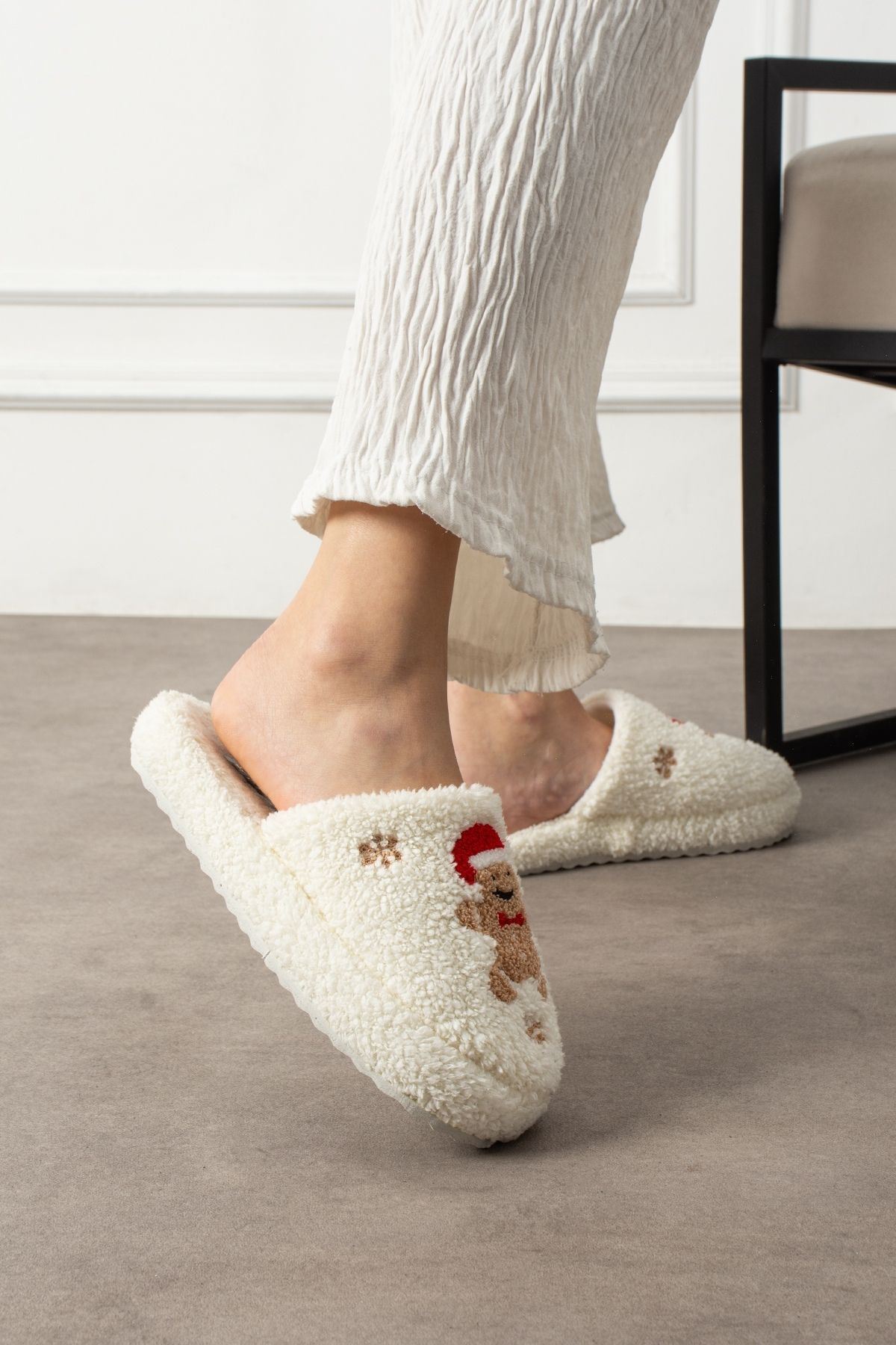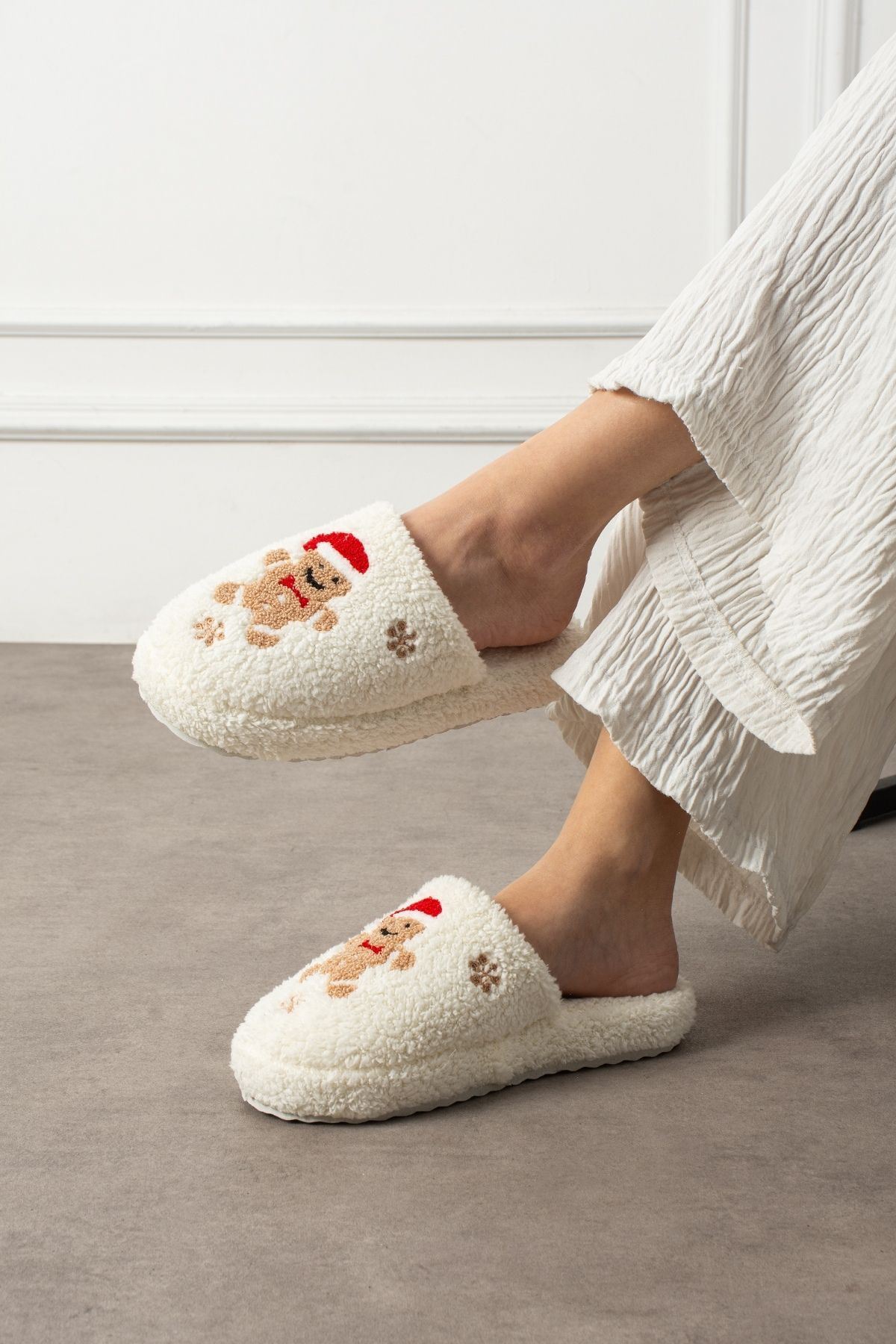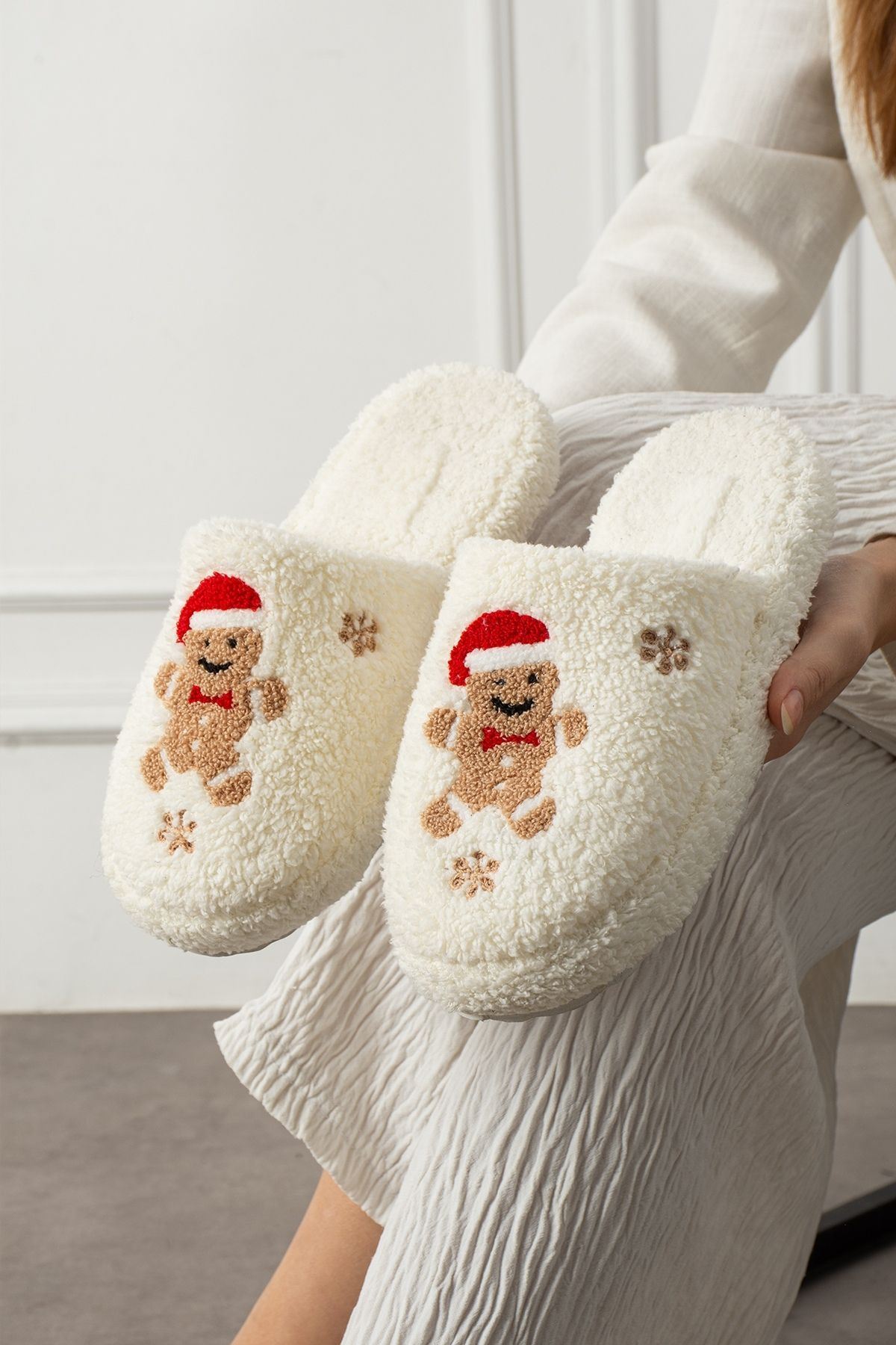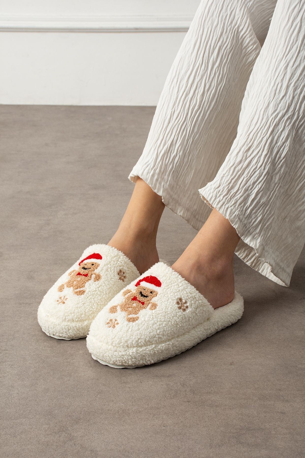 Pinello Beyaz Kurabiye Kabartma Nakışlı Sessiz Taban Yılbaşı Hediyelik Panduf Ev Terliği