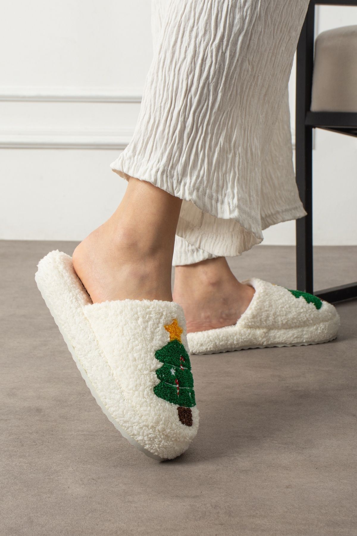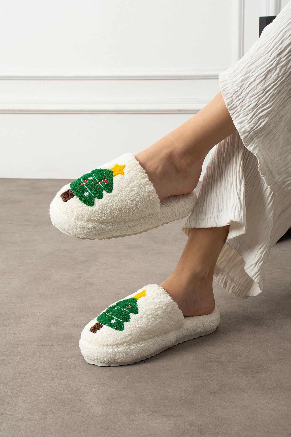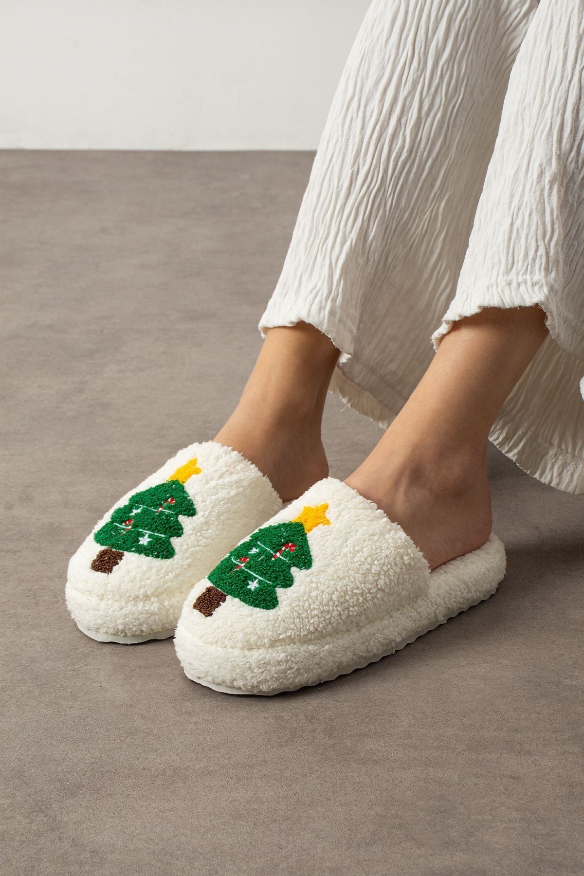 Pinello Beyaz Noel Ağacı Kabartma Nakışlı Sessiz Taban Yılbaşı Hediyelik Panduf Ev Terliği