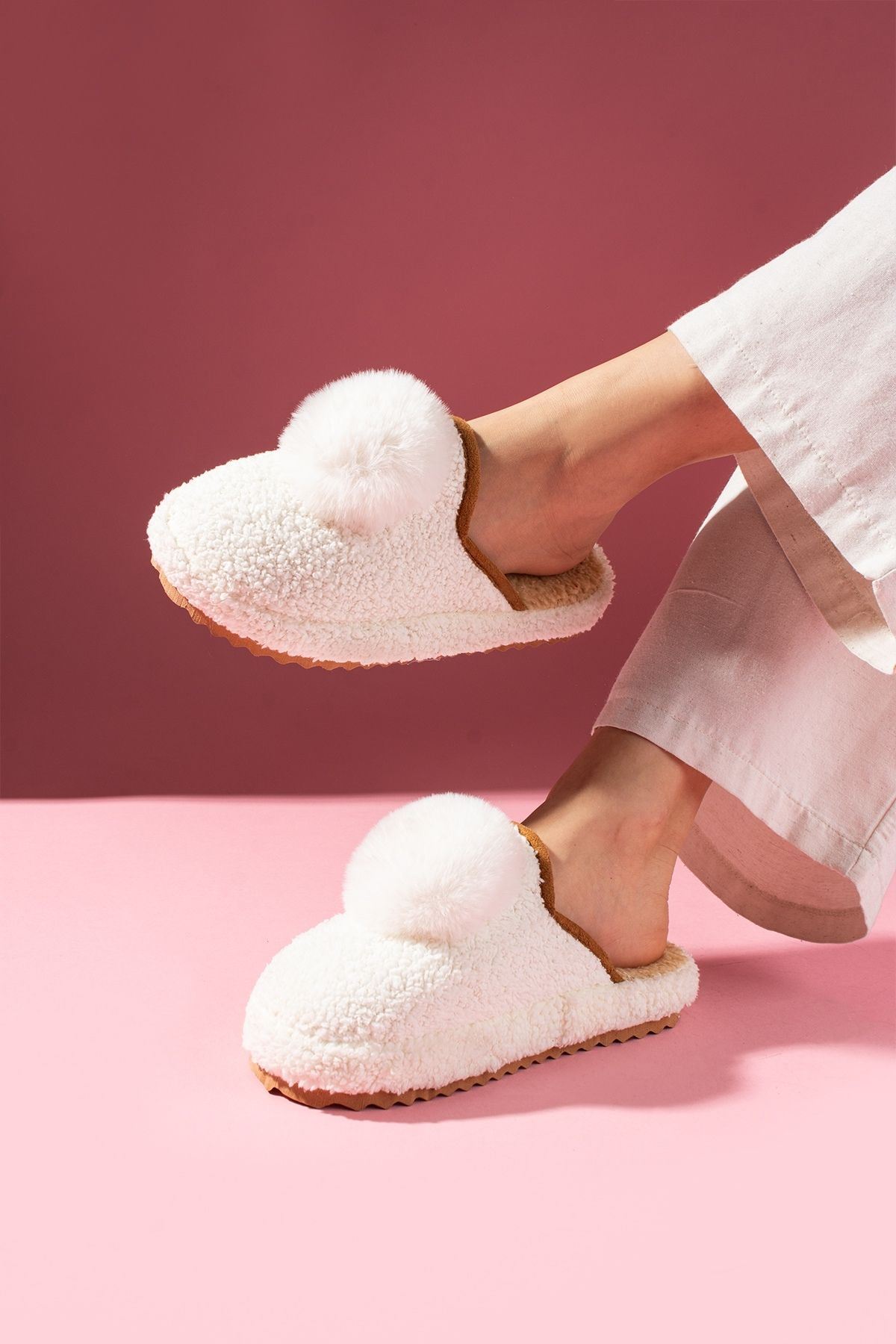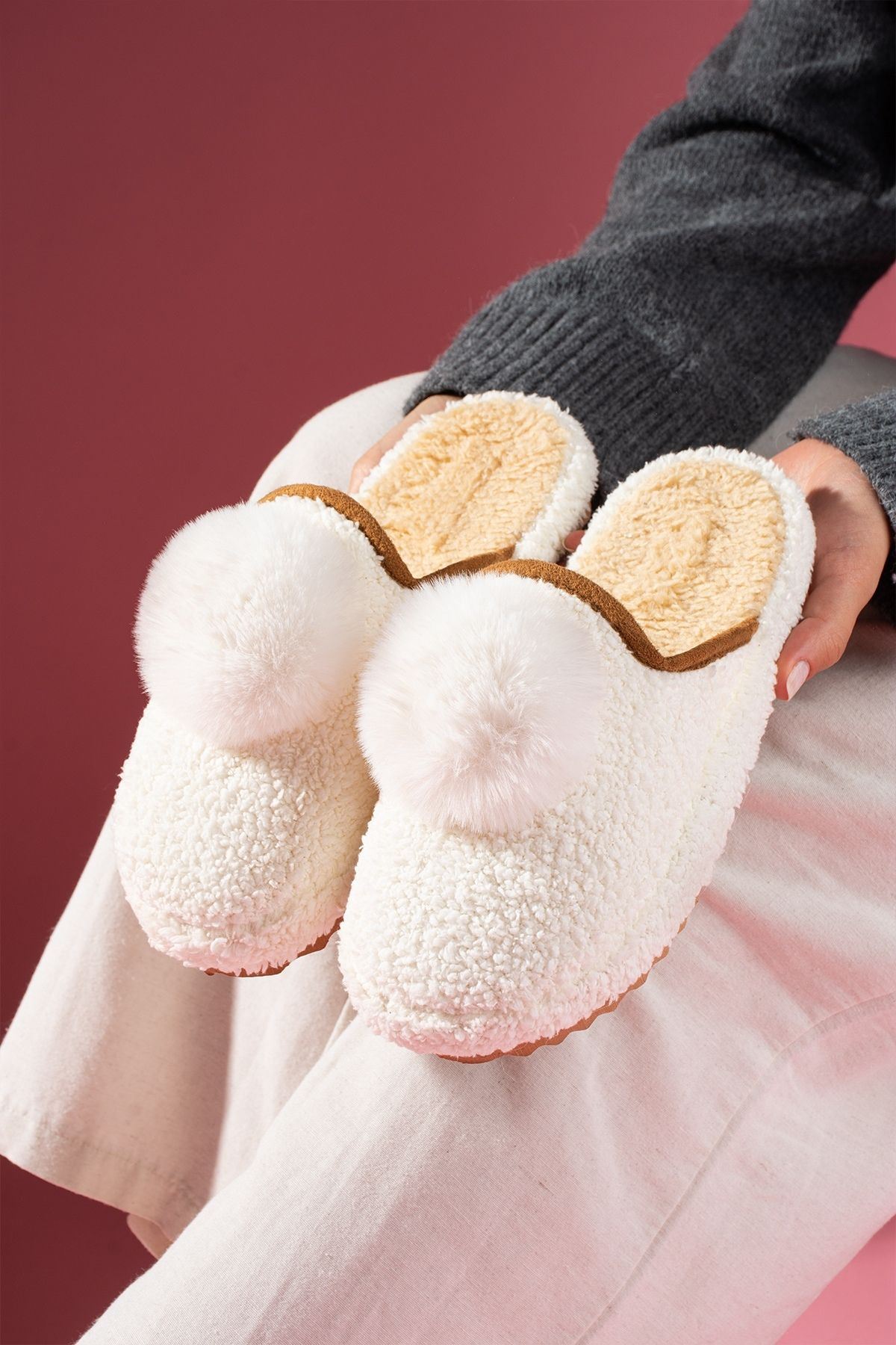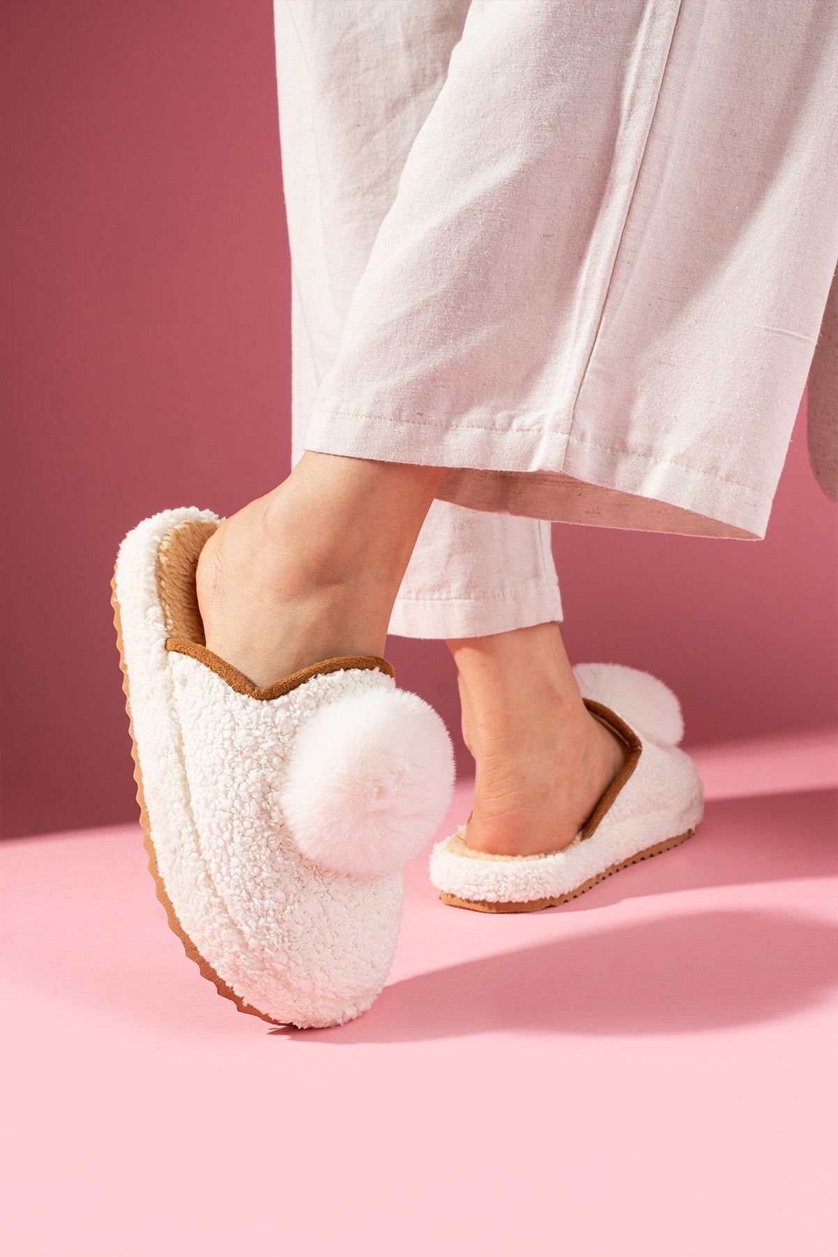 Poffina Beyaz Ponponlu Saraç Detaylı Sessiz Taban Ev Terliği