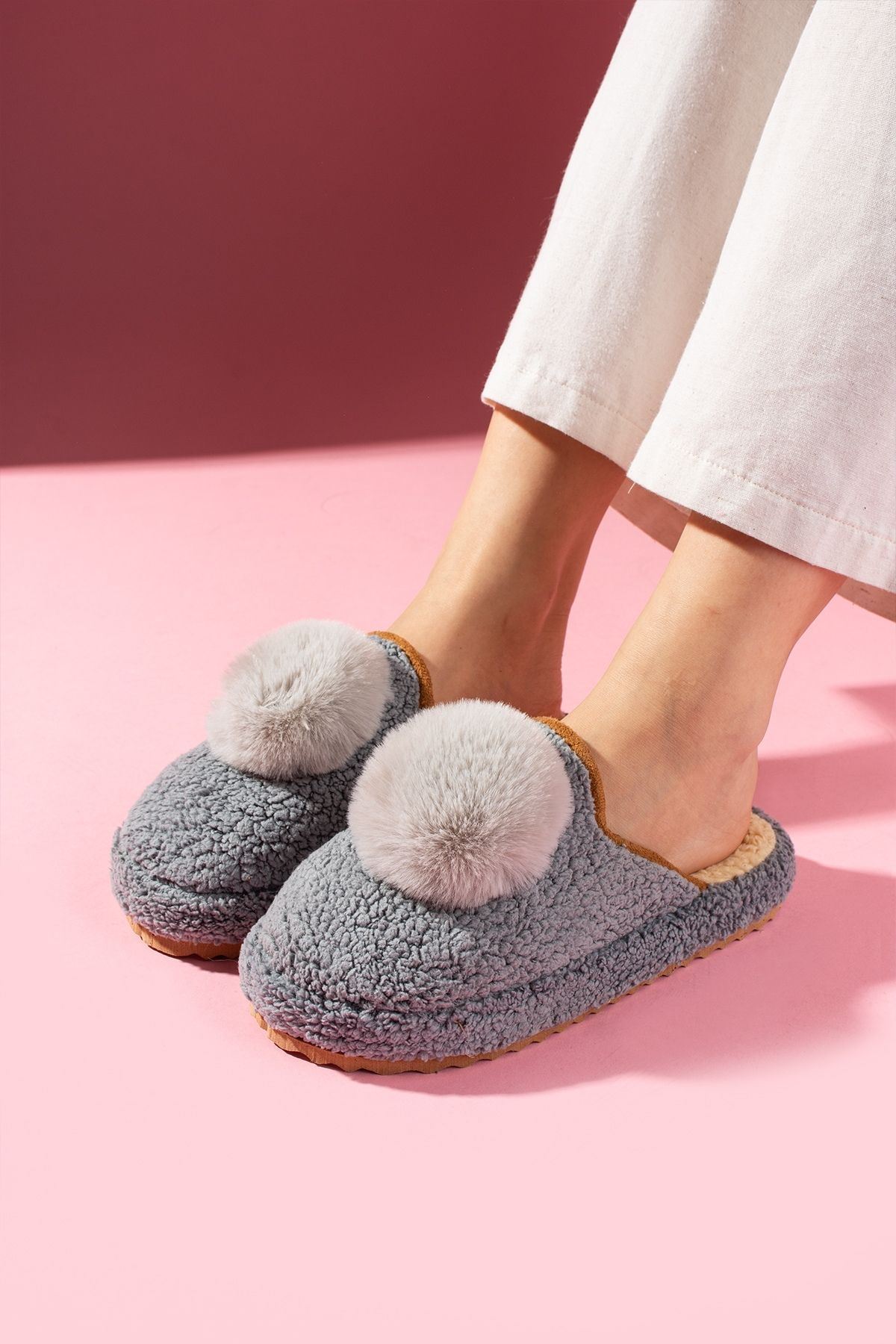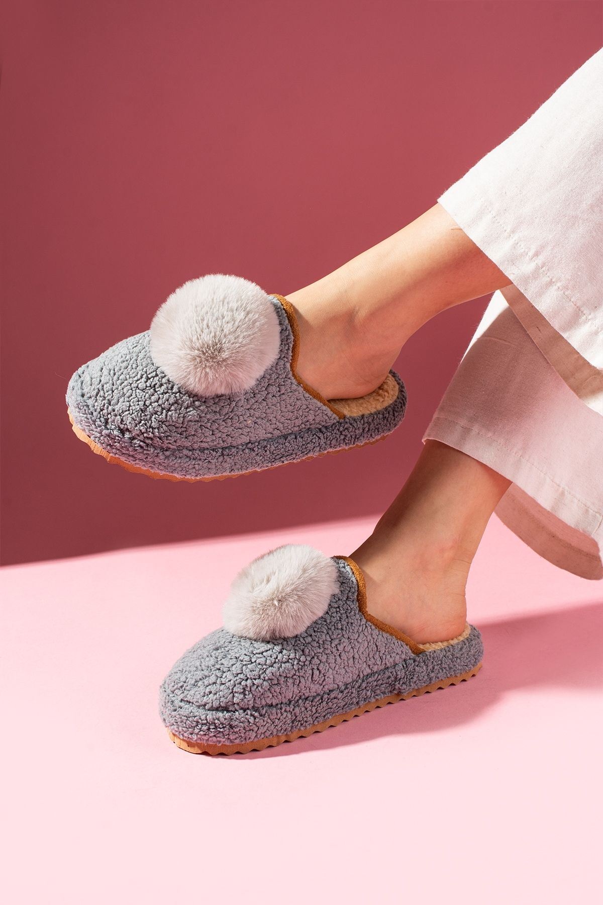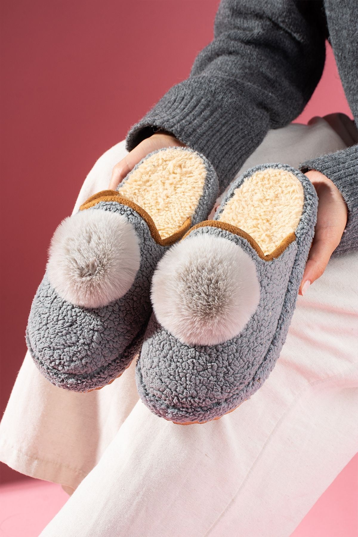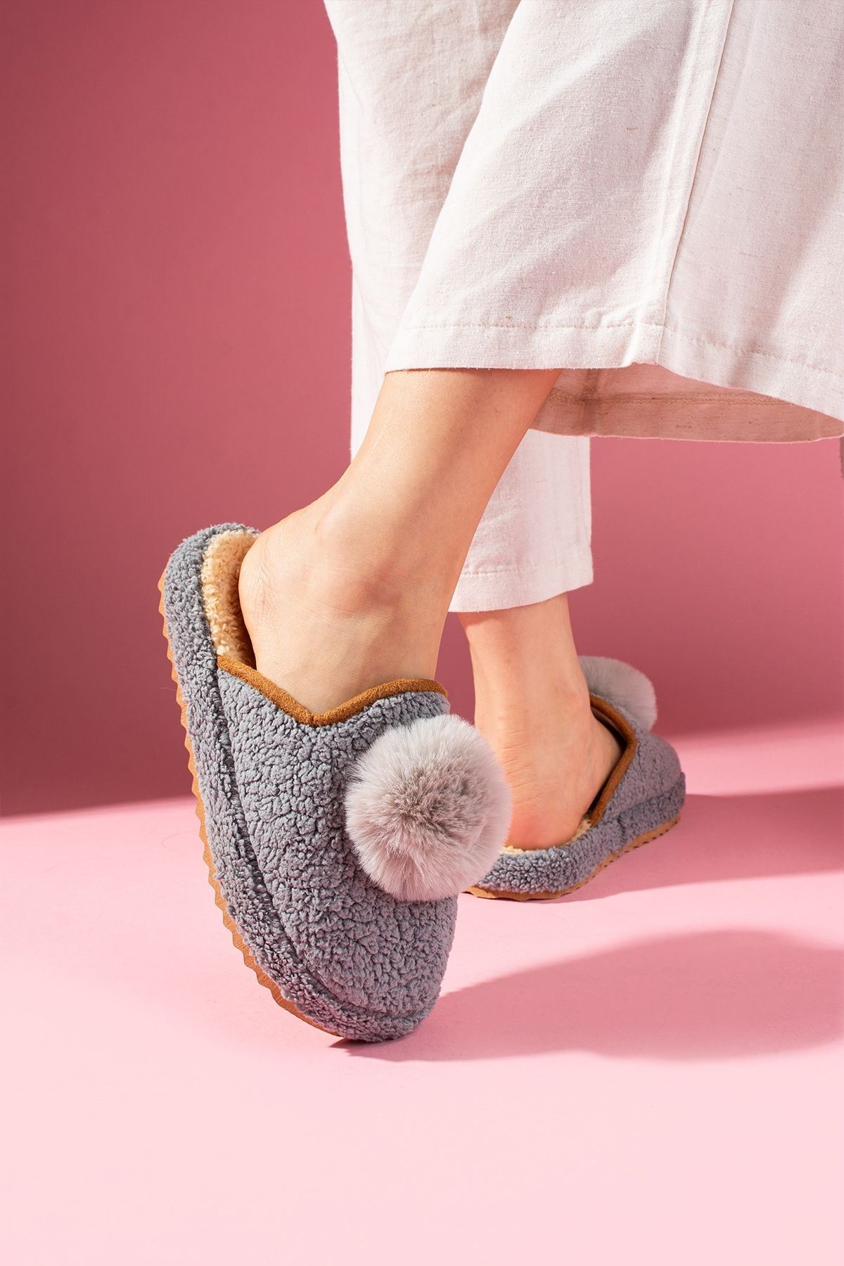 Poffina Gri Ponponlu Saraç Detaylı Sessiz Taban Ev Terliği