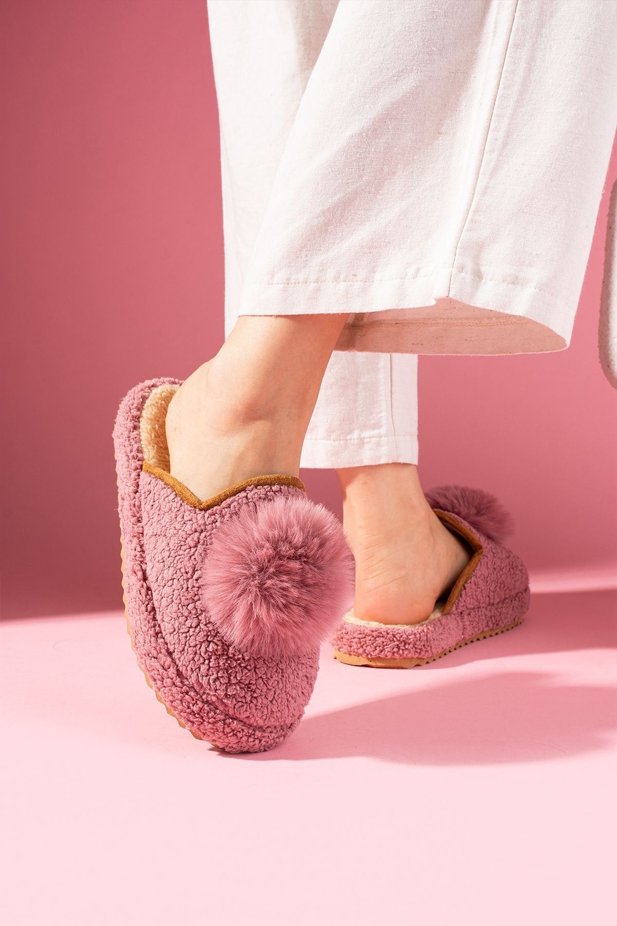 Poffina Pembe Ponponlu Saraç Detaylı Sessiz Taban Ev Terliği