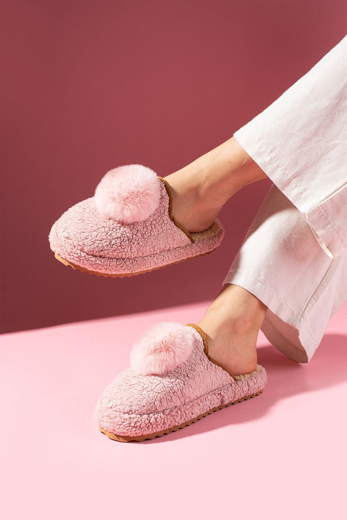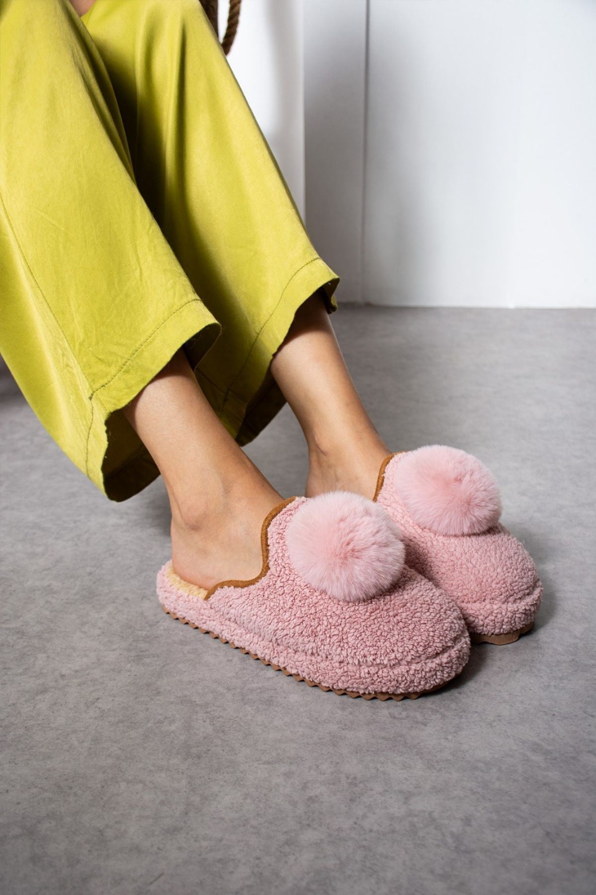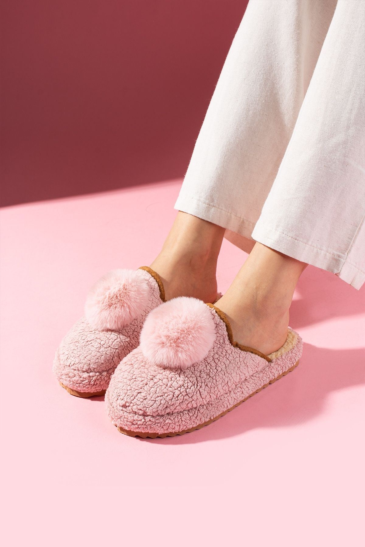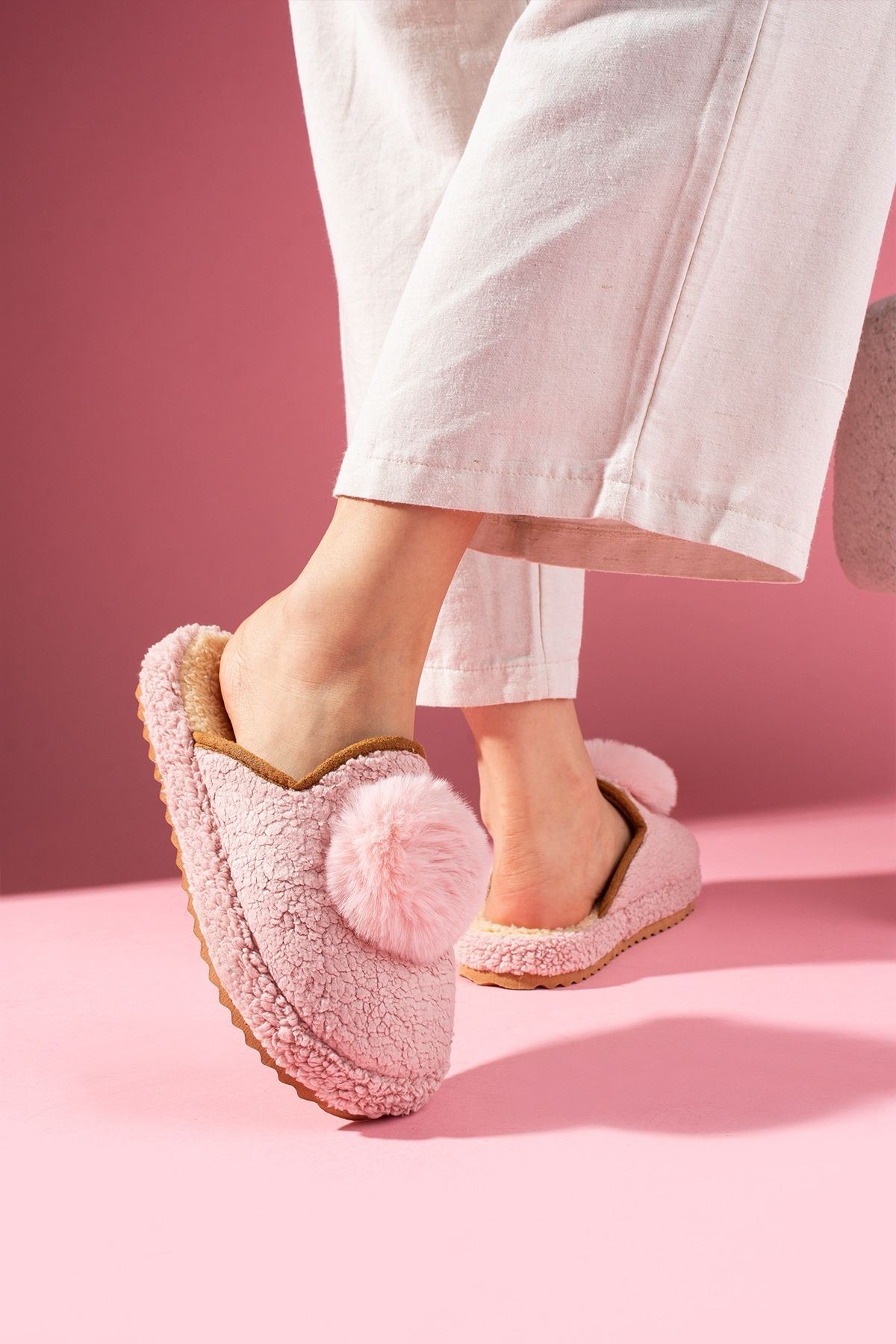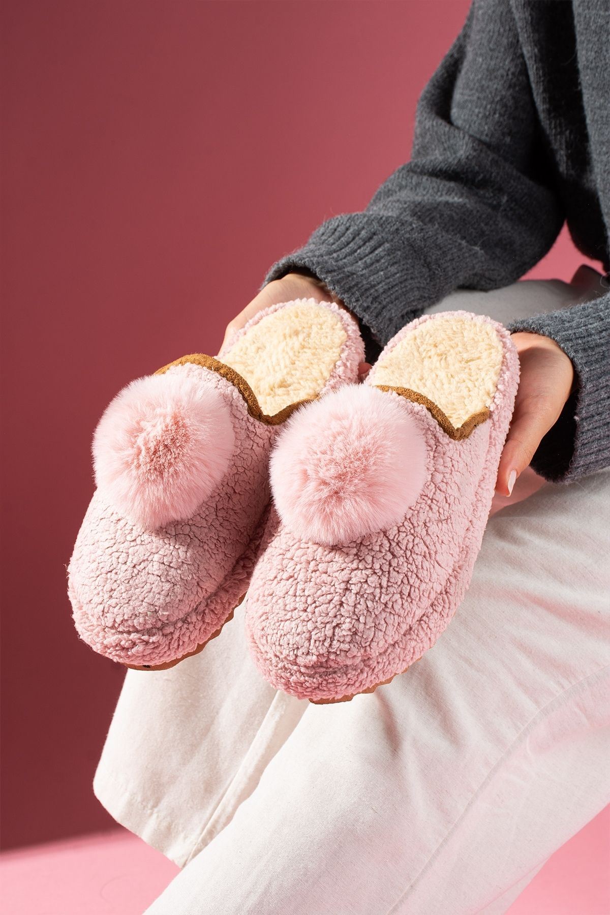 Poffina Pudra Ponponlu Saraç Detaylı Sessiz Taban Ev Terliği