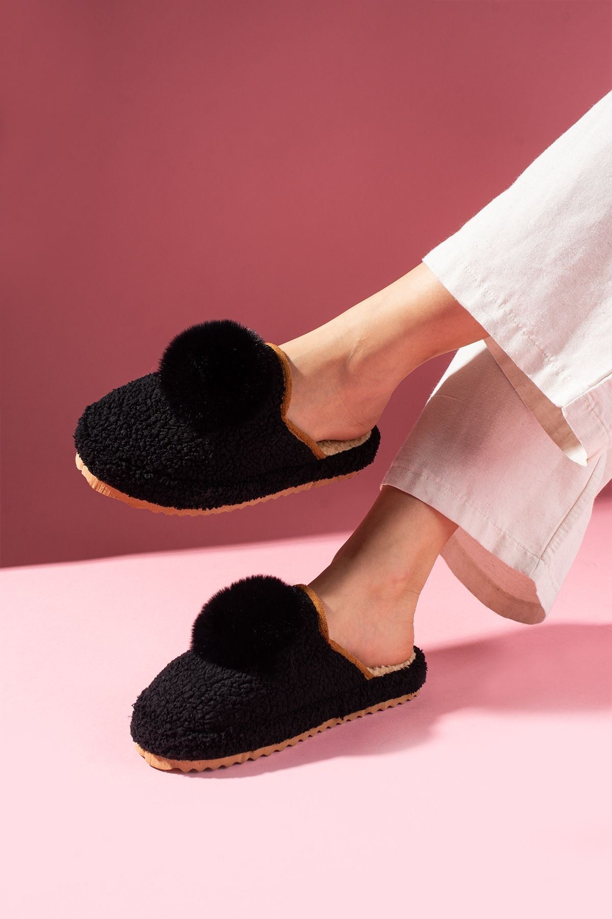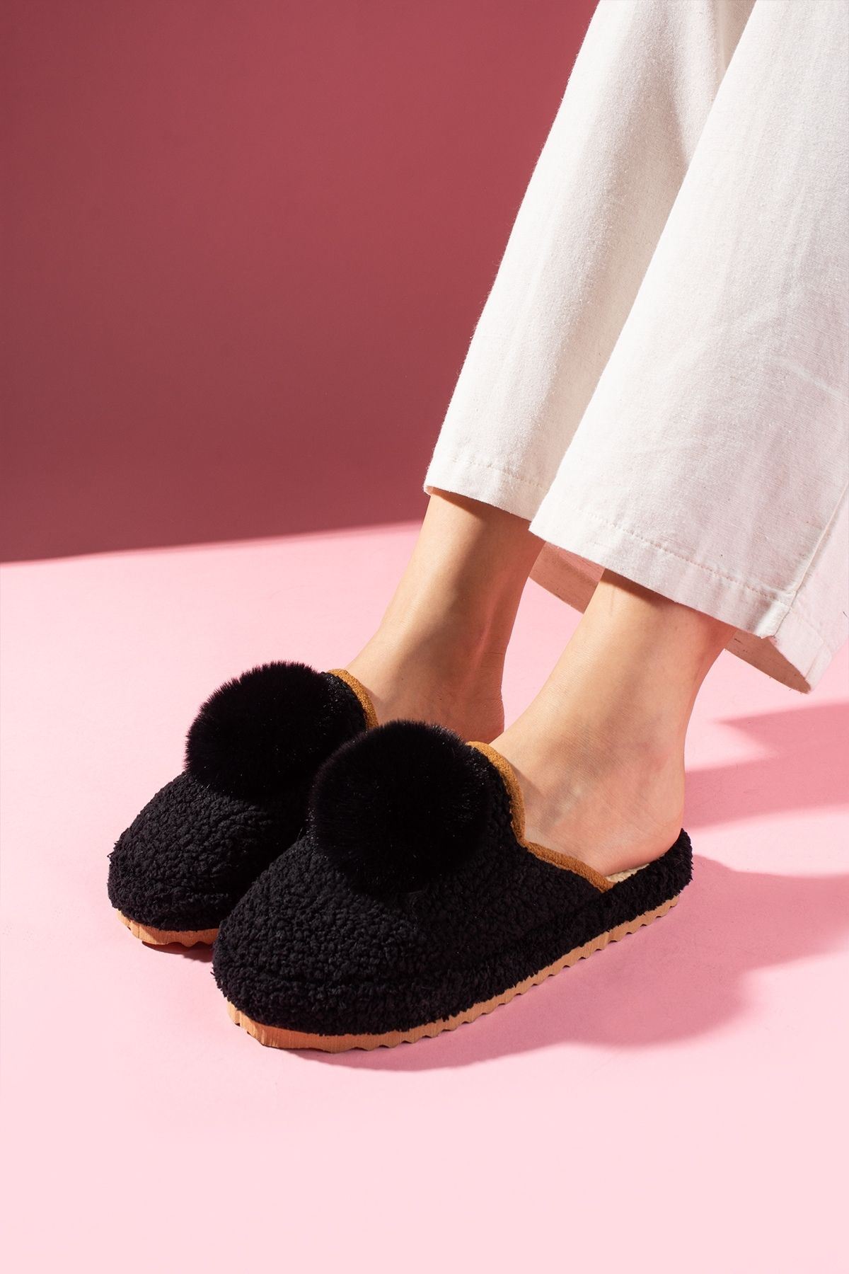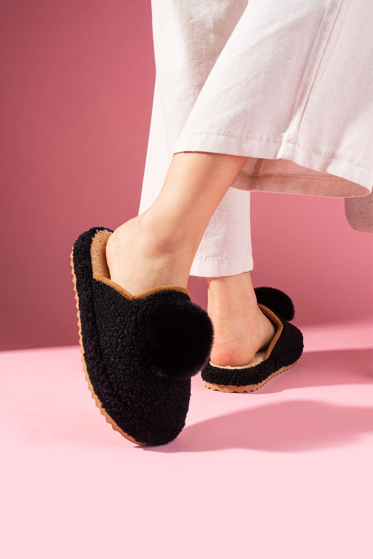 Poffina Siyah Ponponlu Saraç Detaylı Sessiz Taban Ev Terliği