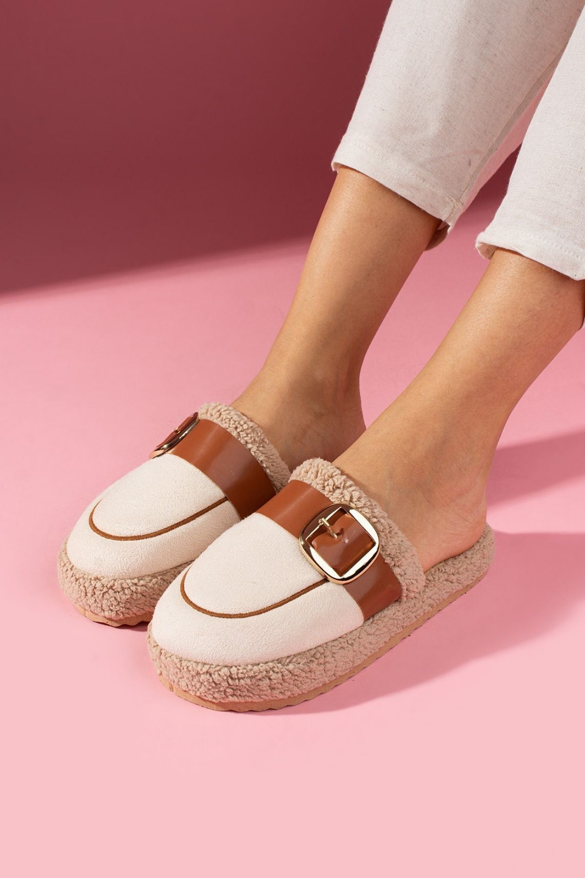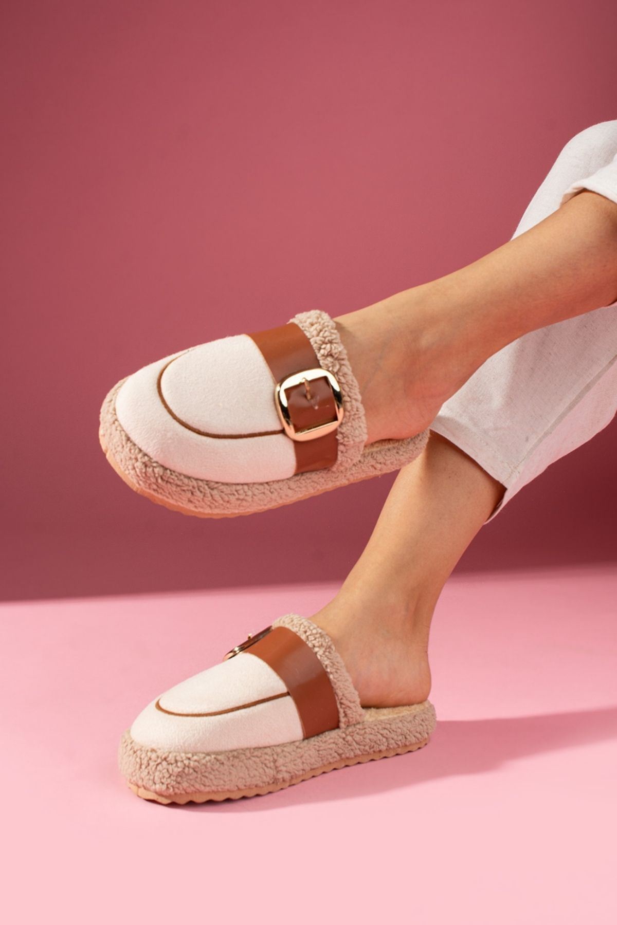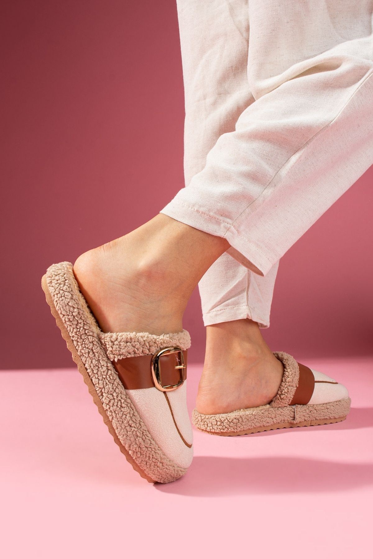 Puffita Bej Gold Tokalı Kemerli Saraç Detaylı Sessiz Taban Ev Terliği