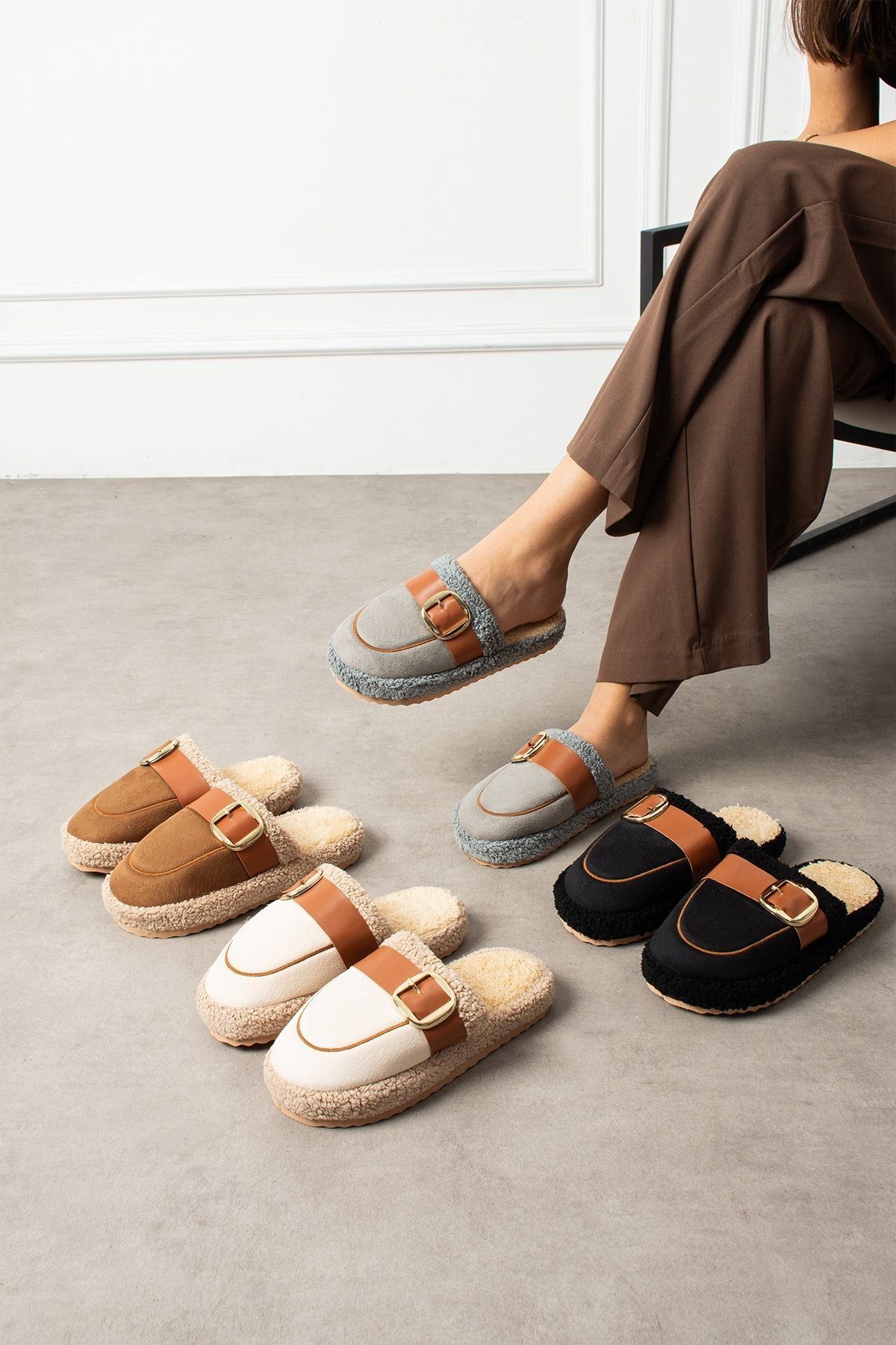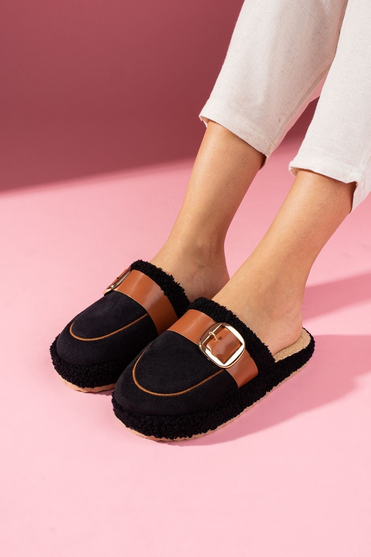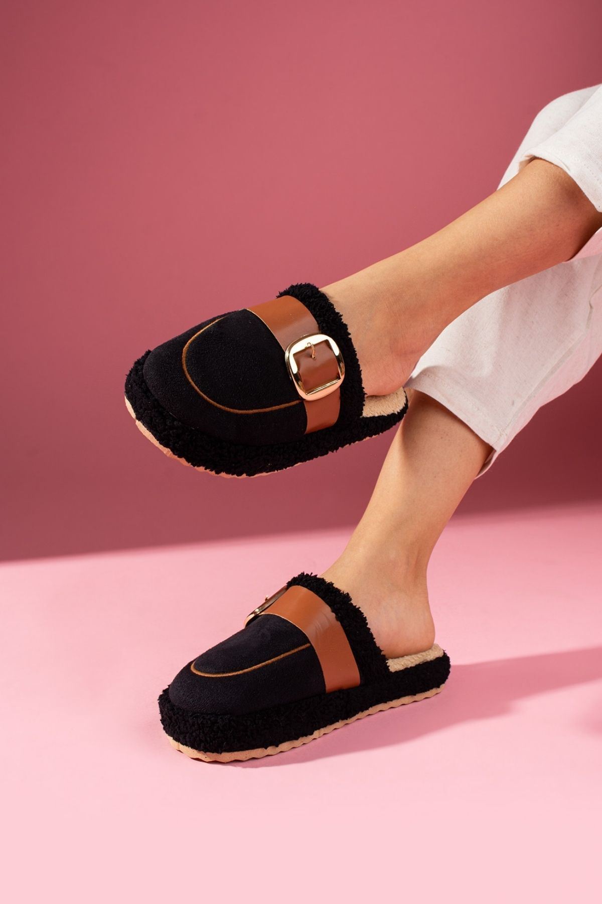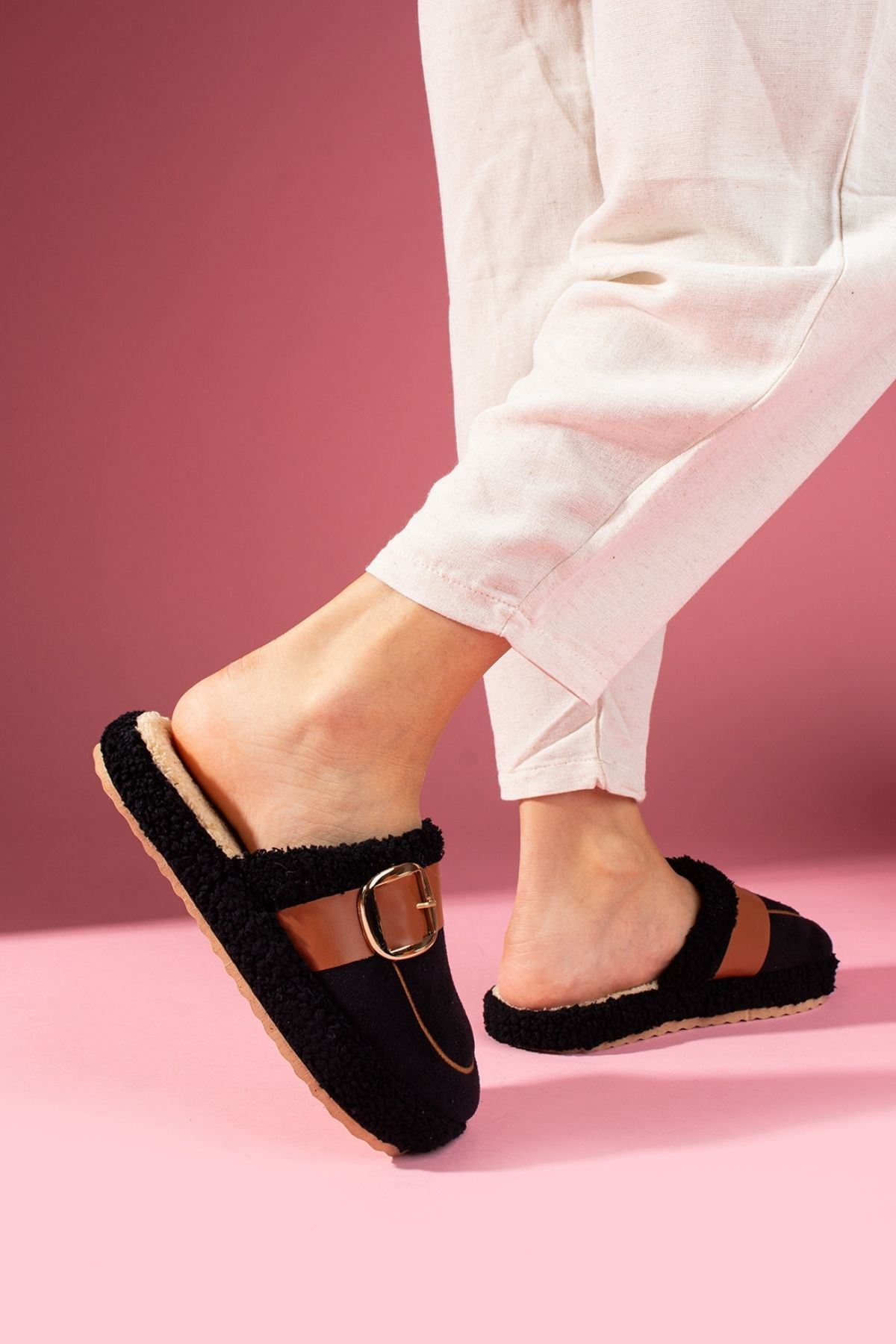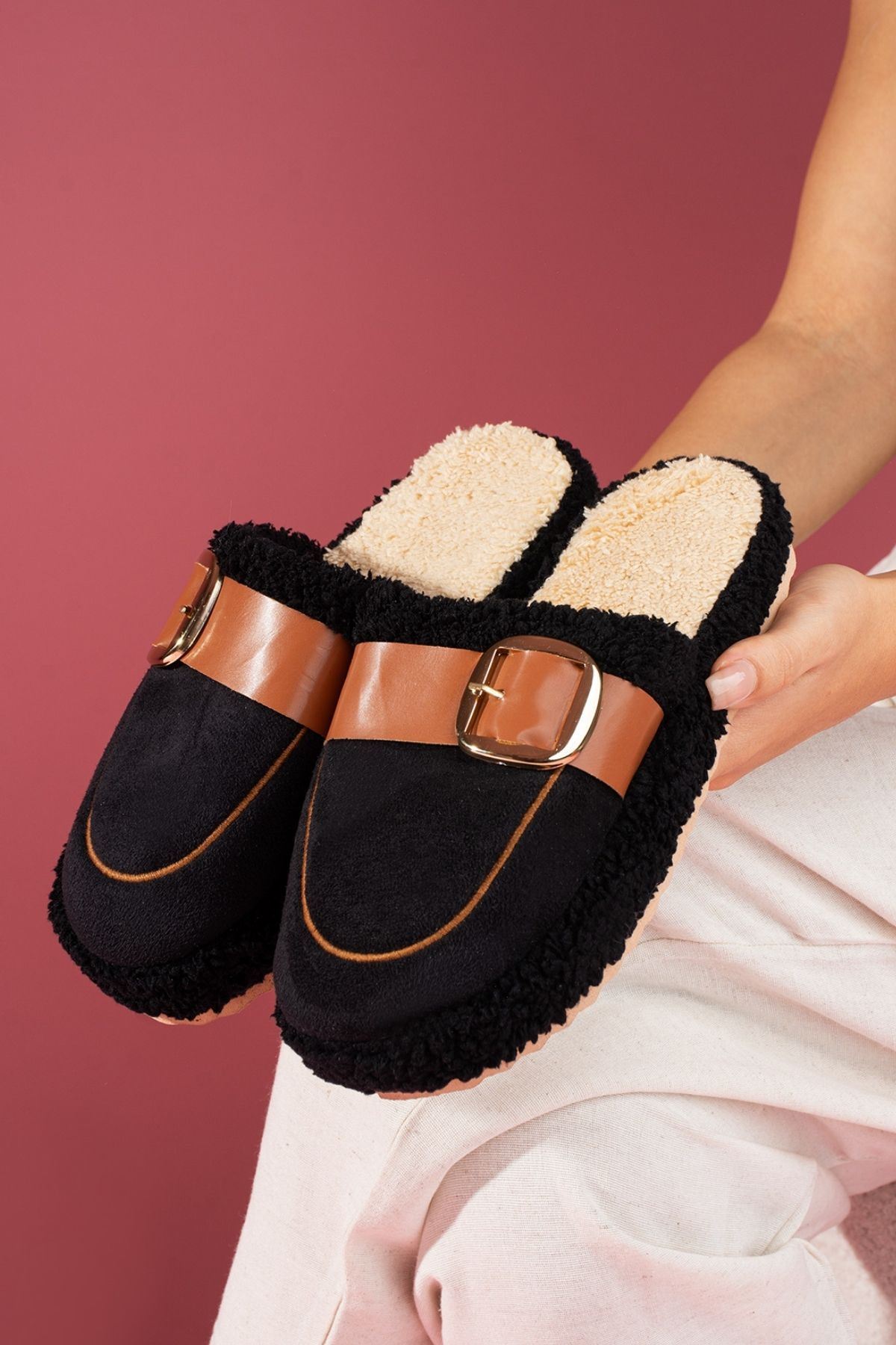 Puffita Siyah Gold Tokalı Kemerli Saraç Detaylı Sessiz Taban Ev Terliği