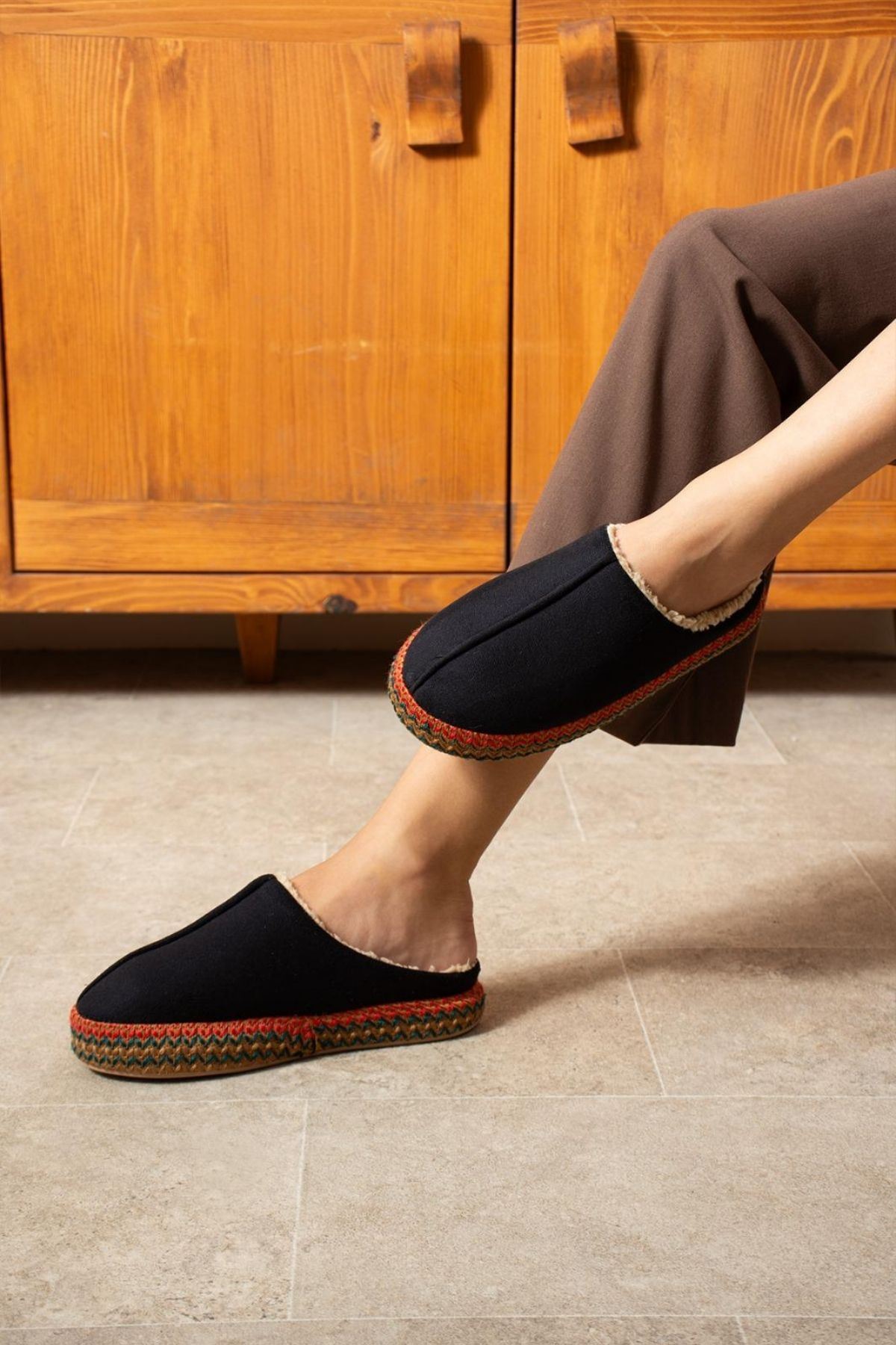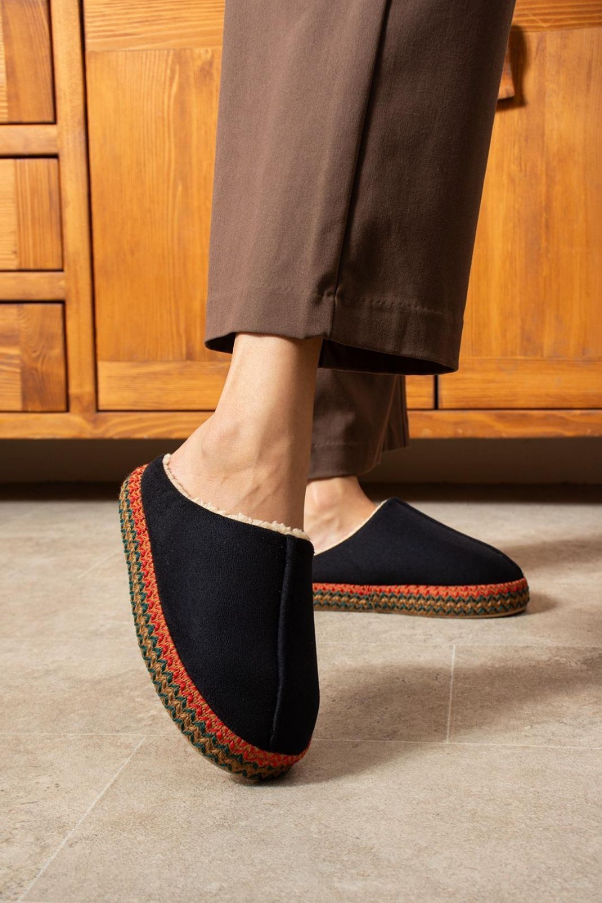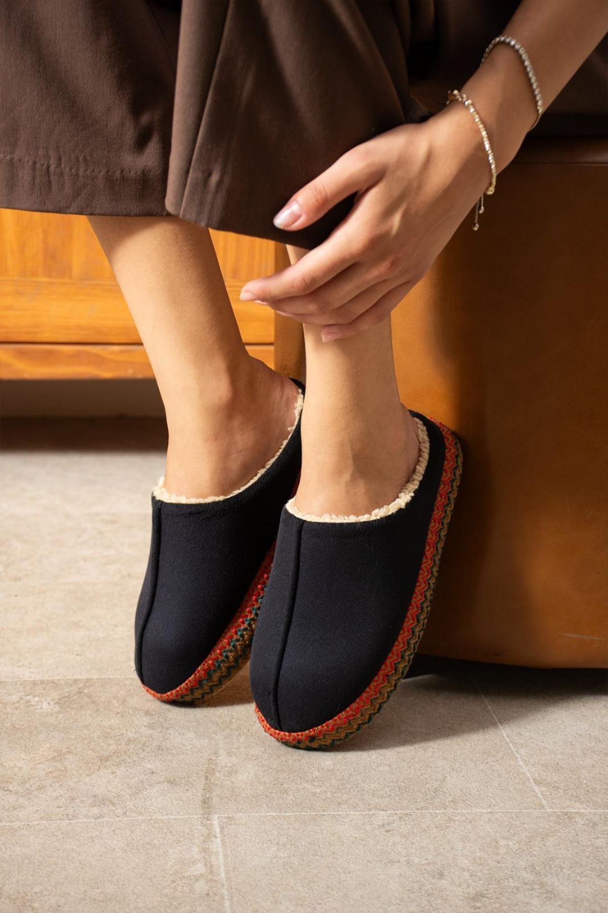 Raffy Siyah Süet Dikiş Detaylı Yarı Kapalı Sessiz Kaymaz Şerit Kaplamalı Thermo Taban Ev Terliği
