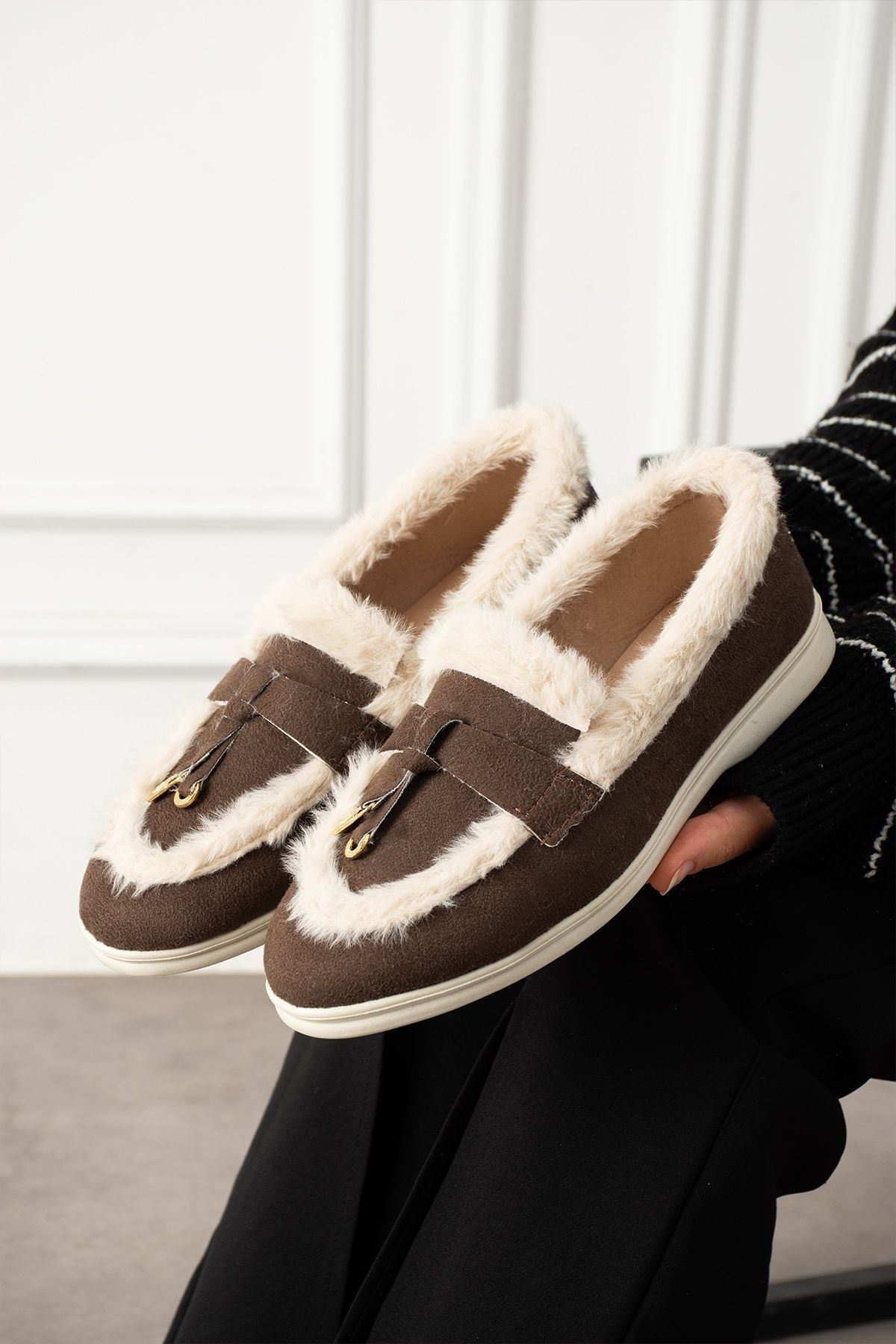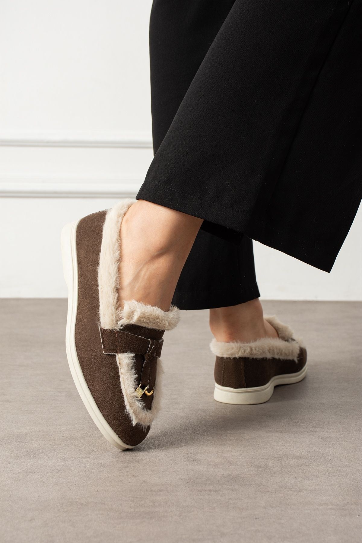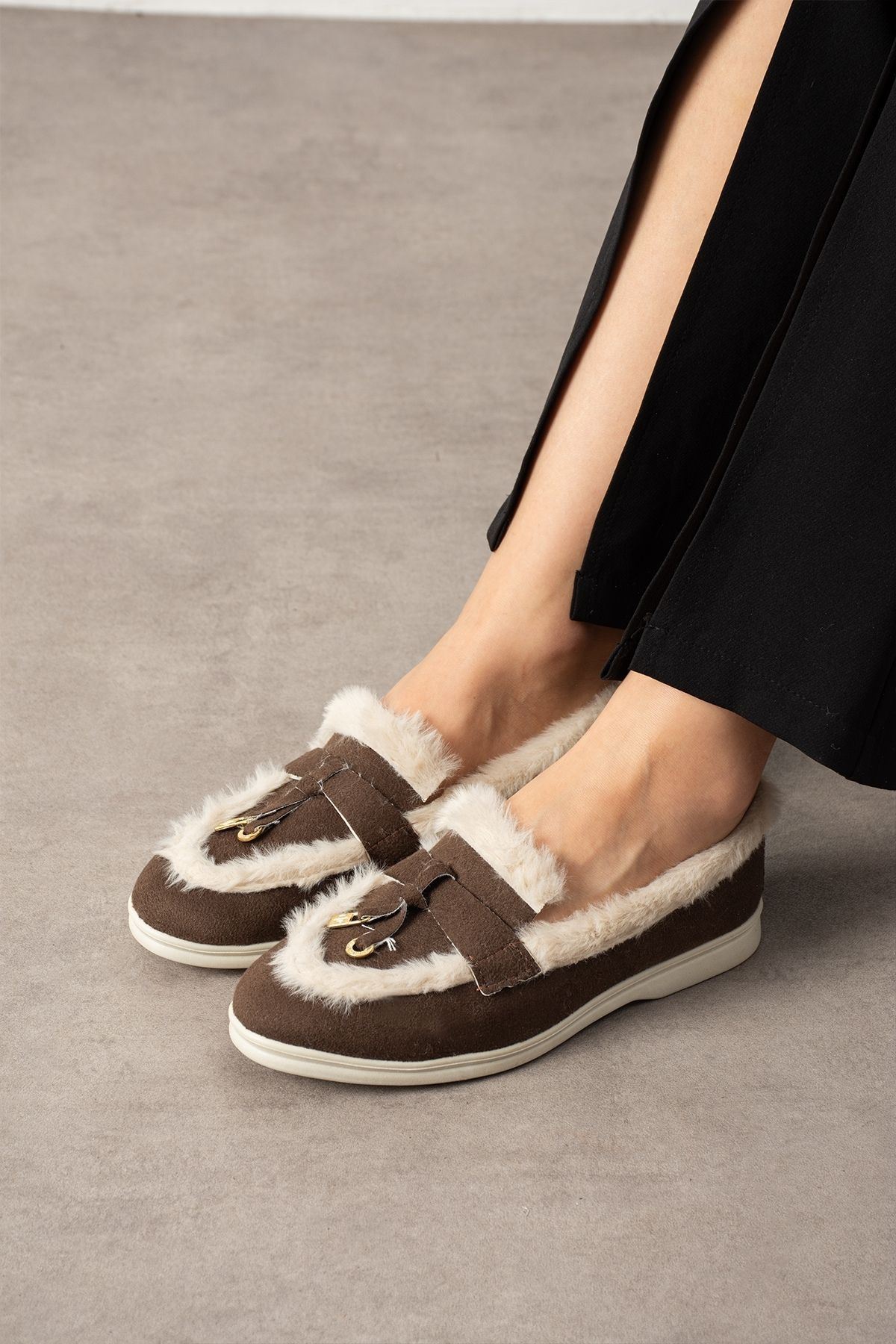 Ravon Kahverengi Süet Mini Aksesuarlı Peluş Şerit Detaylı Loafer Babet Günlük Ayakkabı