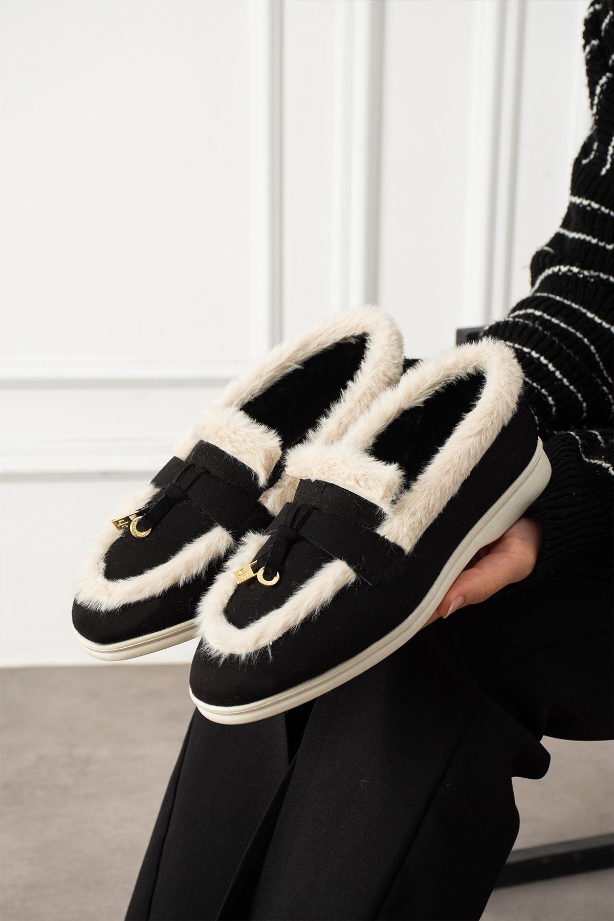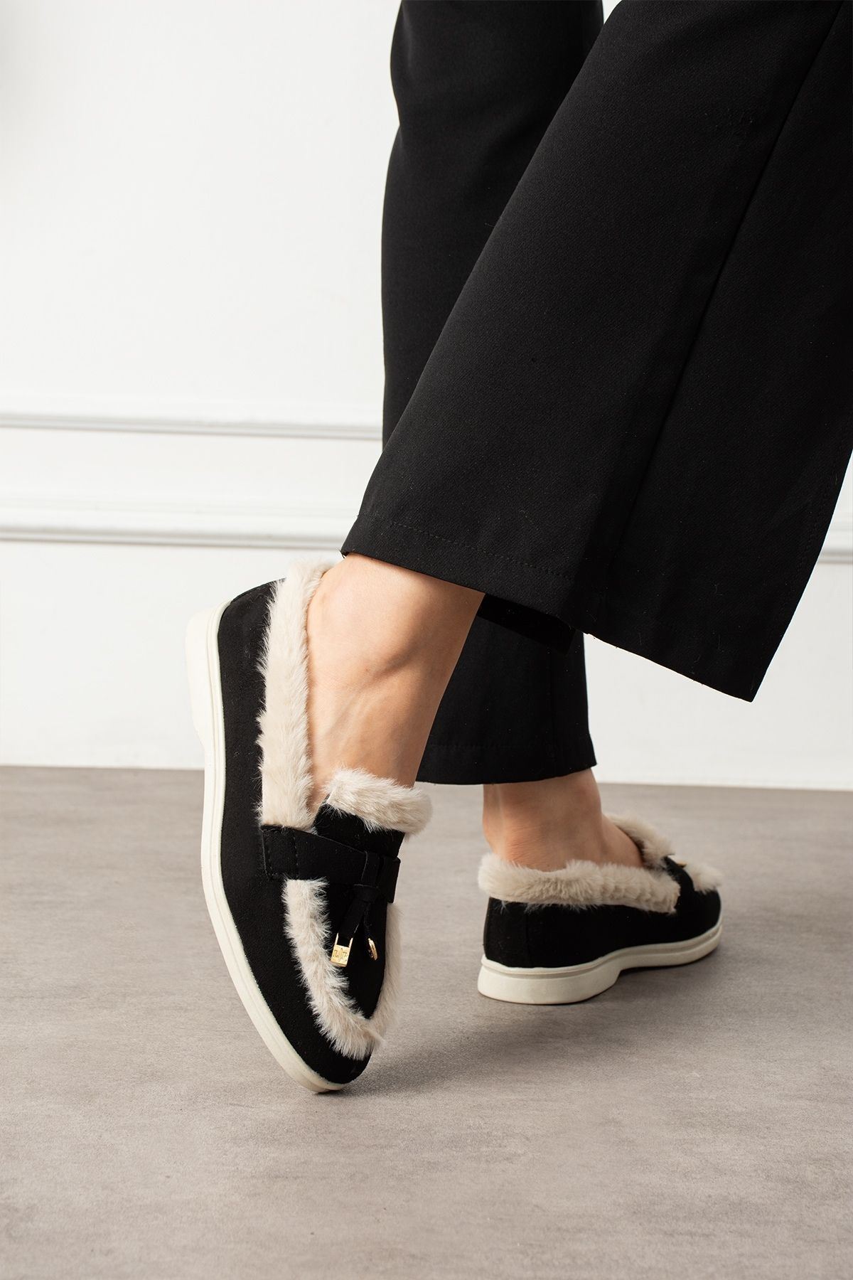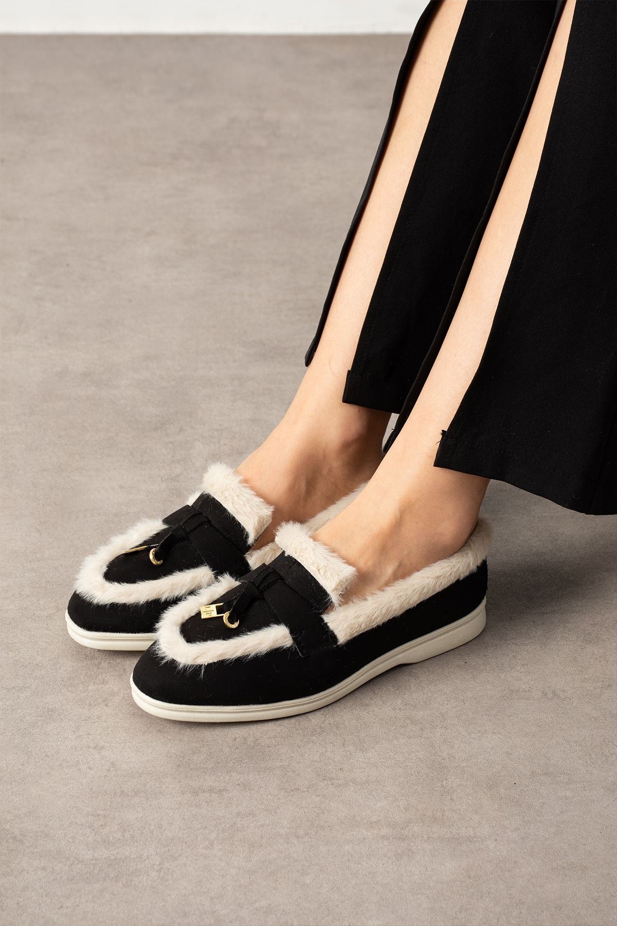 Ravon Siyah Bej Süet Mini Aksesuarlı Peluş Şerit Detaylı Loafer Babet Günlük Ayakkabı