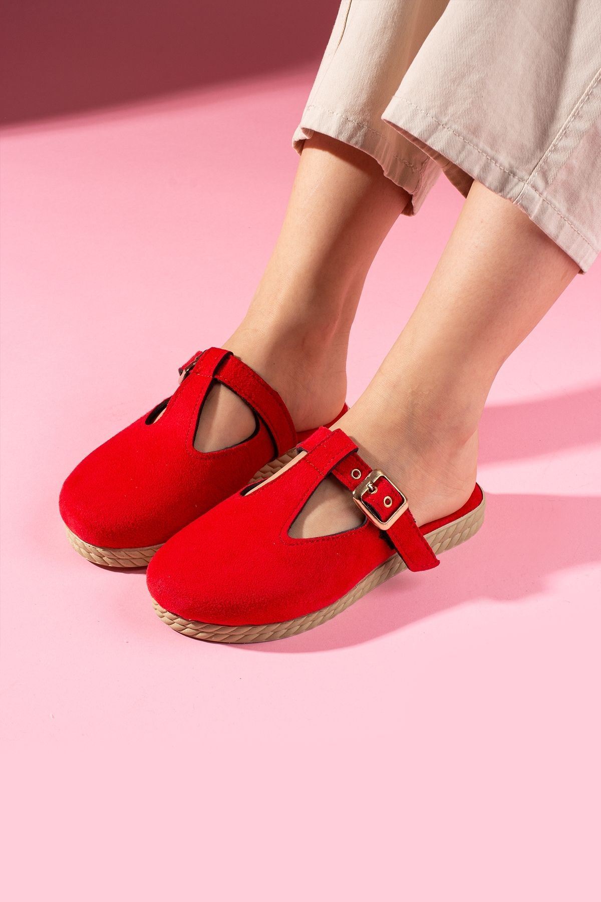 Sabrosa Kırmızı Süet Tokalı Önü Kapalı Kadın Ev Terliği