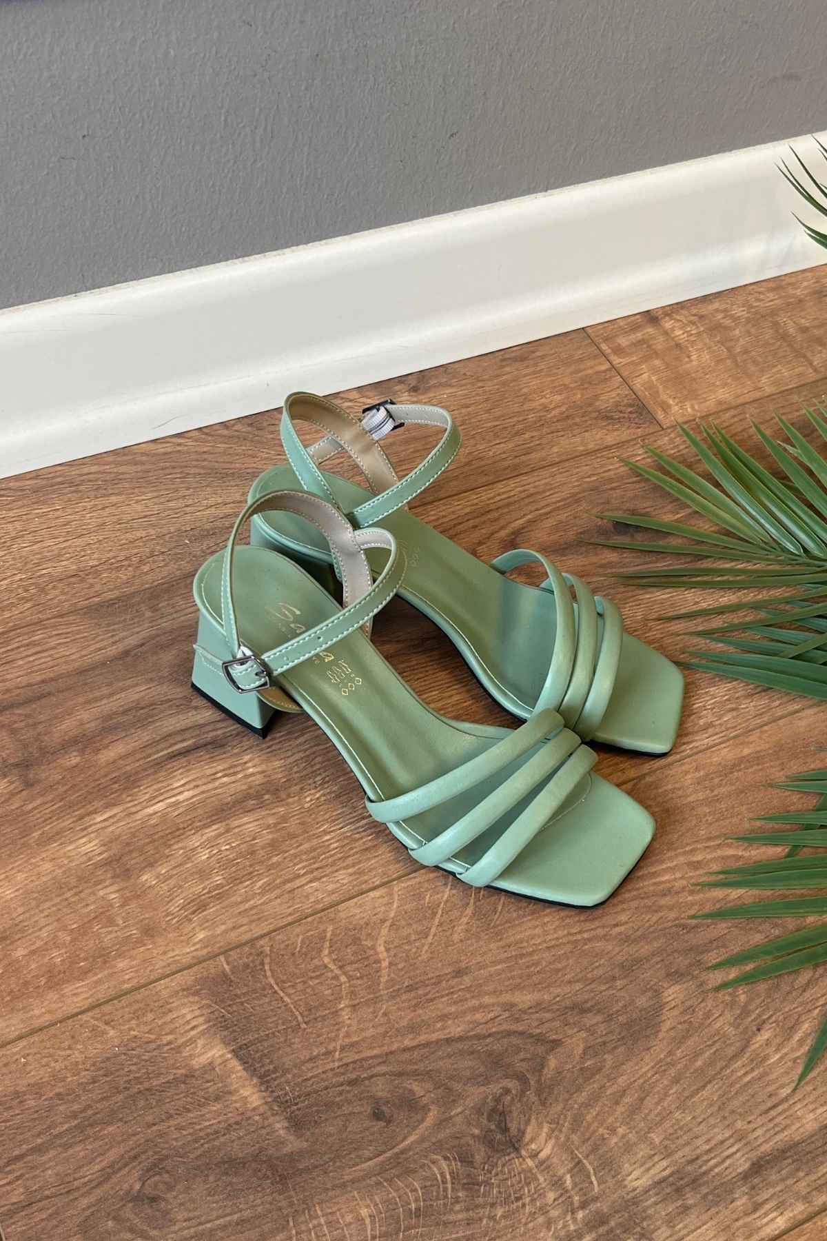 Norma Yeşil Bilekten Kemerli Verev Bantlı Topuklu Sandalet