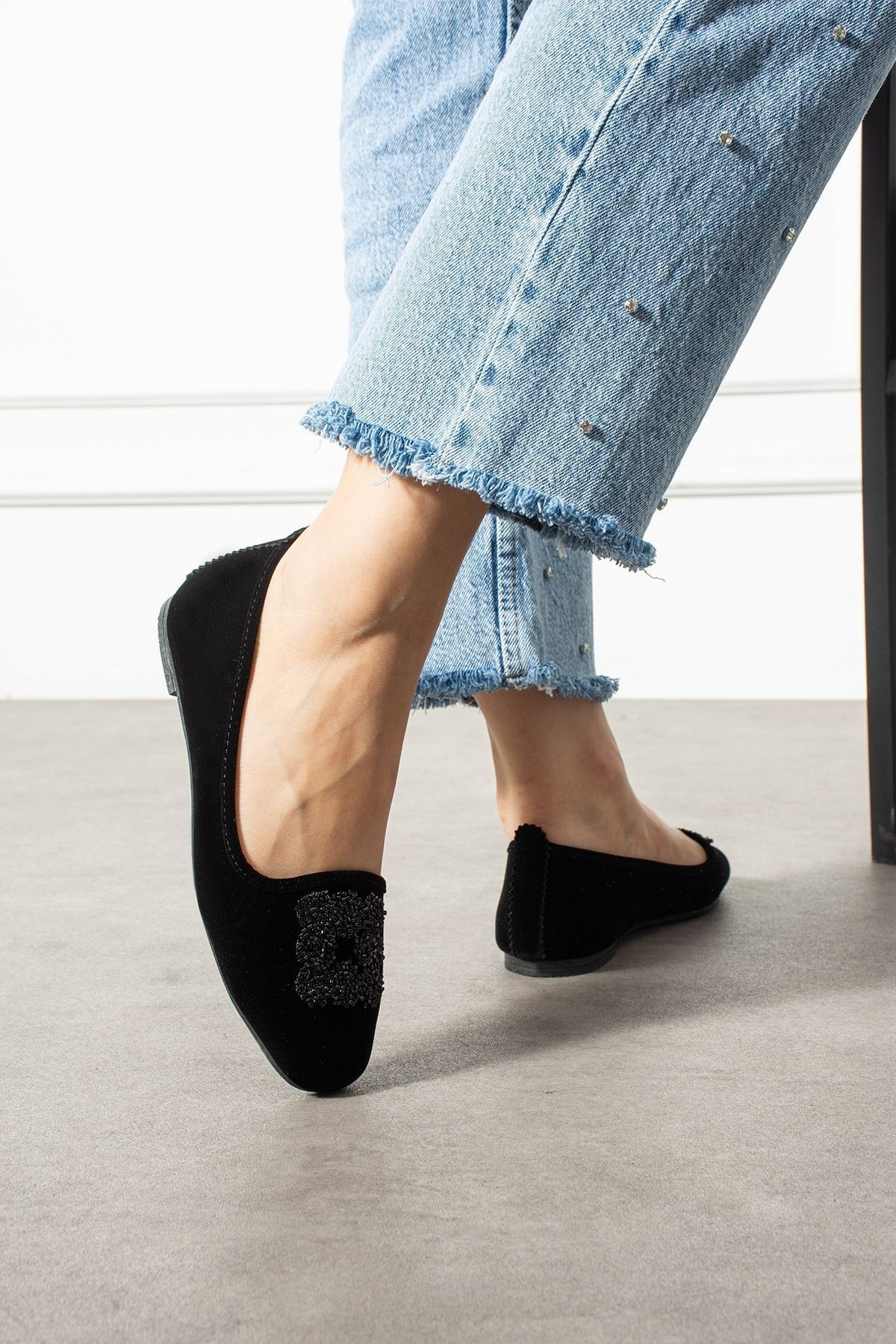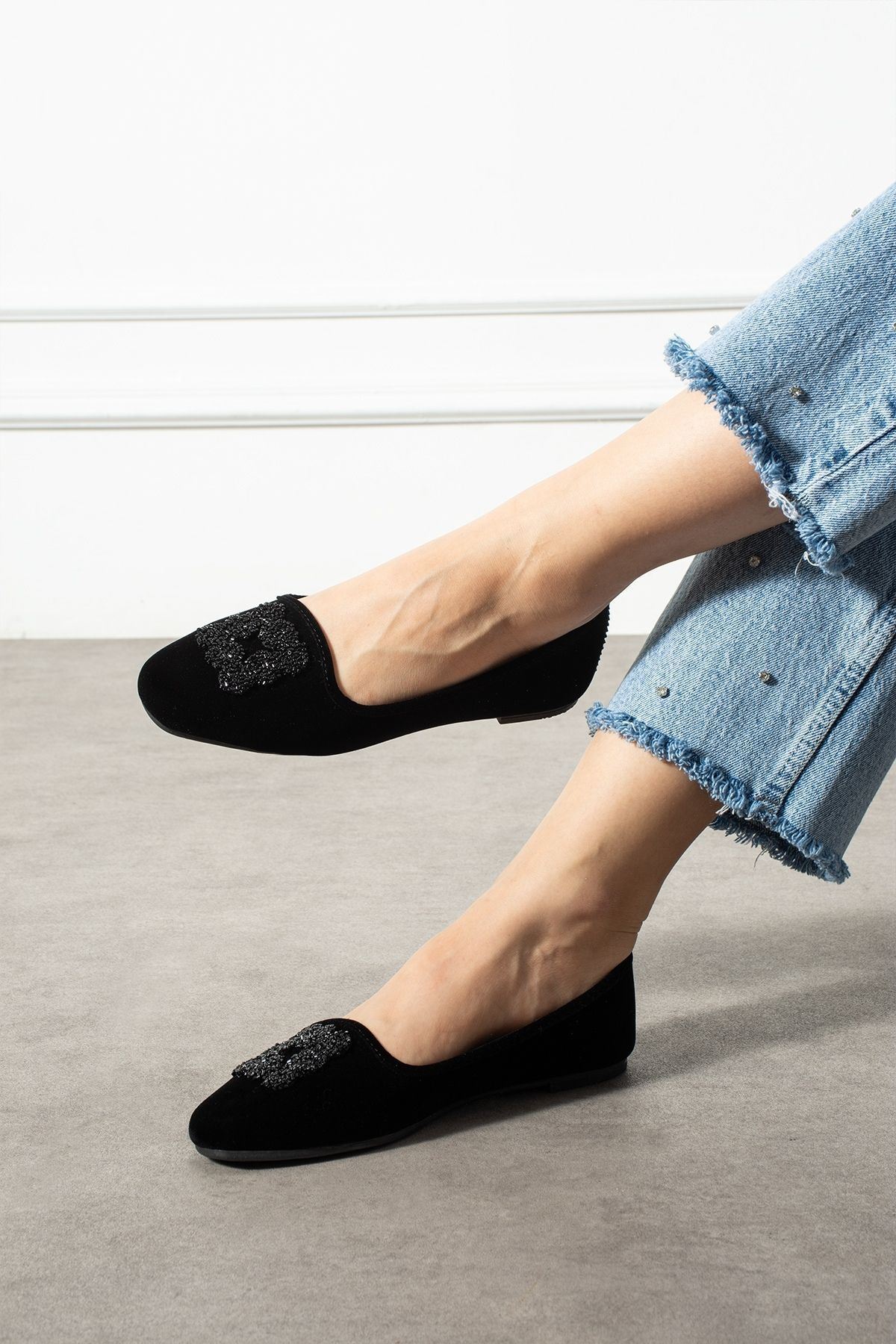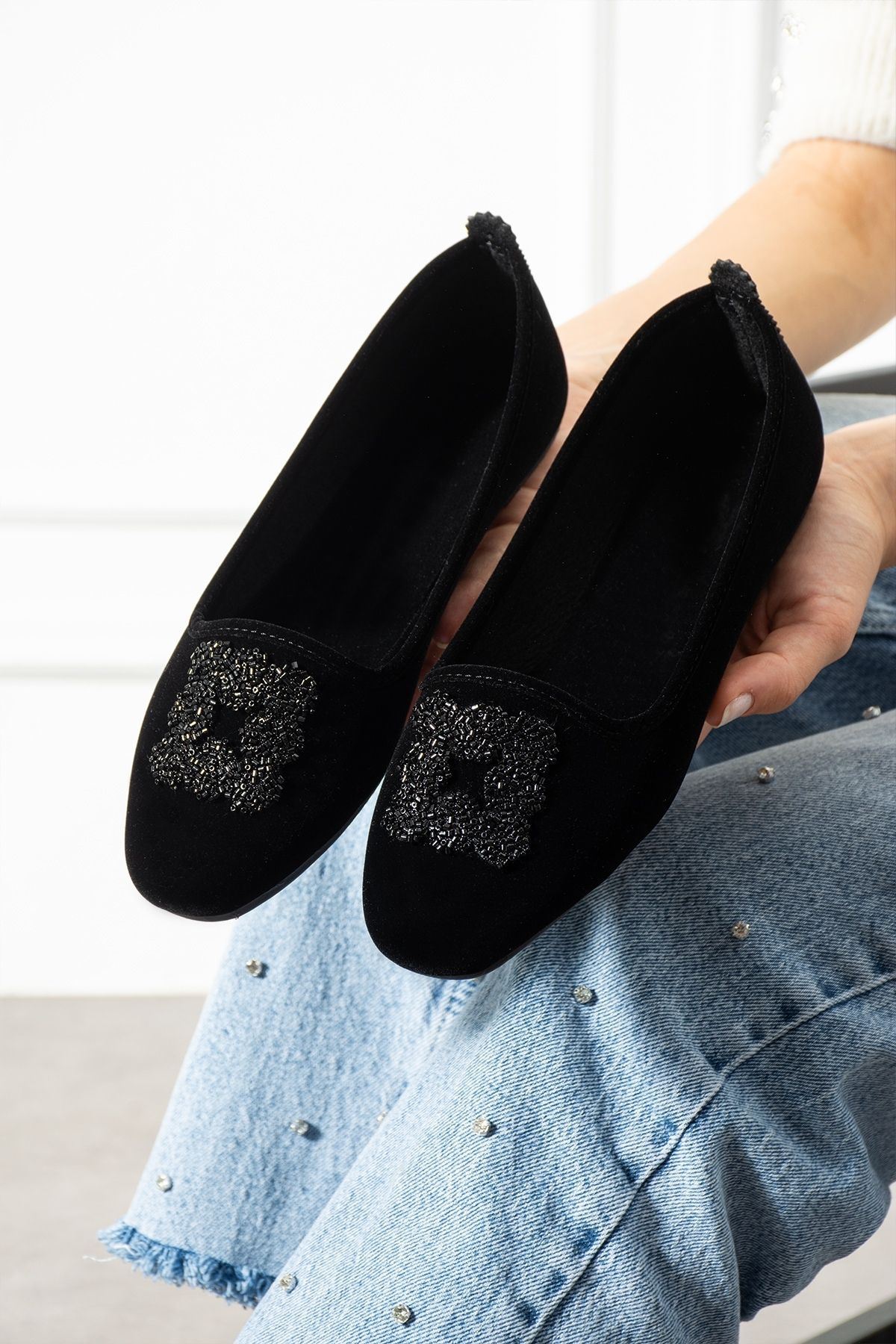 Babel Siyah Kristal Yuvarlak Taş İşlemeli Önü Kapalı Elegant Ev Terliği