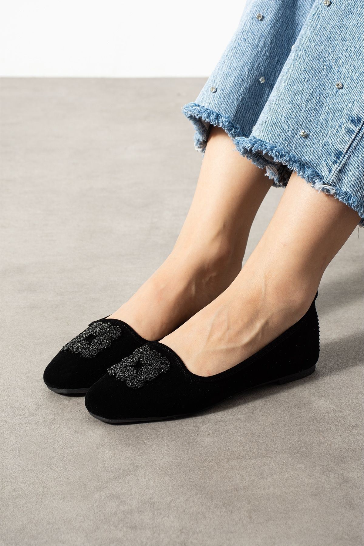 Perly Siyah Kroko Desenli İnci Bant Aksesuarlı Babet