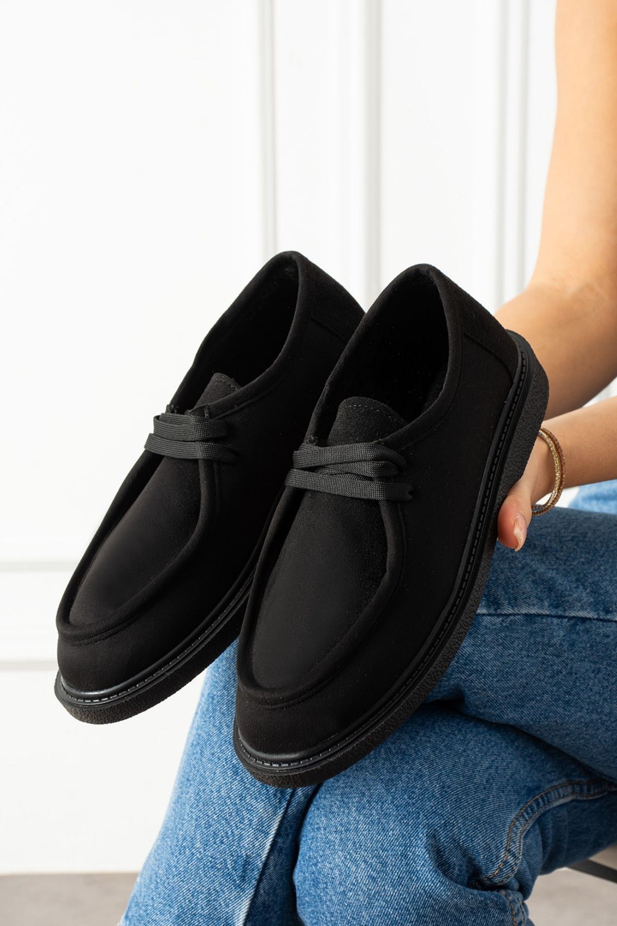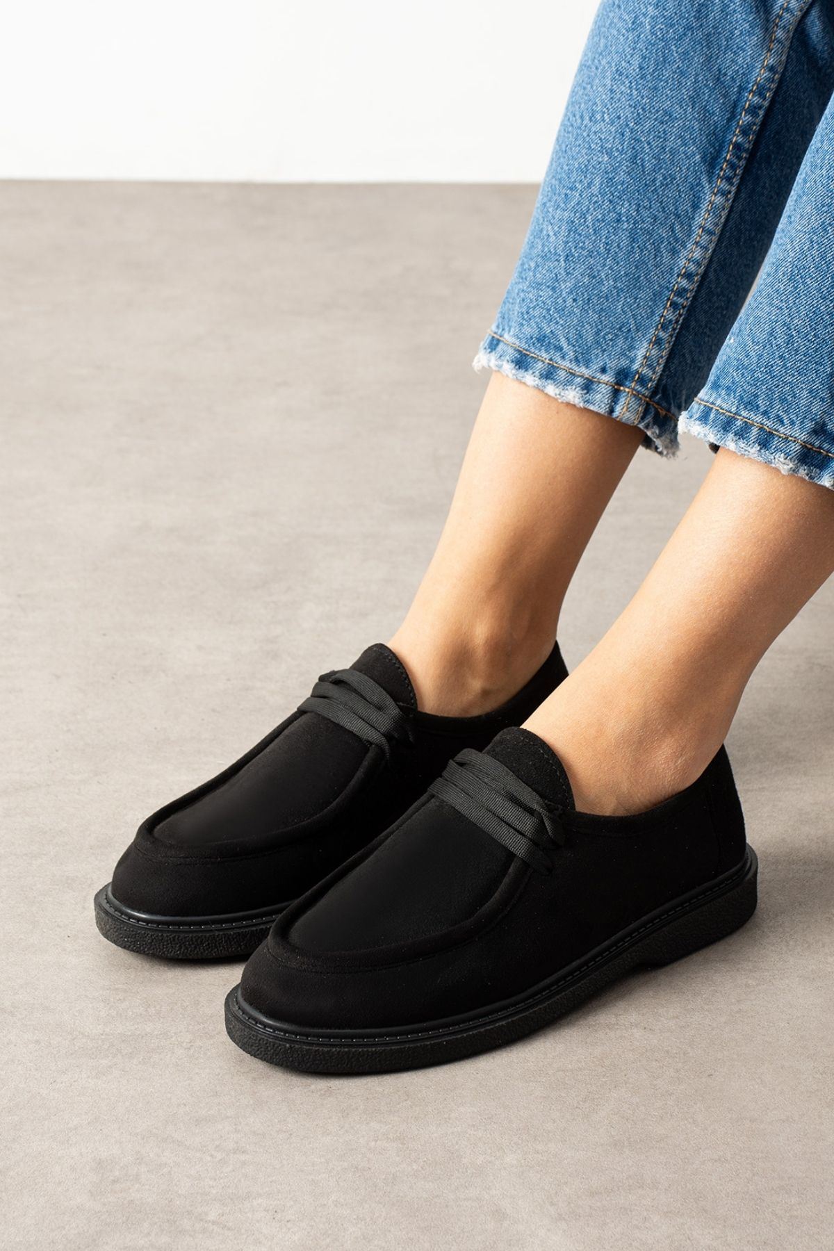 Vareon Siyah Süet Bağcıklı Kalın Saraç Detaylı Loafer Babet Günlük Ayakkabı