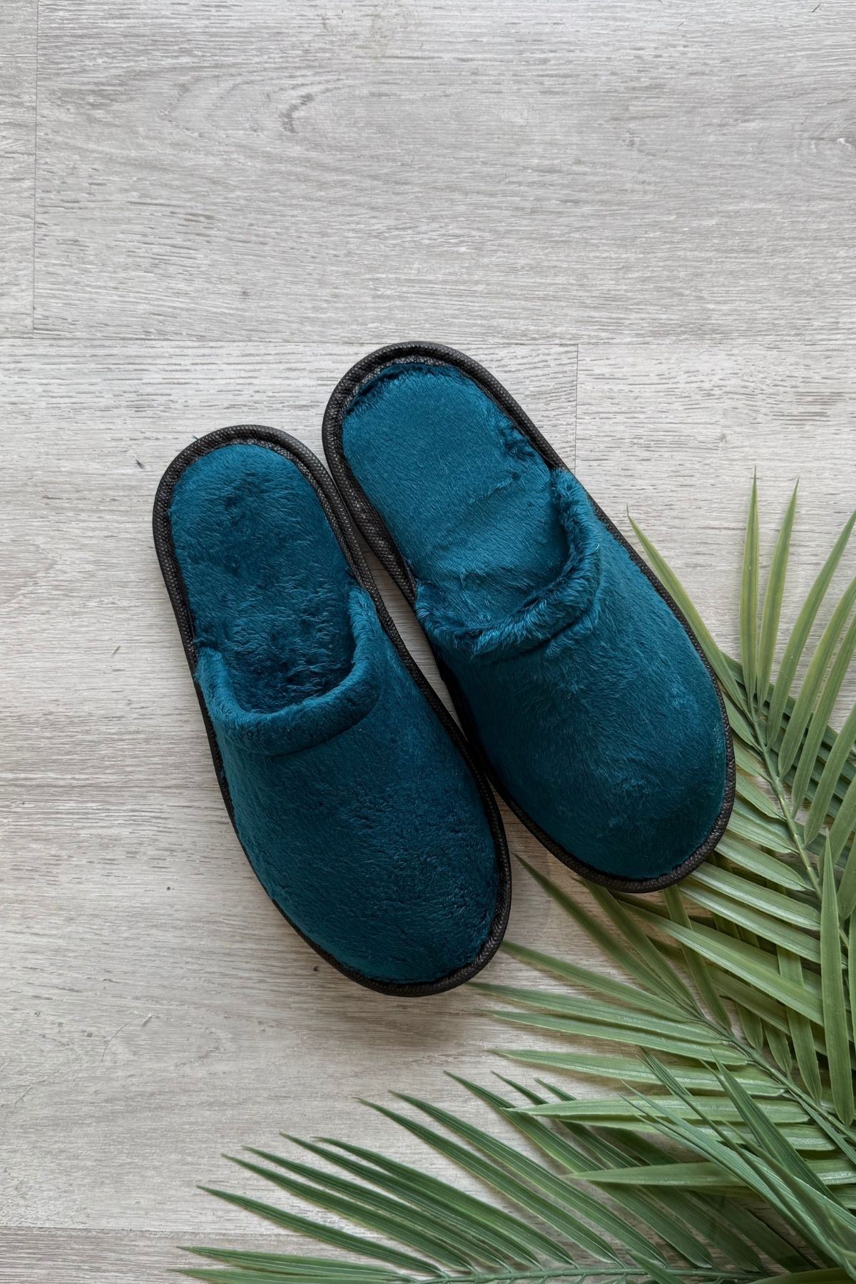 Velin Petrol Mavisi İçi Tüylü Önü Kapalı Ev Terliği