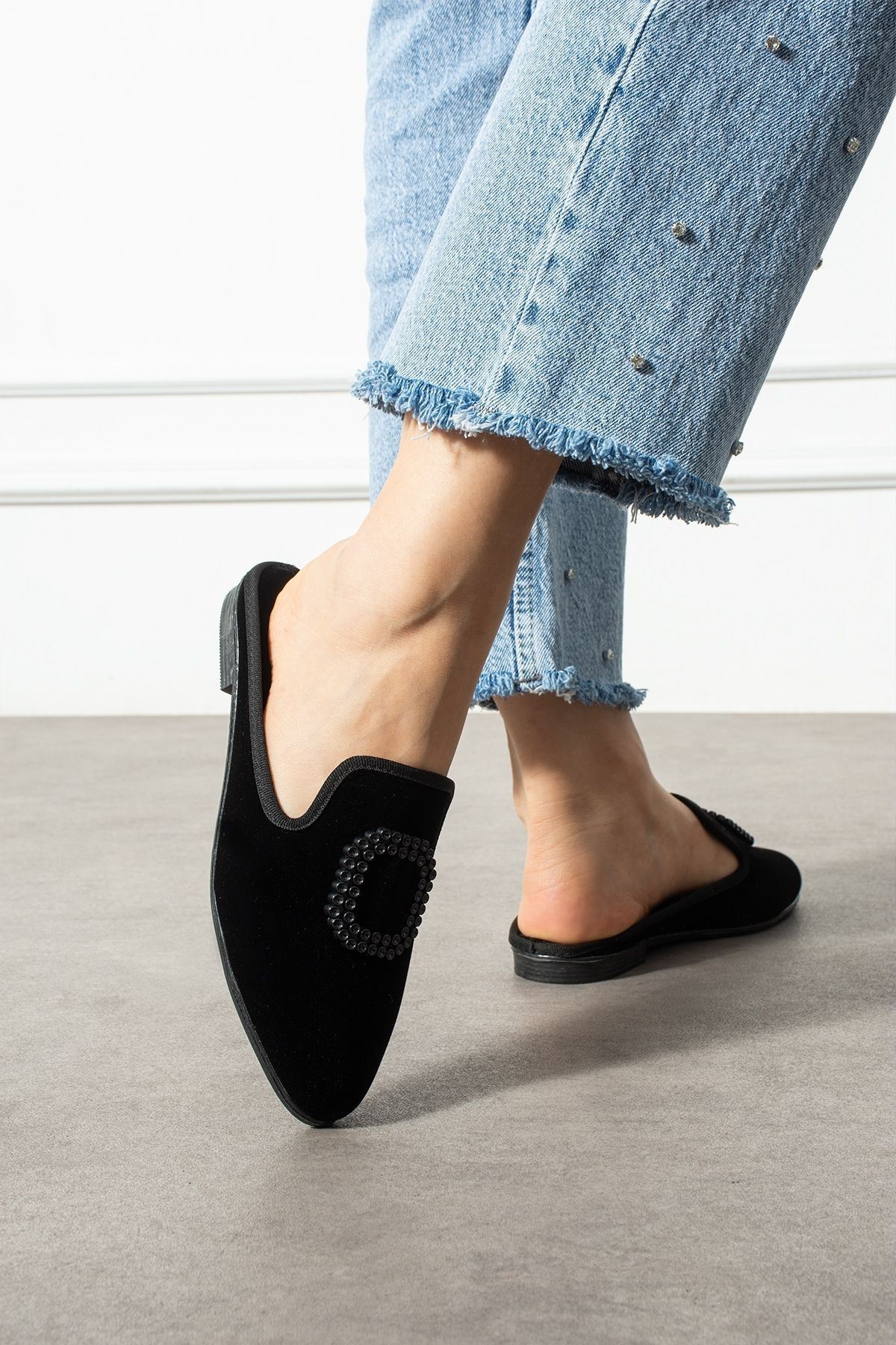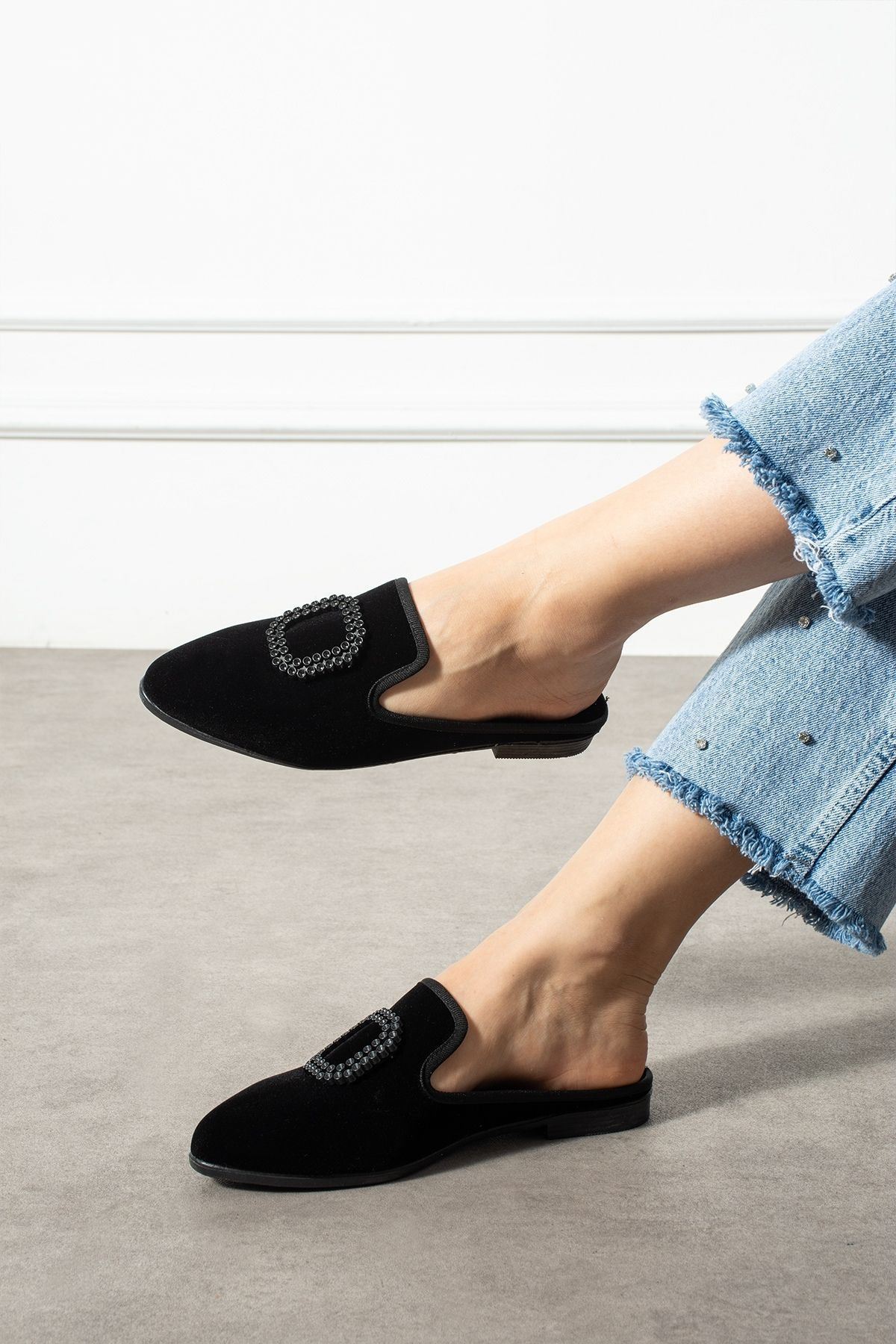 Zaffi Siyah Tokalı Kadife Dokulu Elegant Nişan Çeyiz Bohça Misafir Ev Terliği