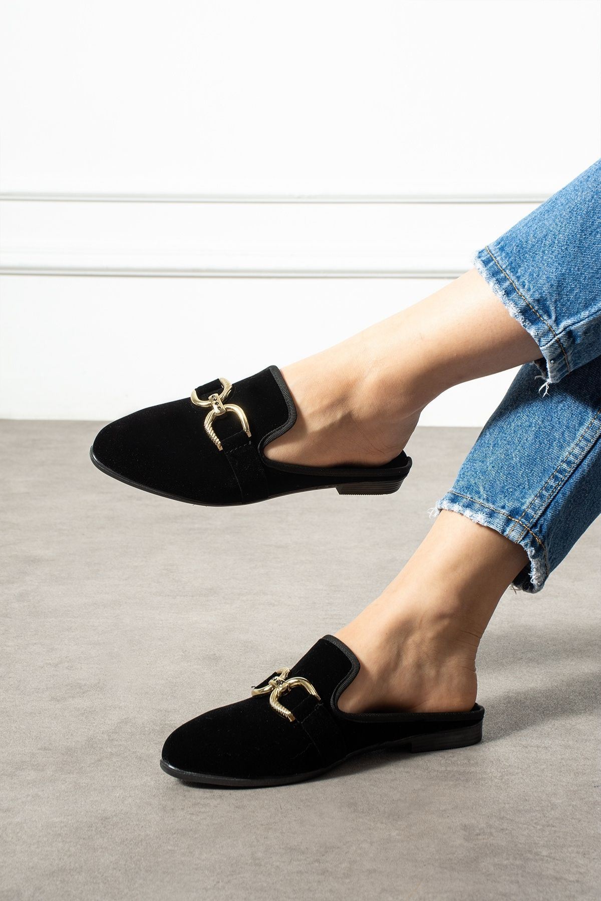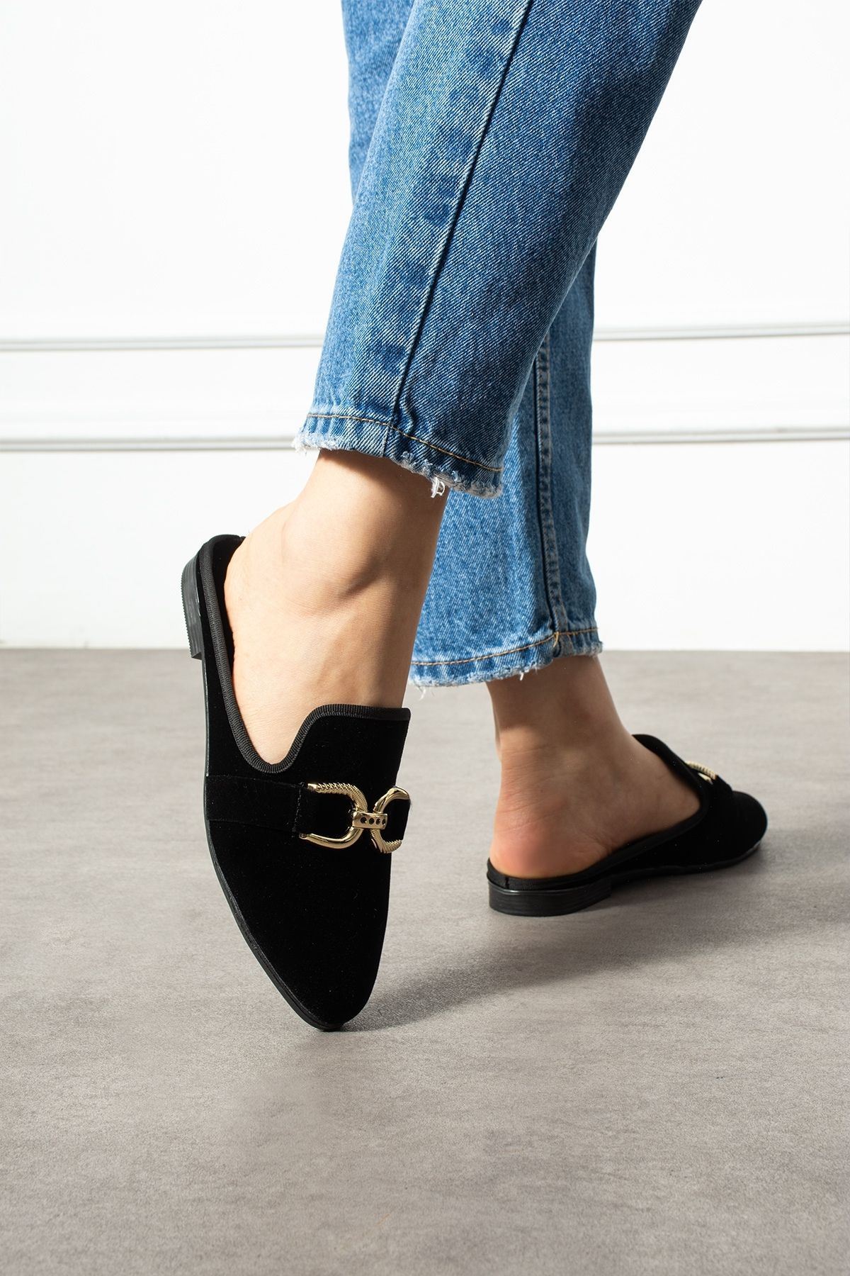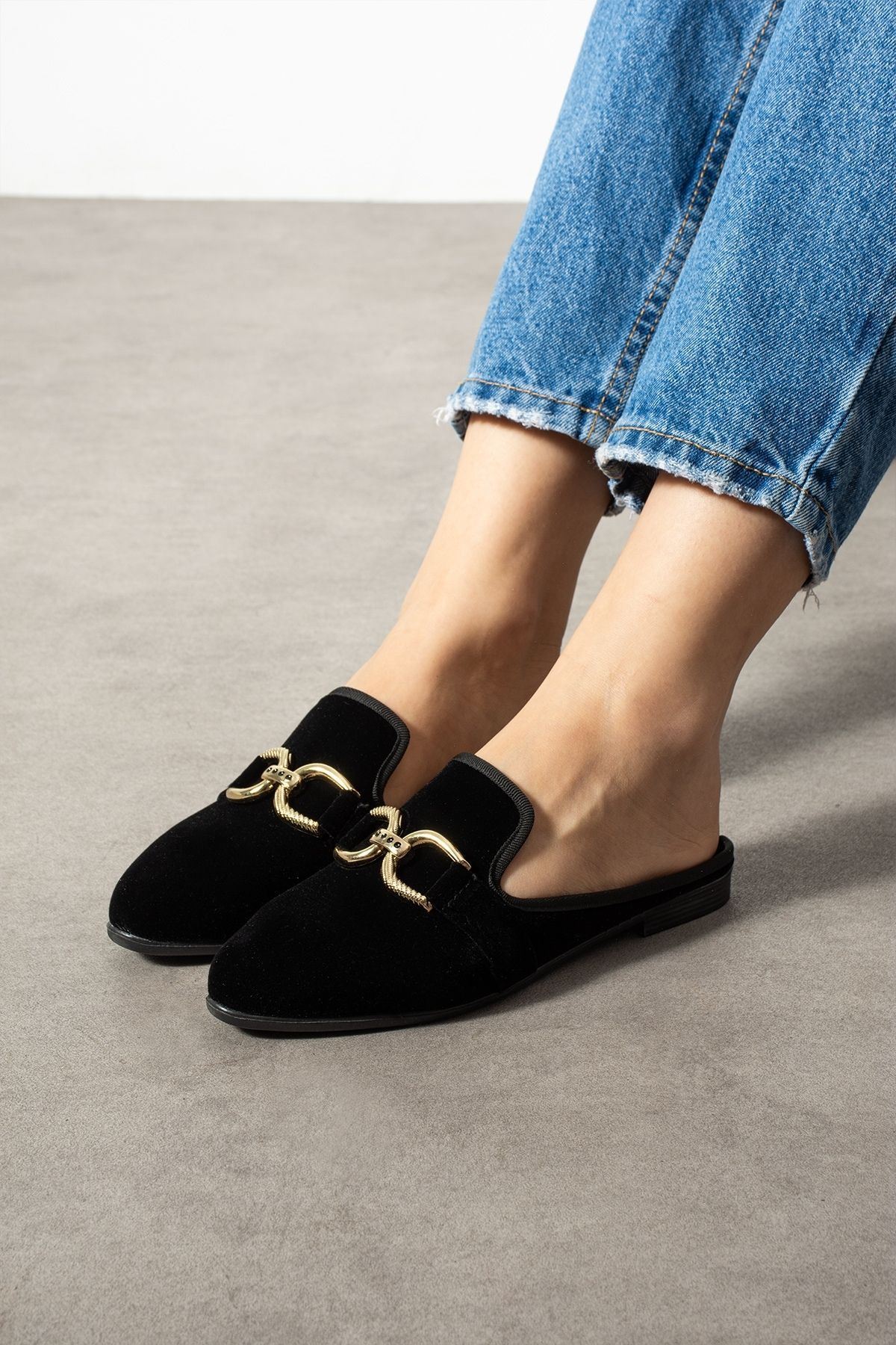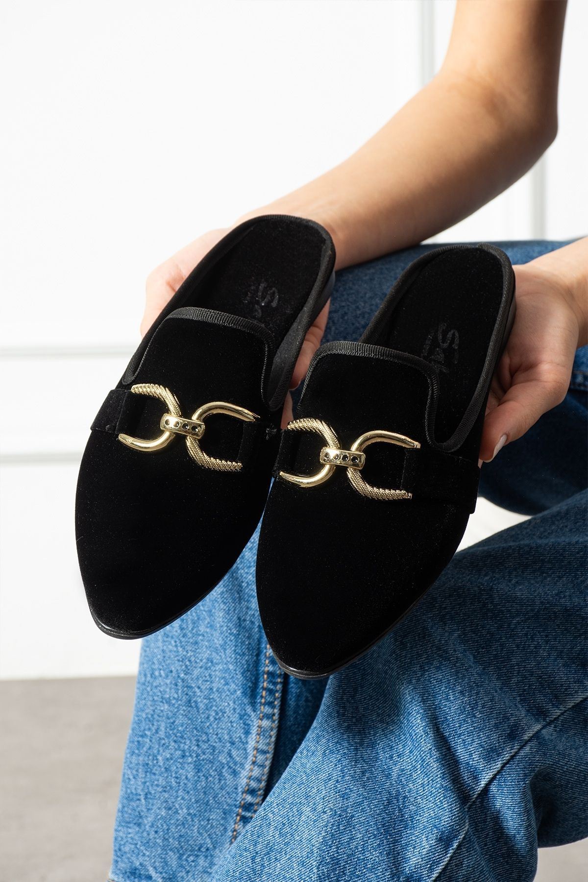 Zayo Siyah Gold Tokalı Kadife Dokulu Elegant Nişan Çeyiz Bohça Misafir Ev Terliği